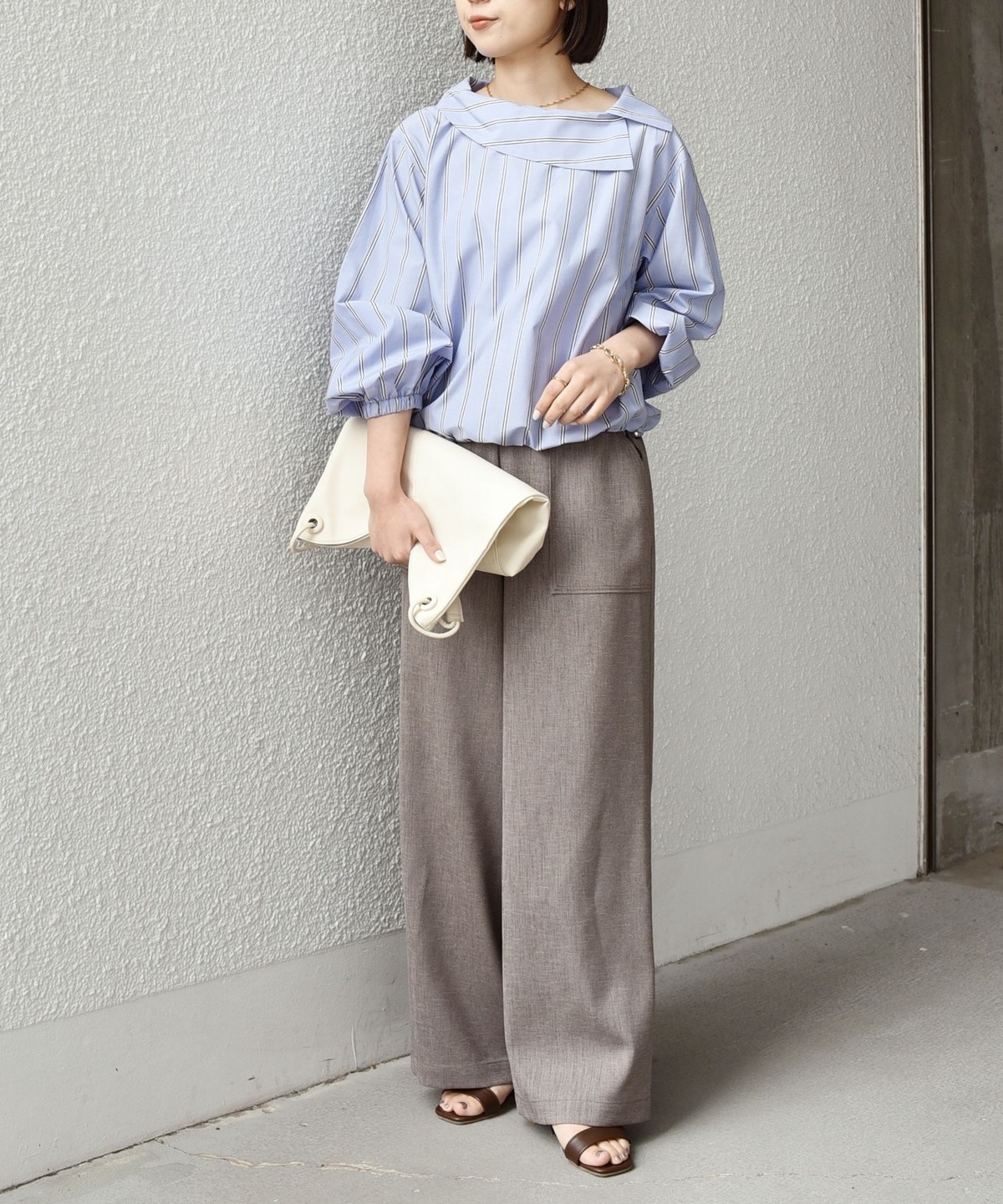 きれいめなスラックス合わせは上品な大人スタイルに。