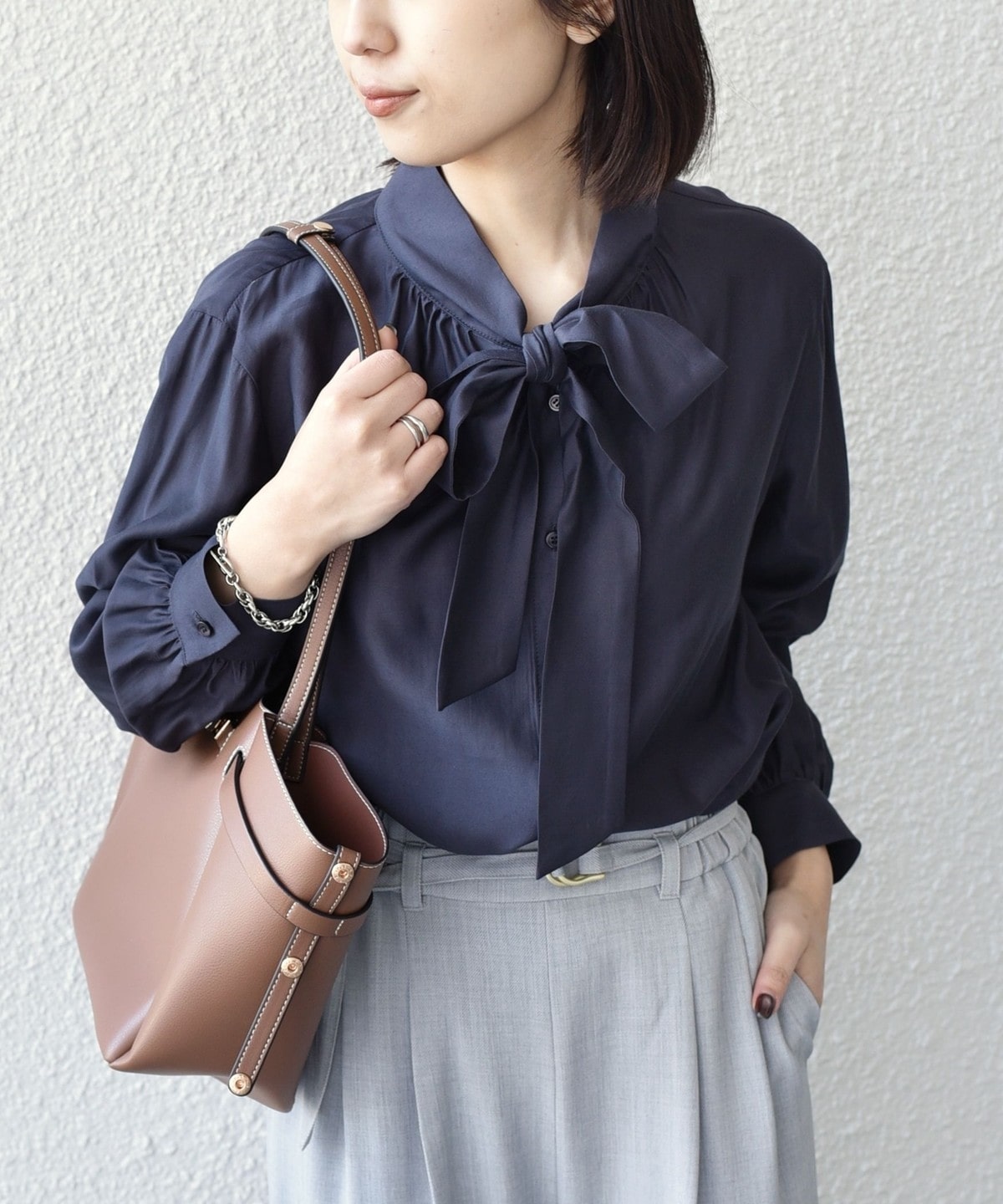 女性らしさと華やかさを引き立てるボウタイシャツ。