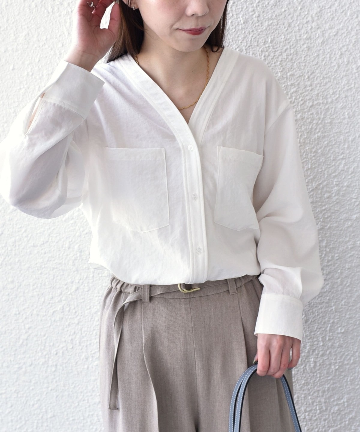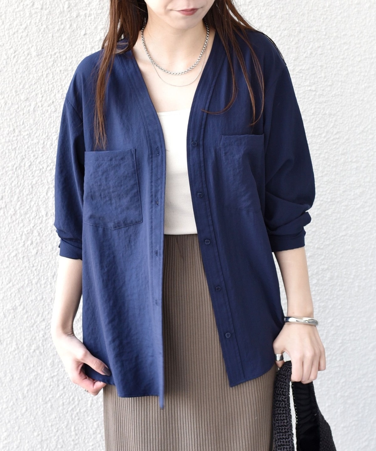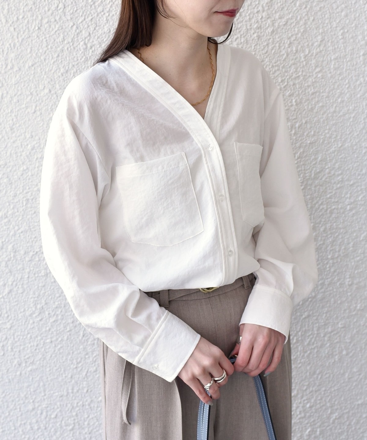羽織としても、ボタンを留めてブラウス感覚でも着用可能なVネックシャツ。