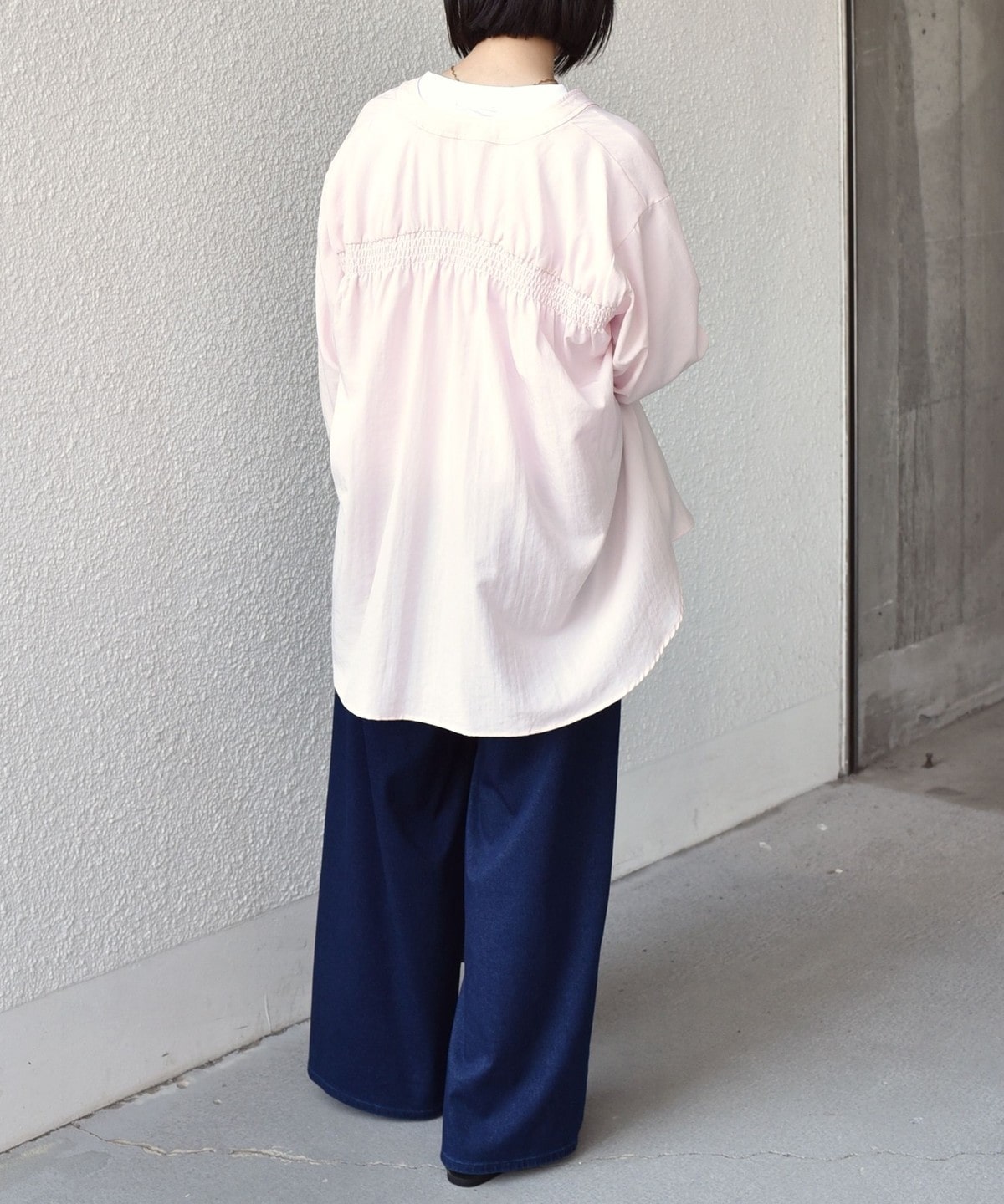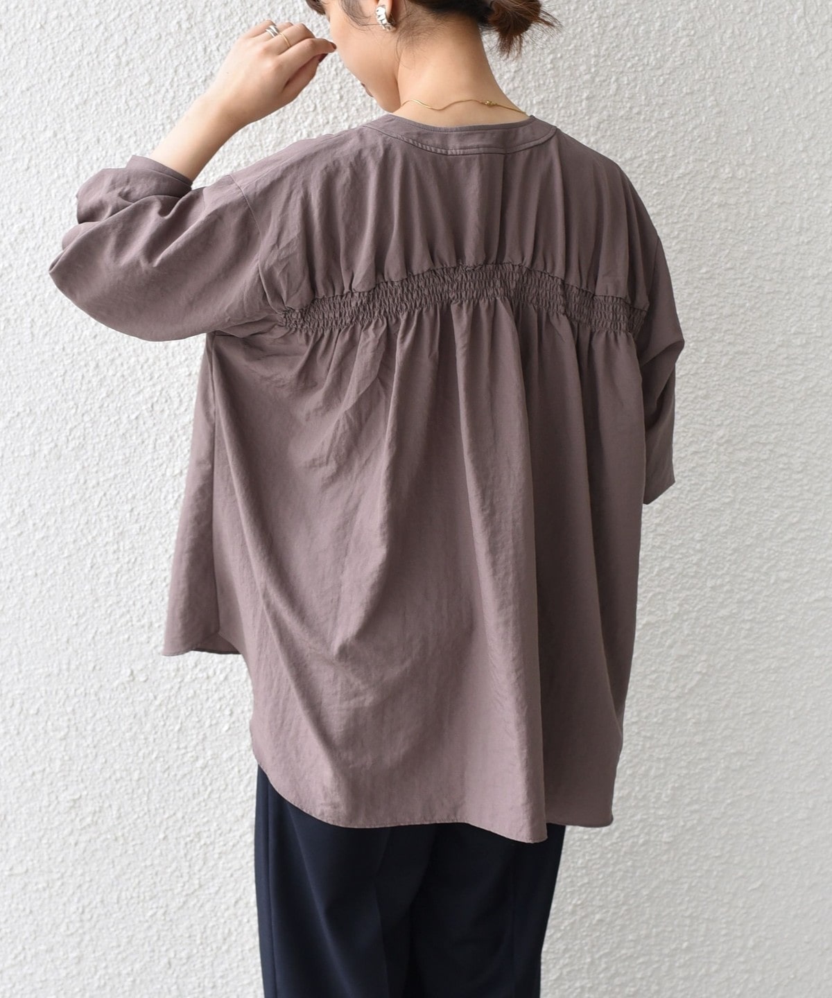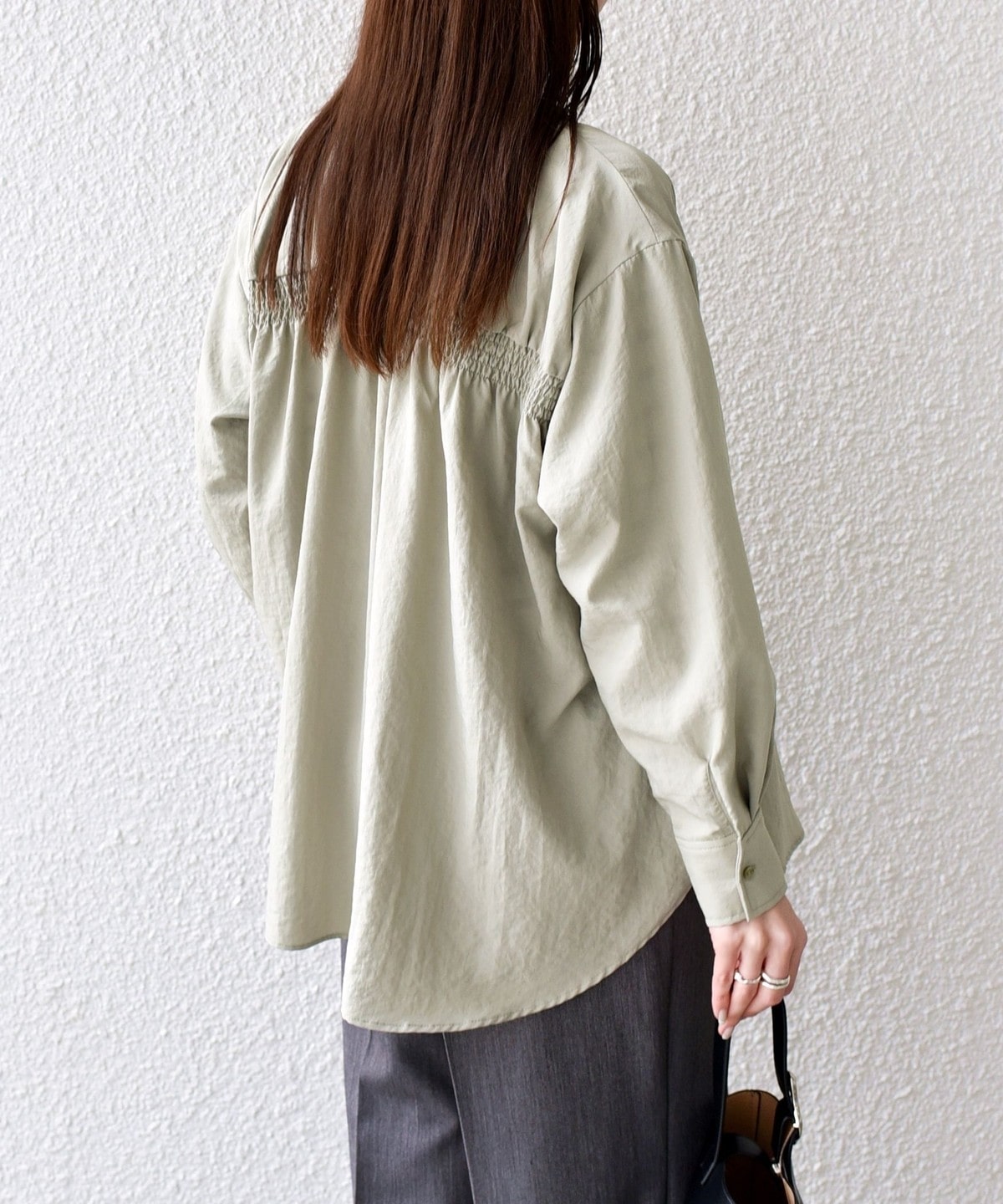 バックにギャザーのデザインが入っているので、ボタンを留めてもシンプルすぎず、様になるデザイン。