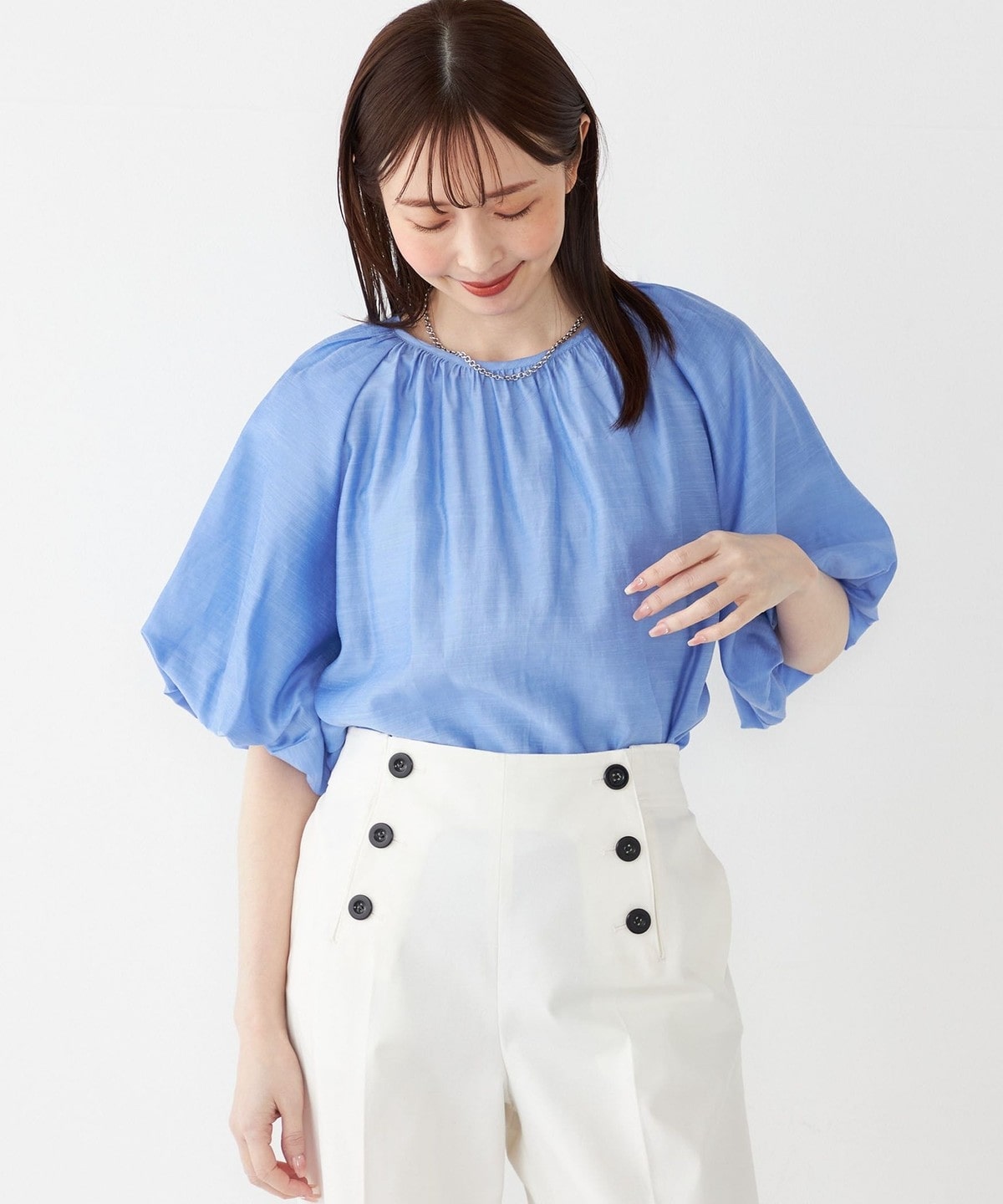 光沢のあるスラブ素材が綺麗めな印象で、やや透け感のある素材が女性らしく上品に合わせられる1枚。