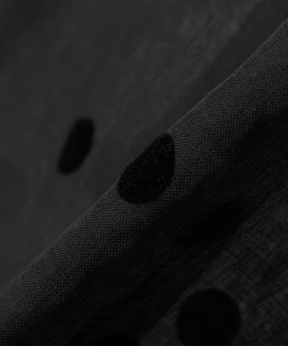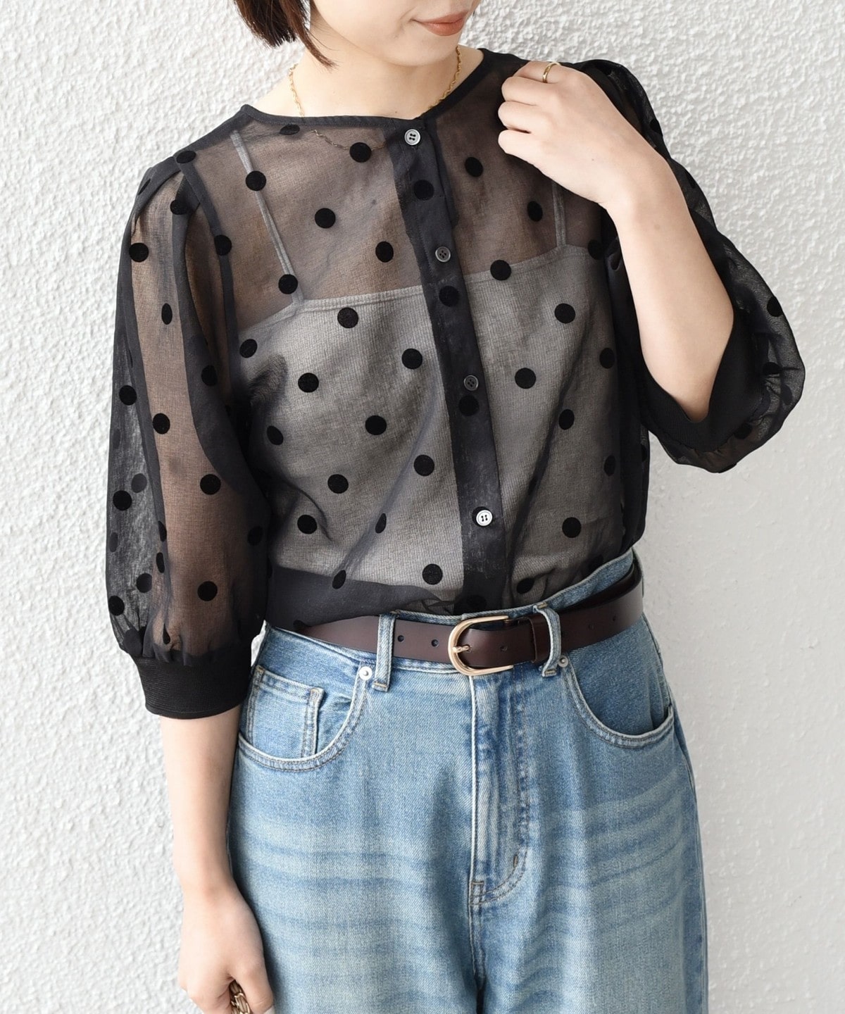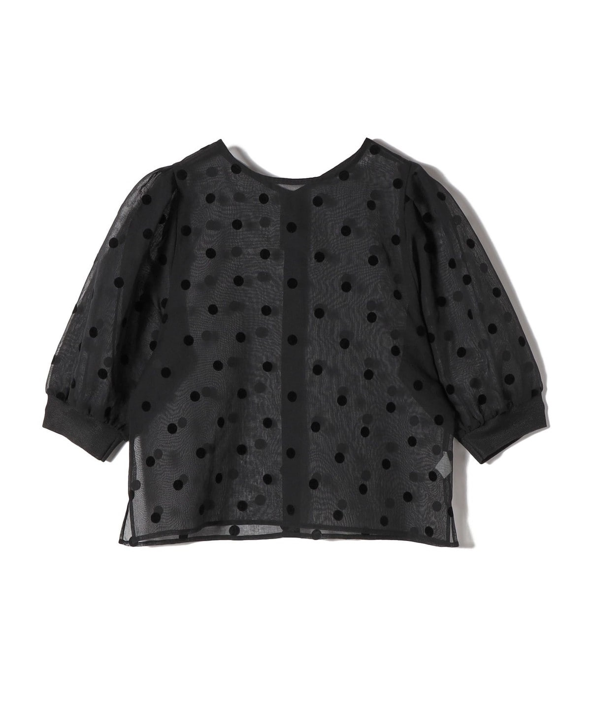 フロッキー加工のドットがプリントされた5分袖のシアーブラウス。