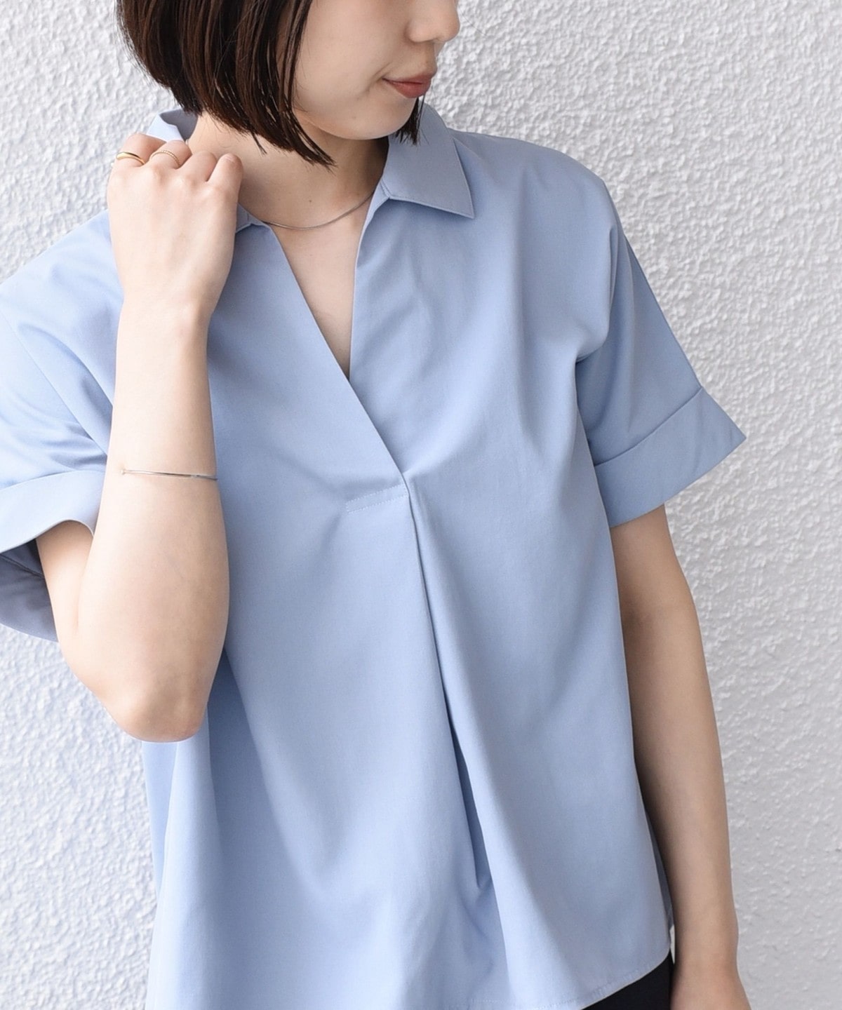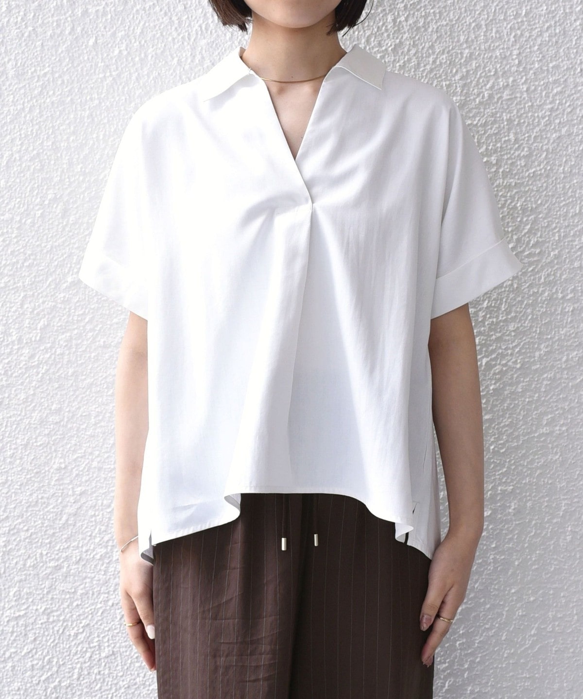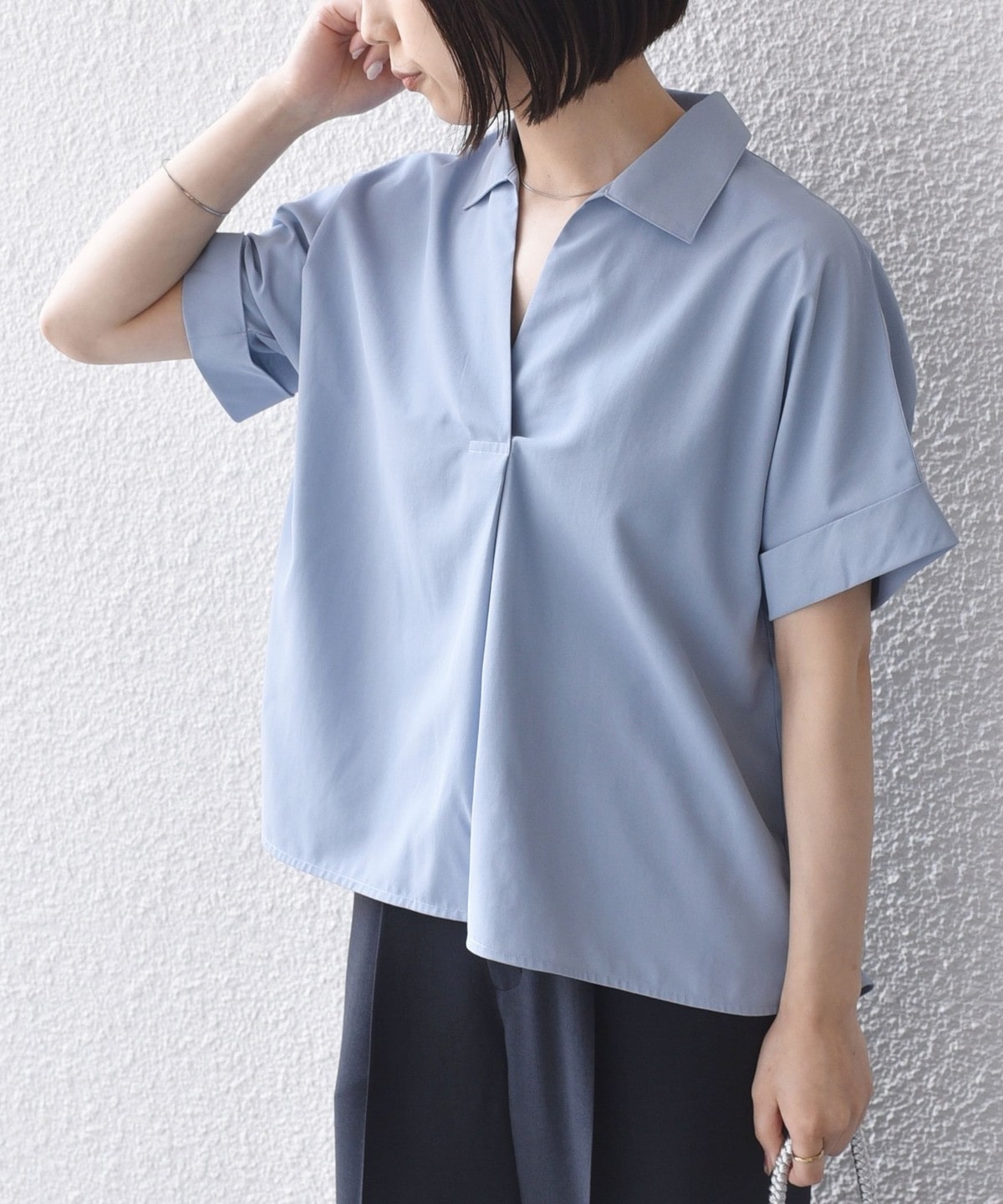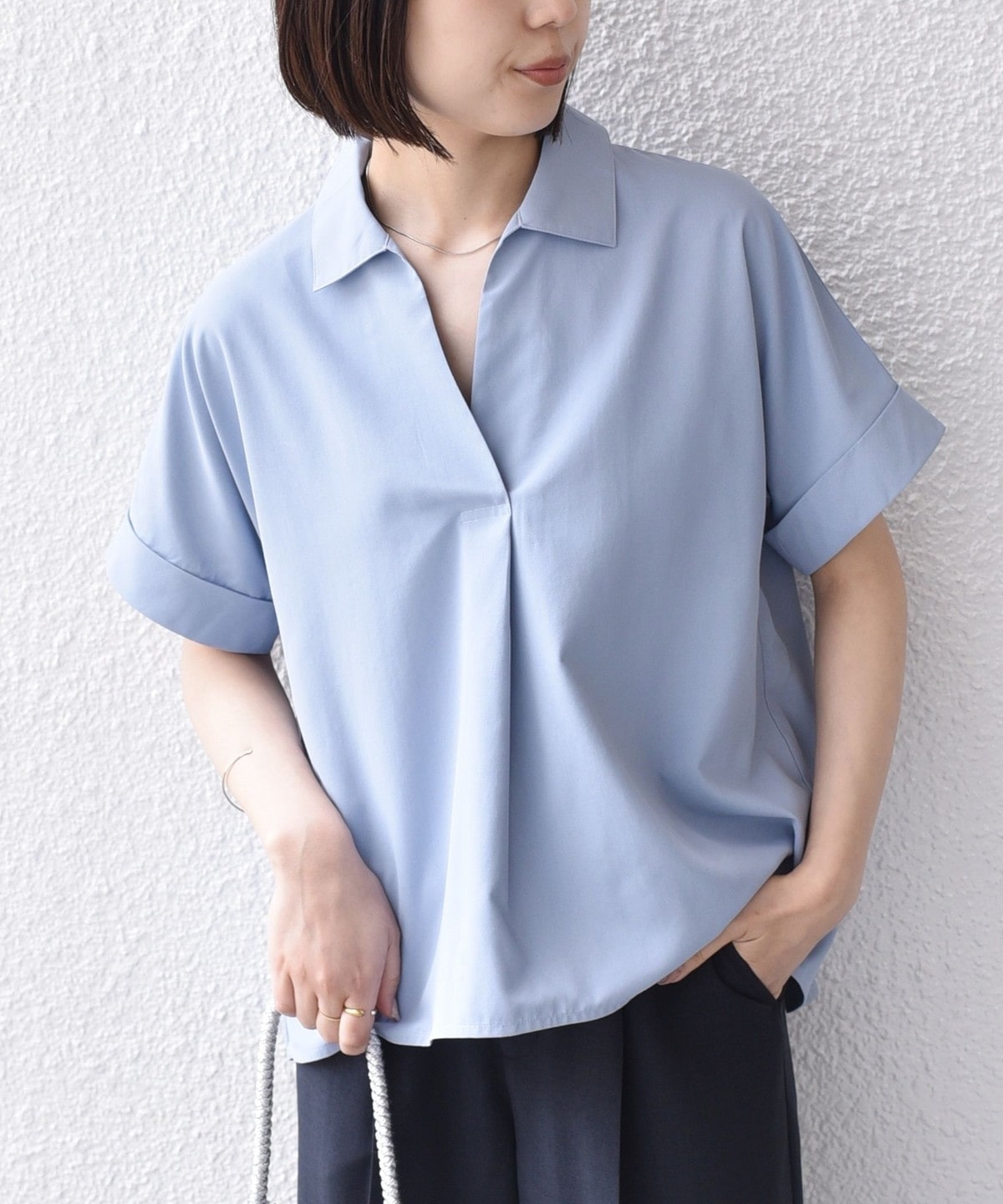 スキッパーデザインと、着ると丸みのあるシルエットがポイントのシャツ。