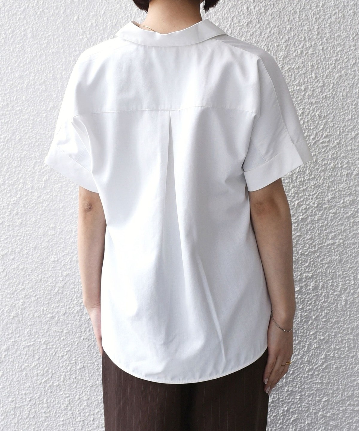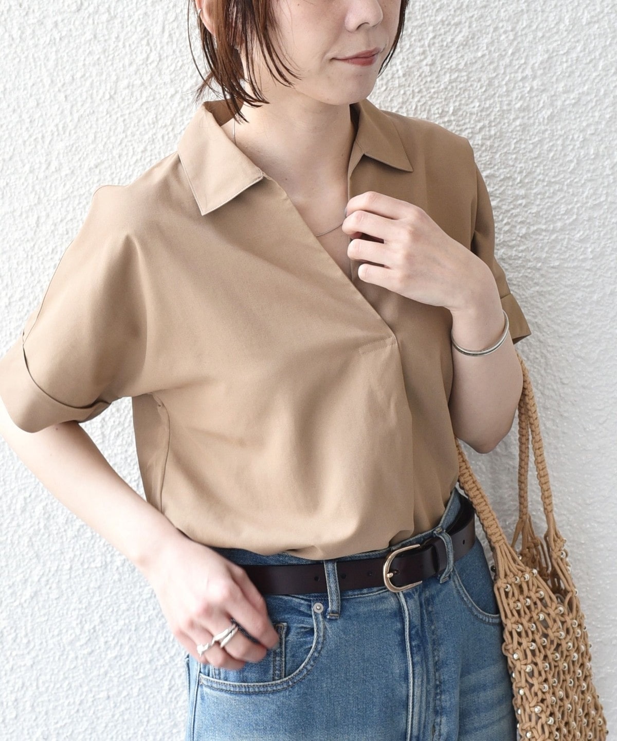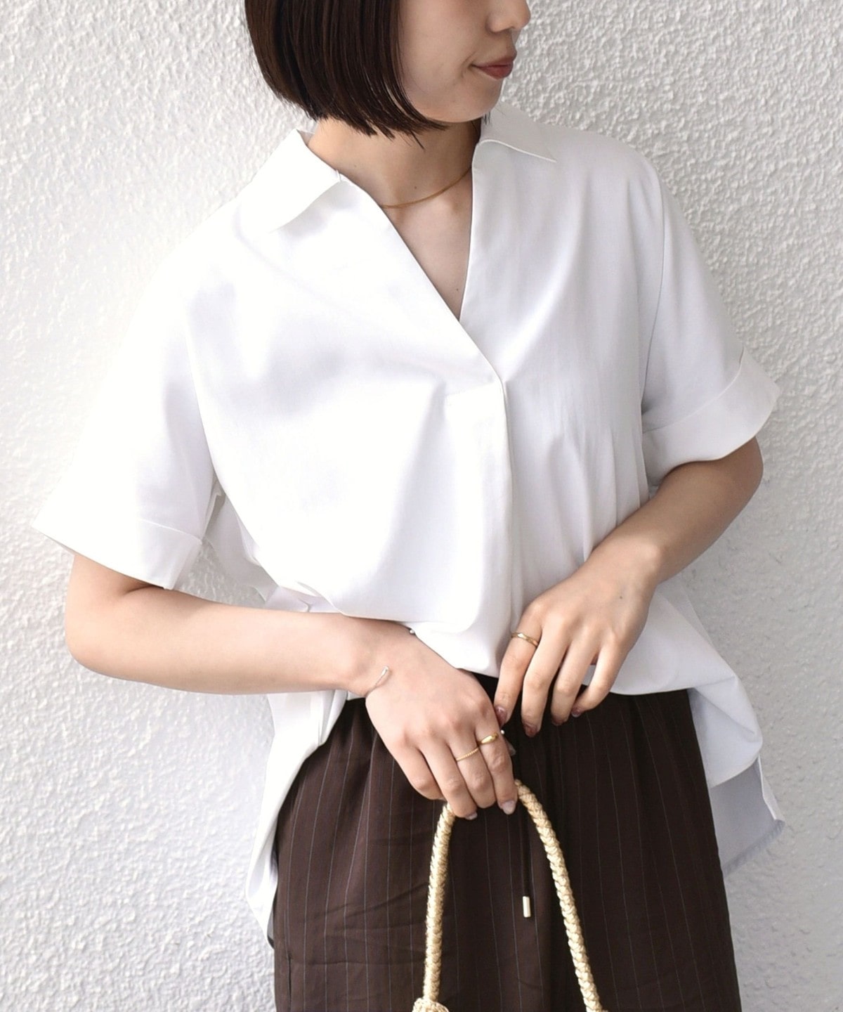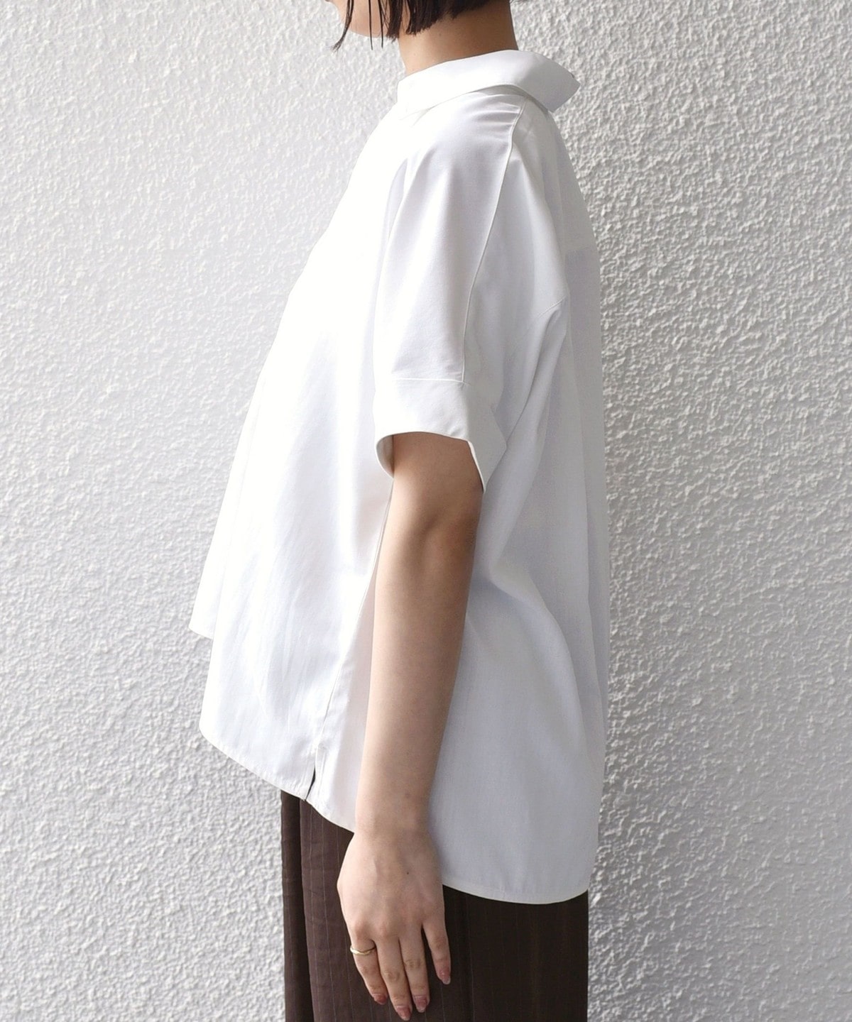スキッパーデザインと、着ると丸みのあるシルエットがポイントのシャツ。