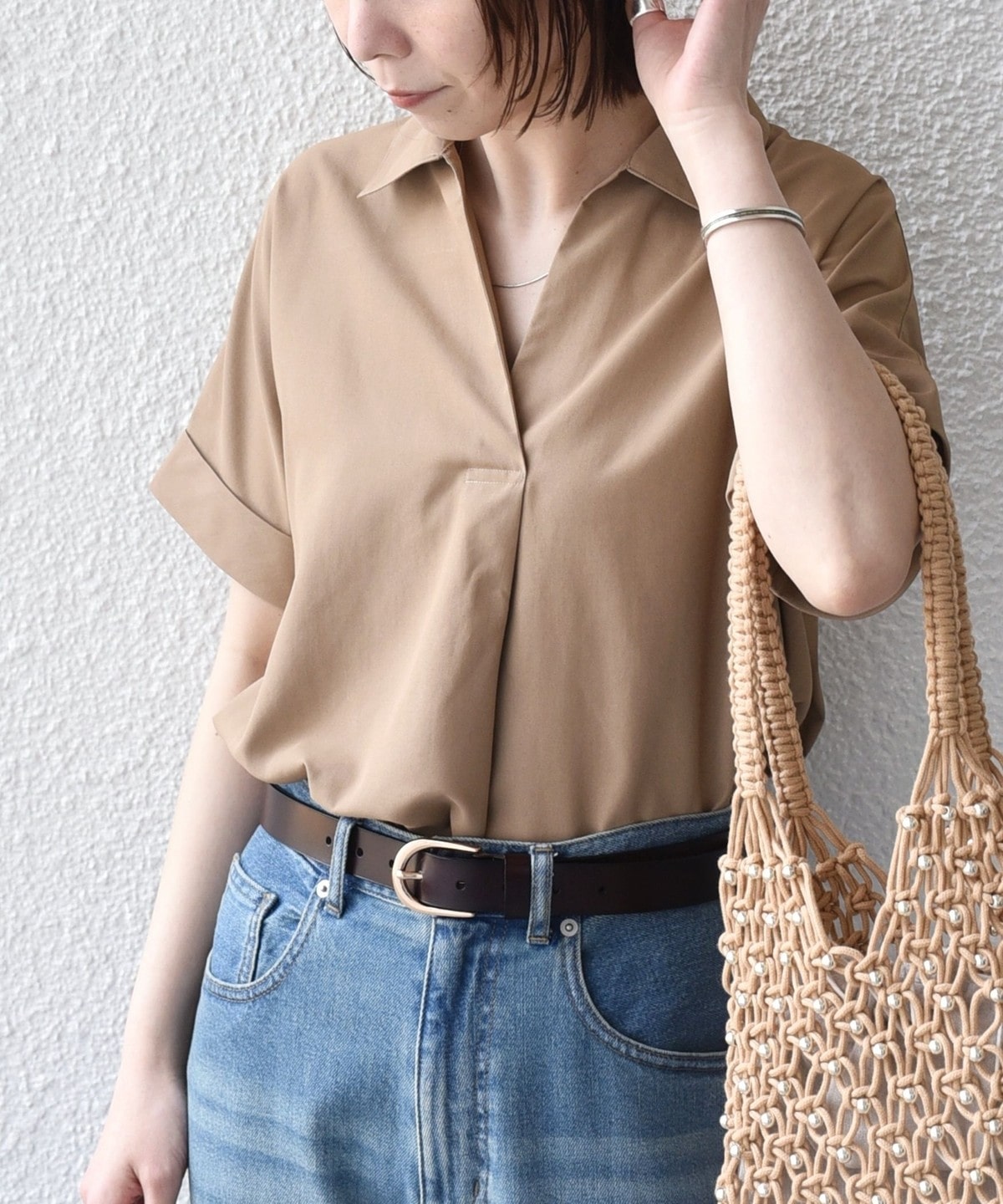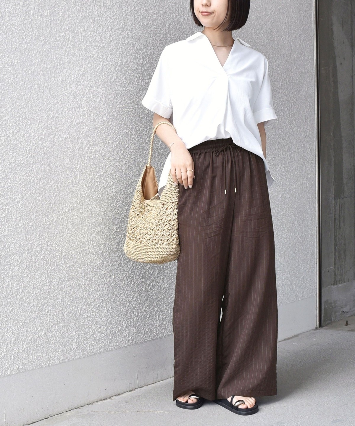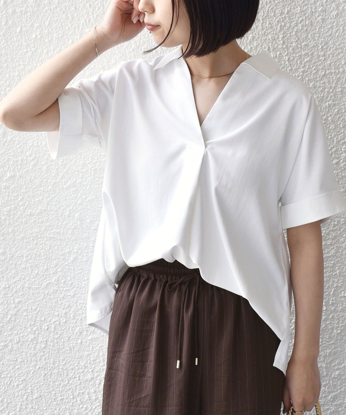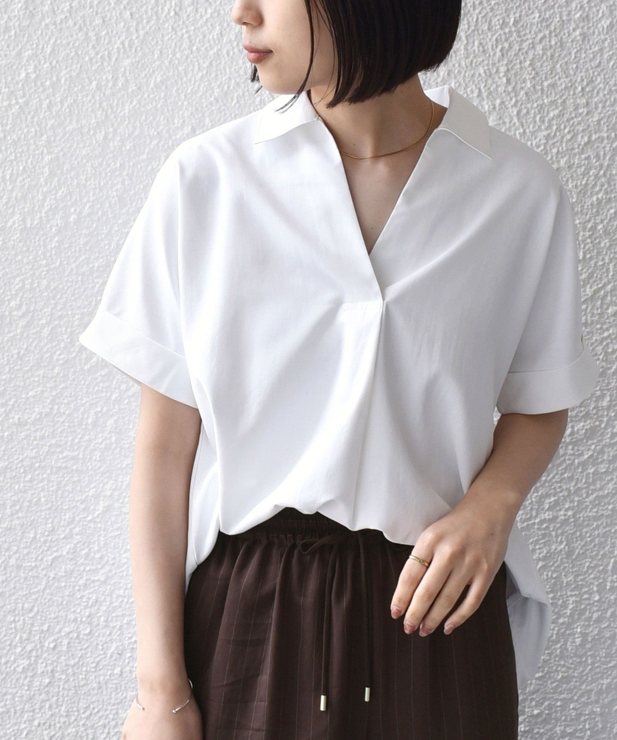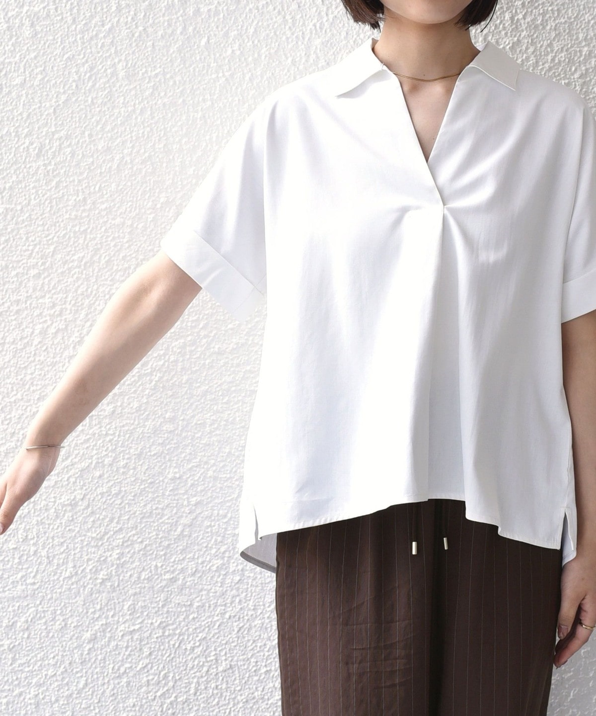 リネンパンツやイージーパンツと合わせ、スキッパーデザインの抜け感を活かしたリラックススタイルがおすすめです。