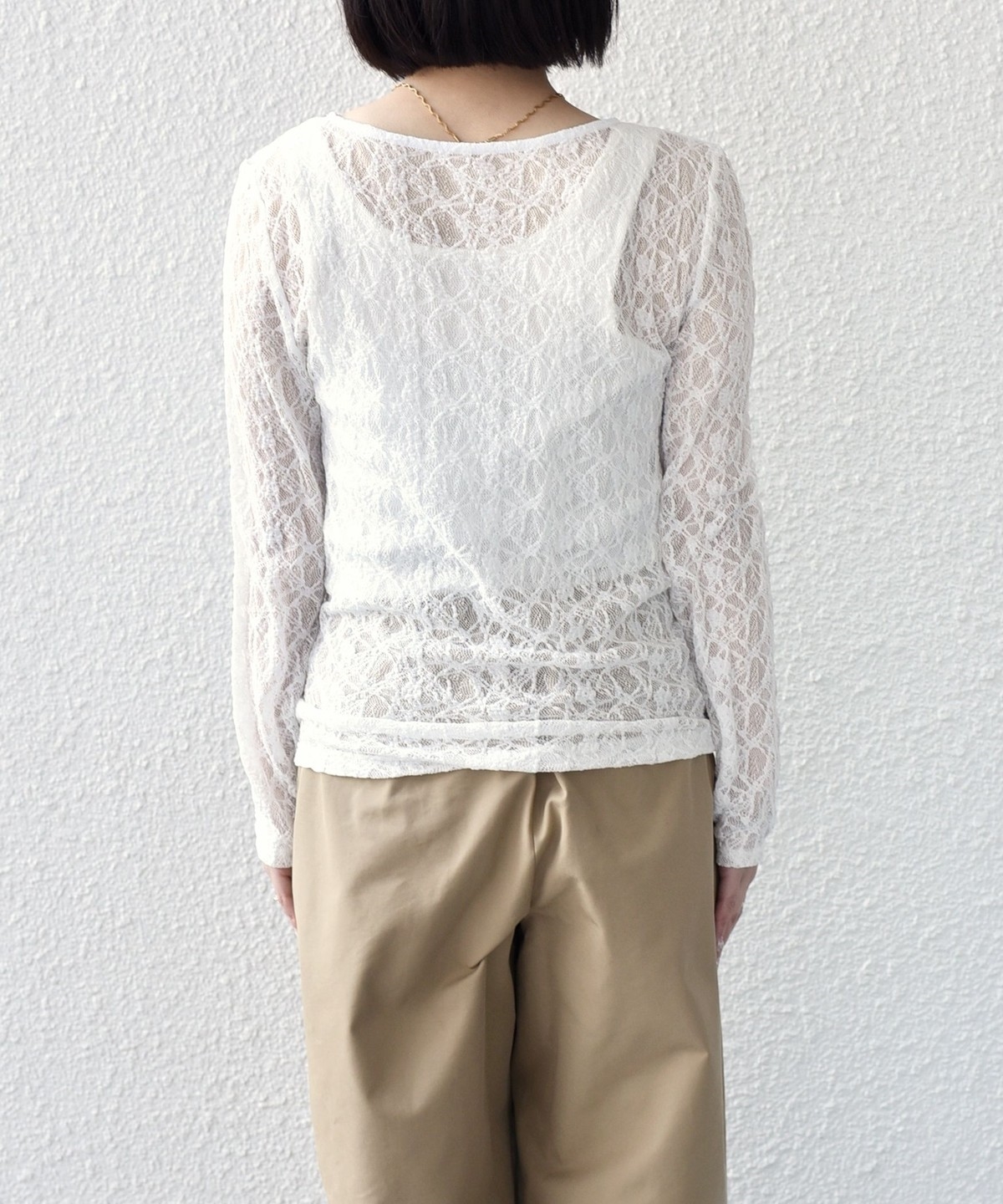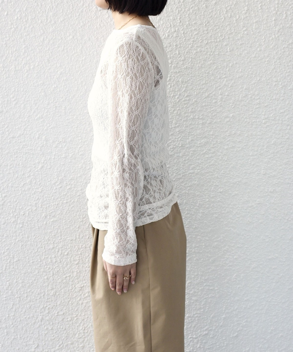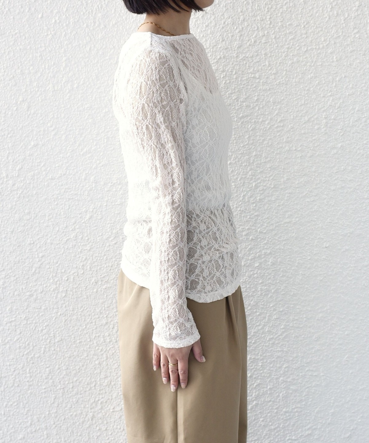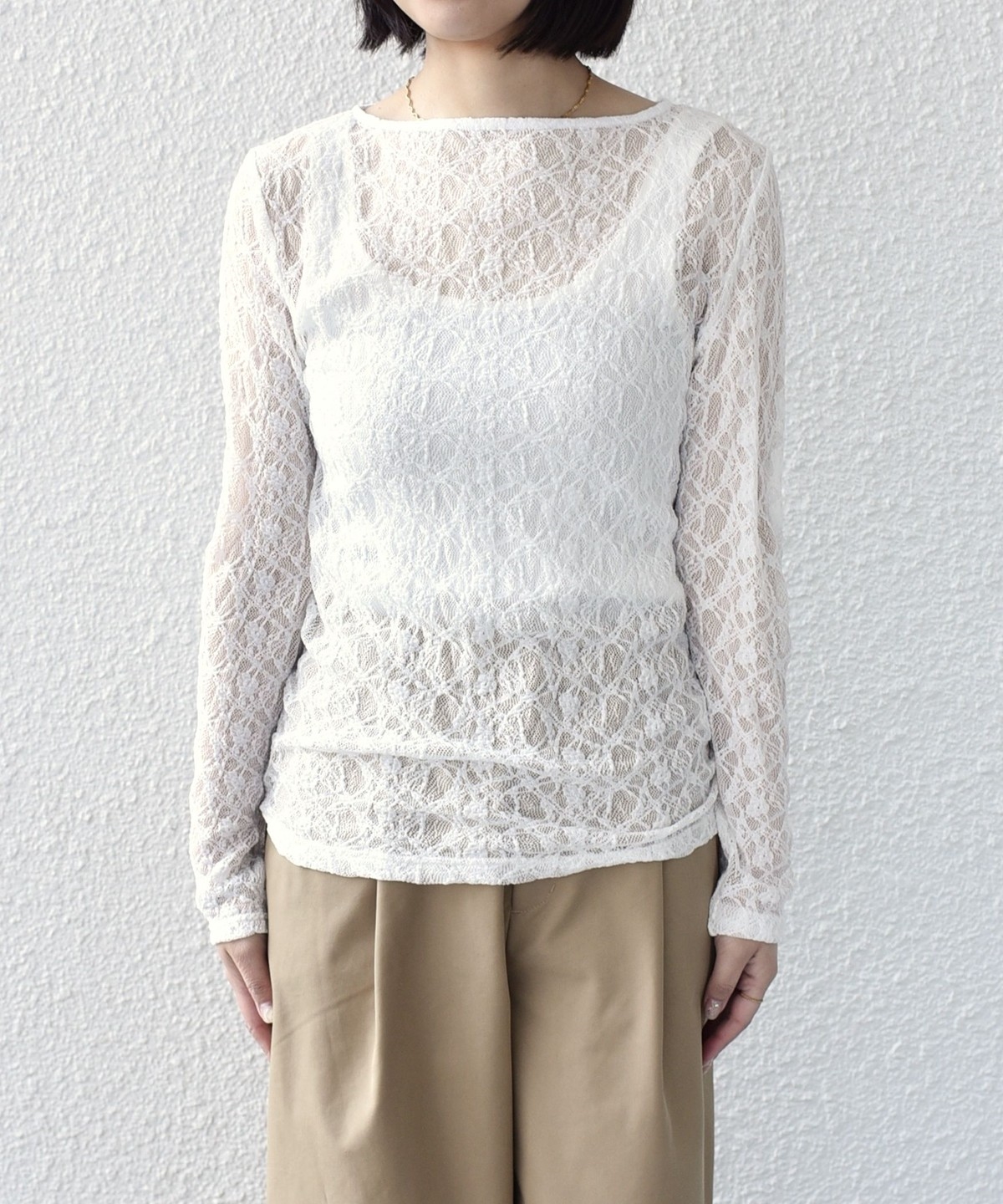 ボートネックが程よい抜け感を演出し、総レースながら甘くなりすぎないデザインに仕上げました。