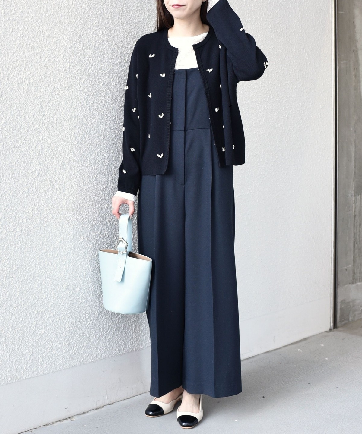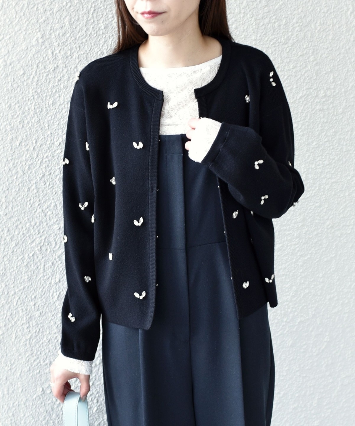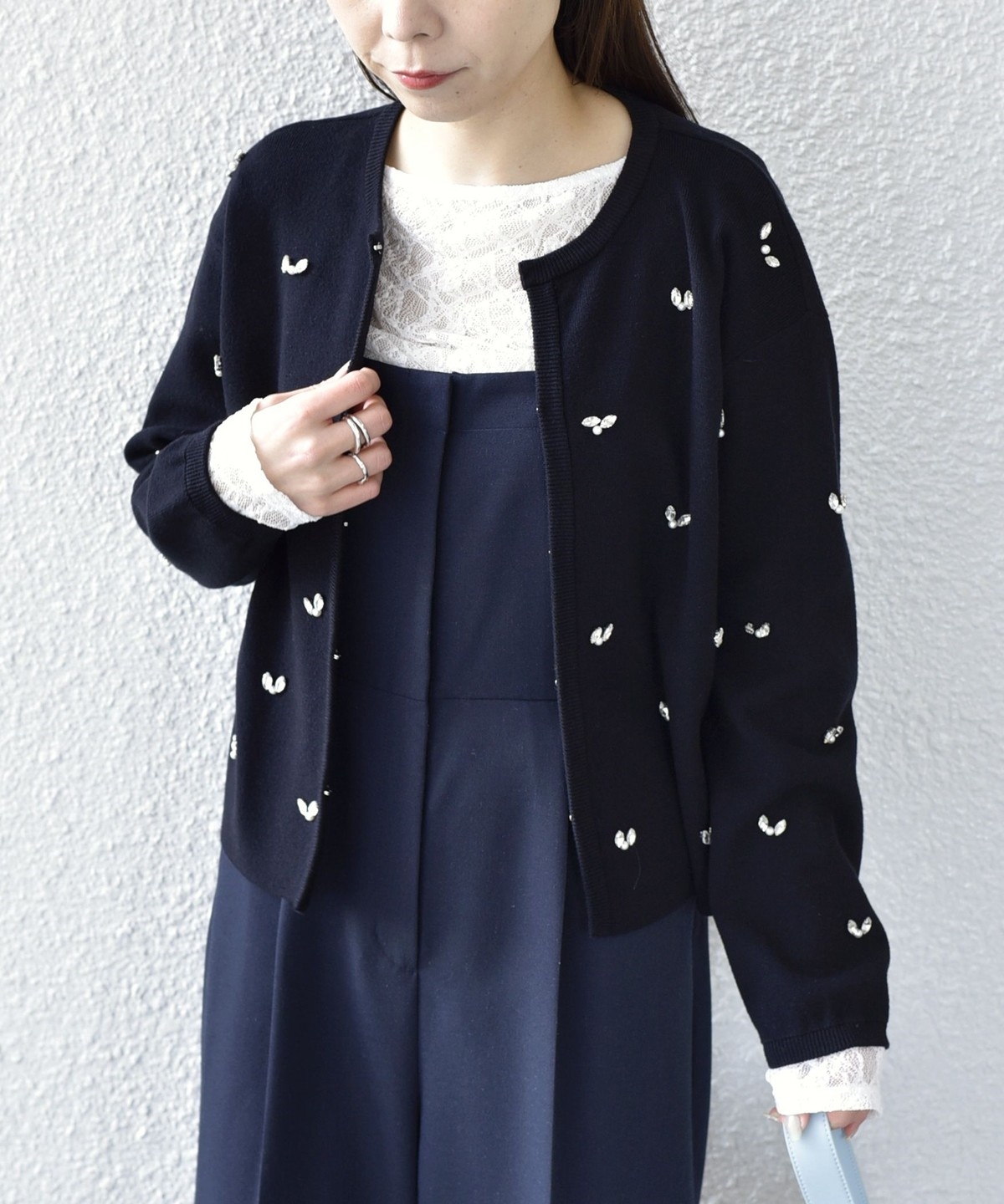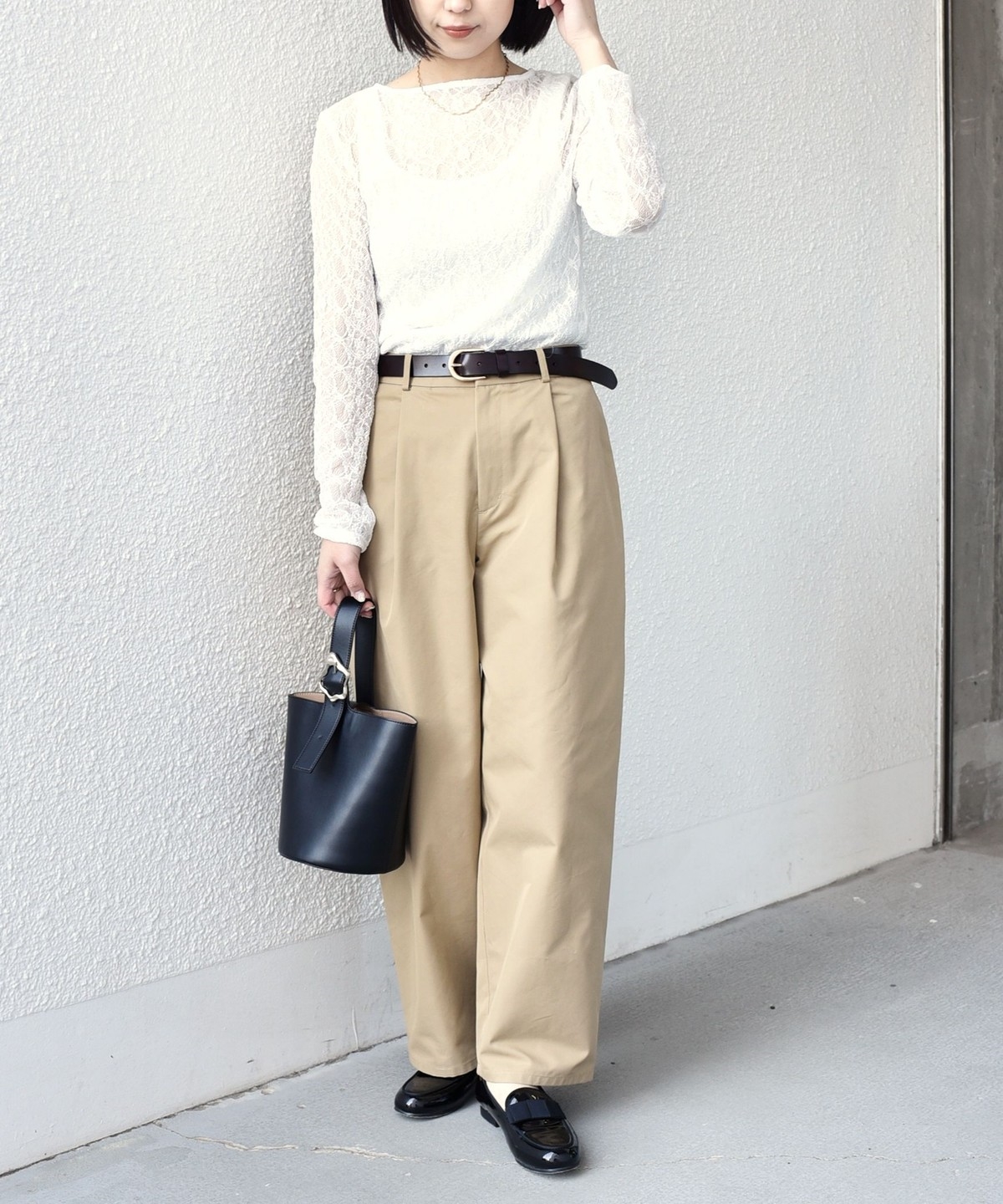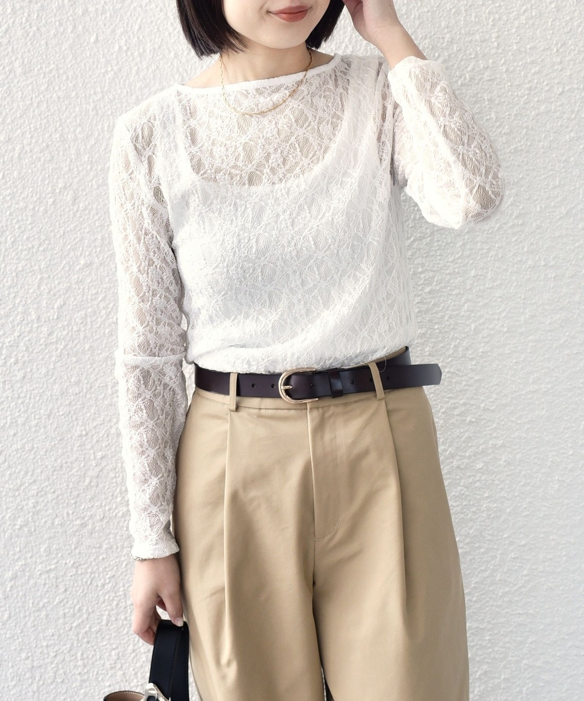 ボートネックが程よい抜け感を演出し、総レースながら甘くなりすぎないデザインに仕上げました。