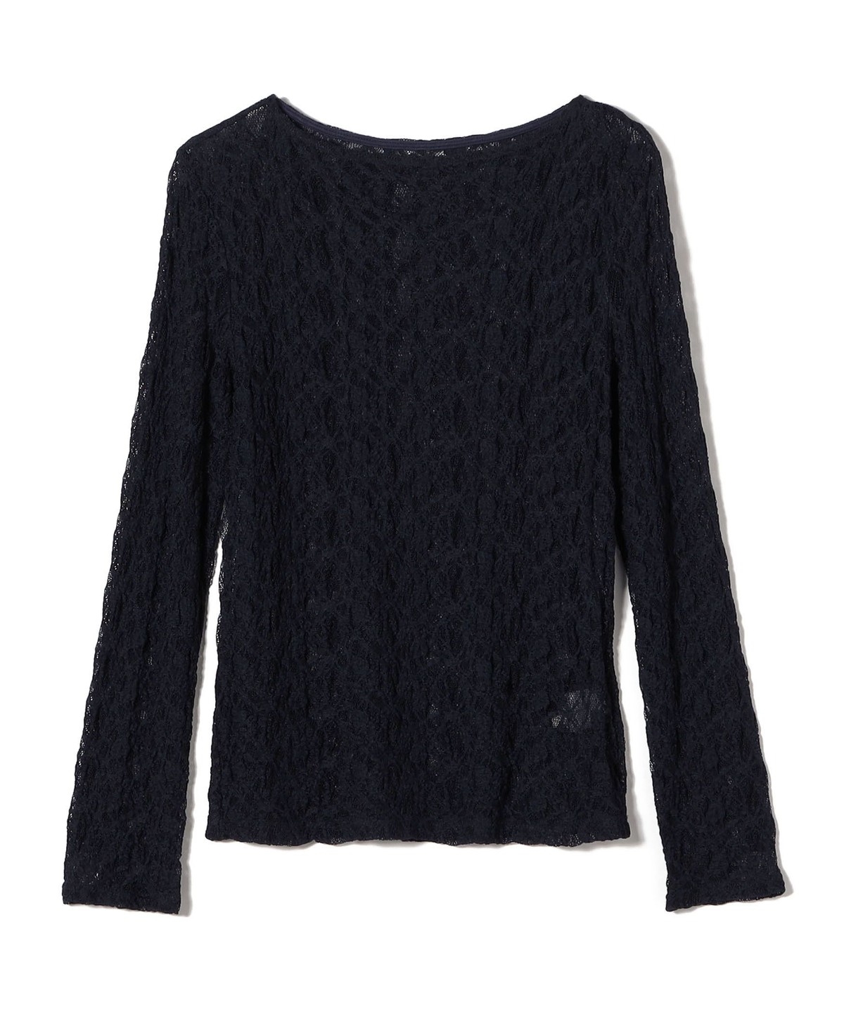 細かな柄のストレッチレースを使用したボートネックトップス。
