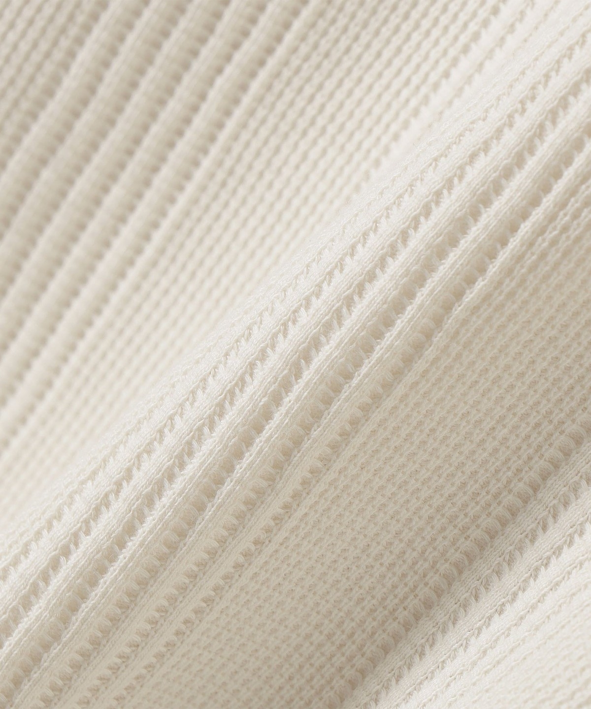 変形ワッフル素材を使用した、ヘンリーネックトップス。