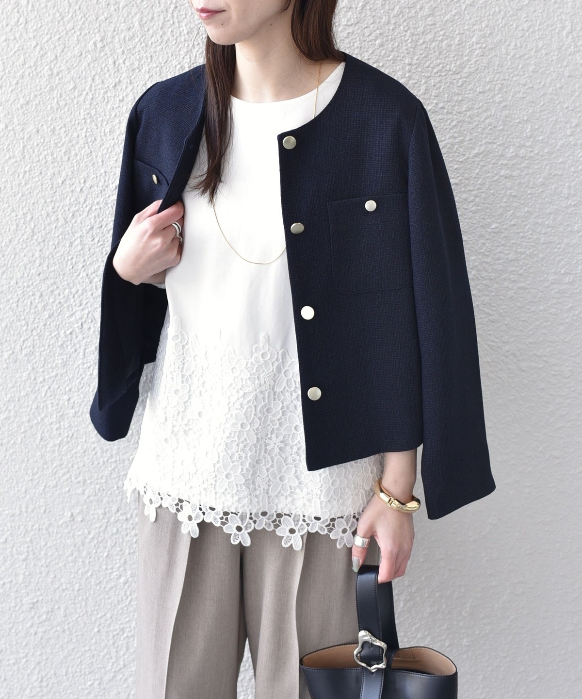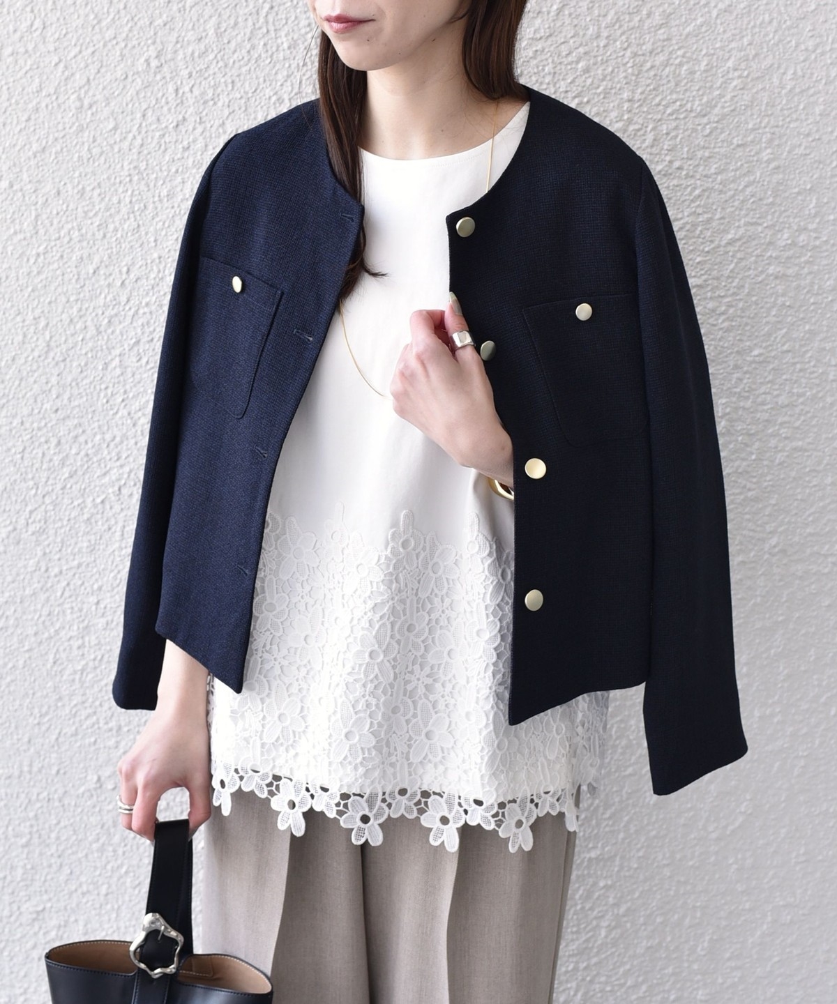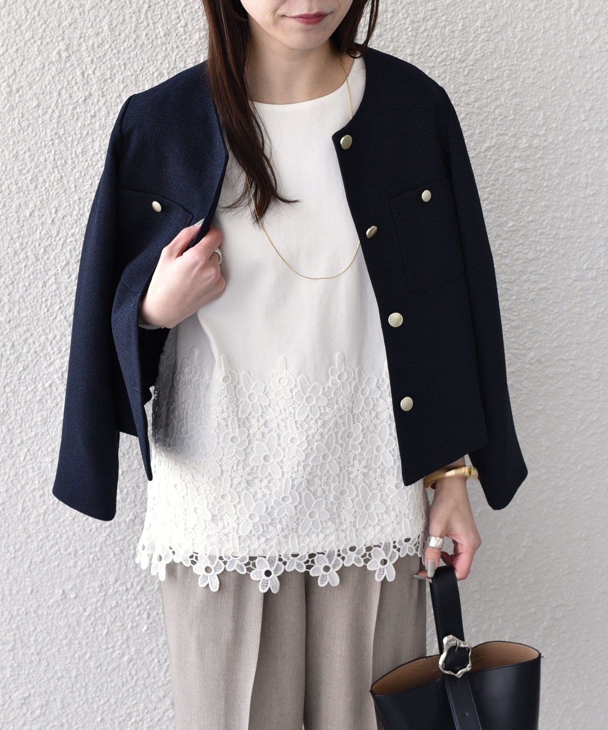 腰回りが隠れる安心感のある着丈で、デイリーコーデにも取り入れやすく、ハリのある質感が大人の上品さも演出してくれます。