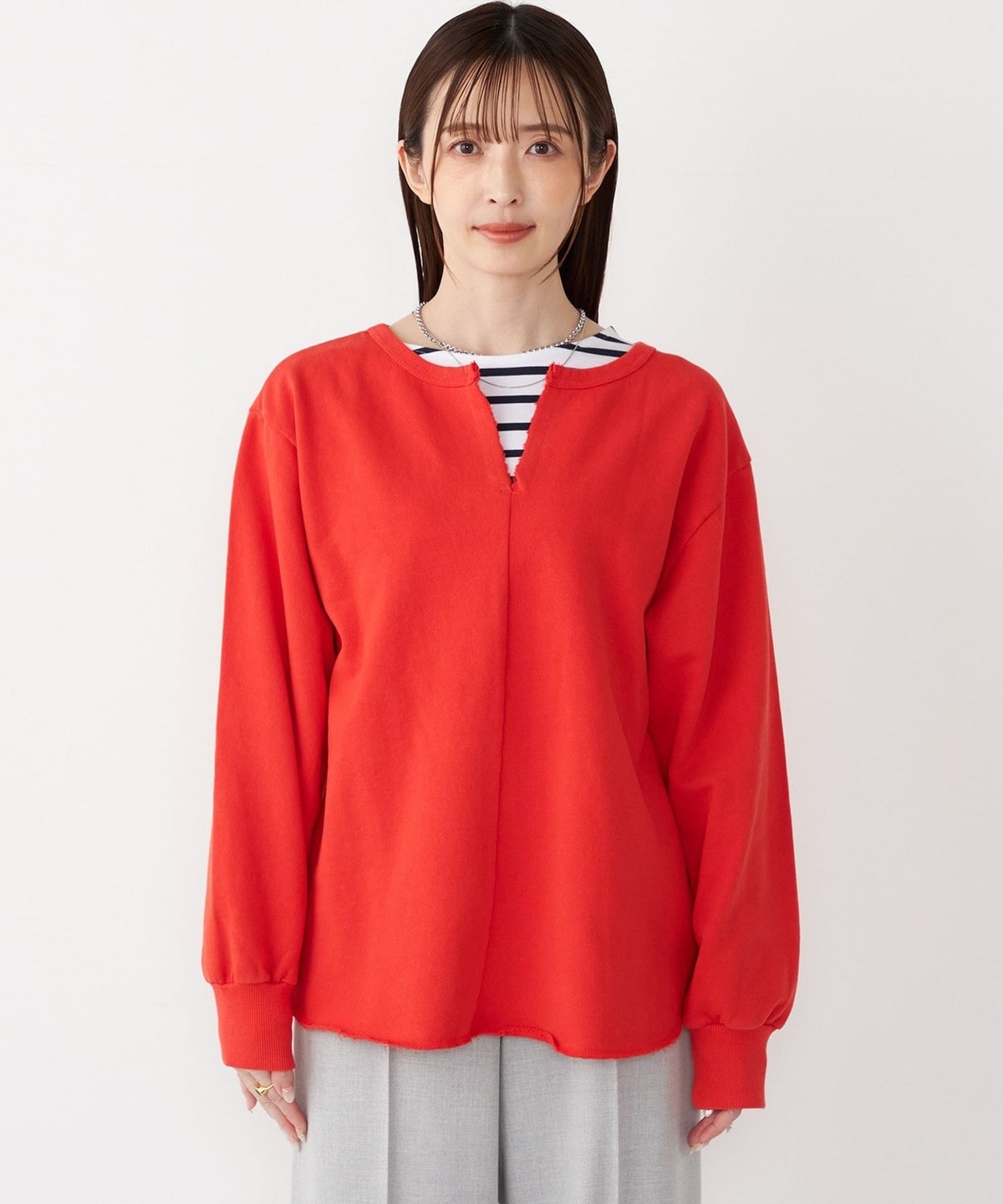 首元はスキッパータイプで顔周りをすっきりと見せ、女性らしい抜け感を演出します。