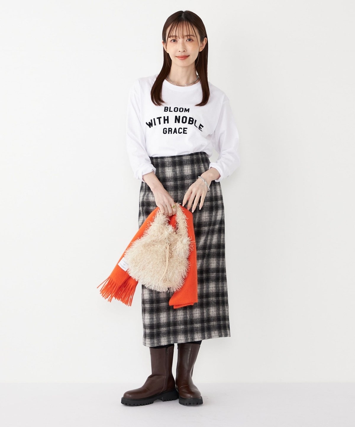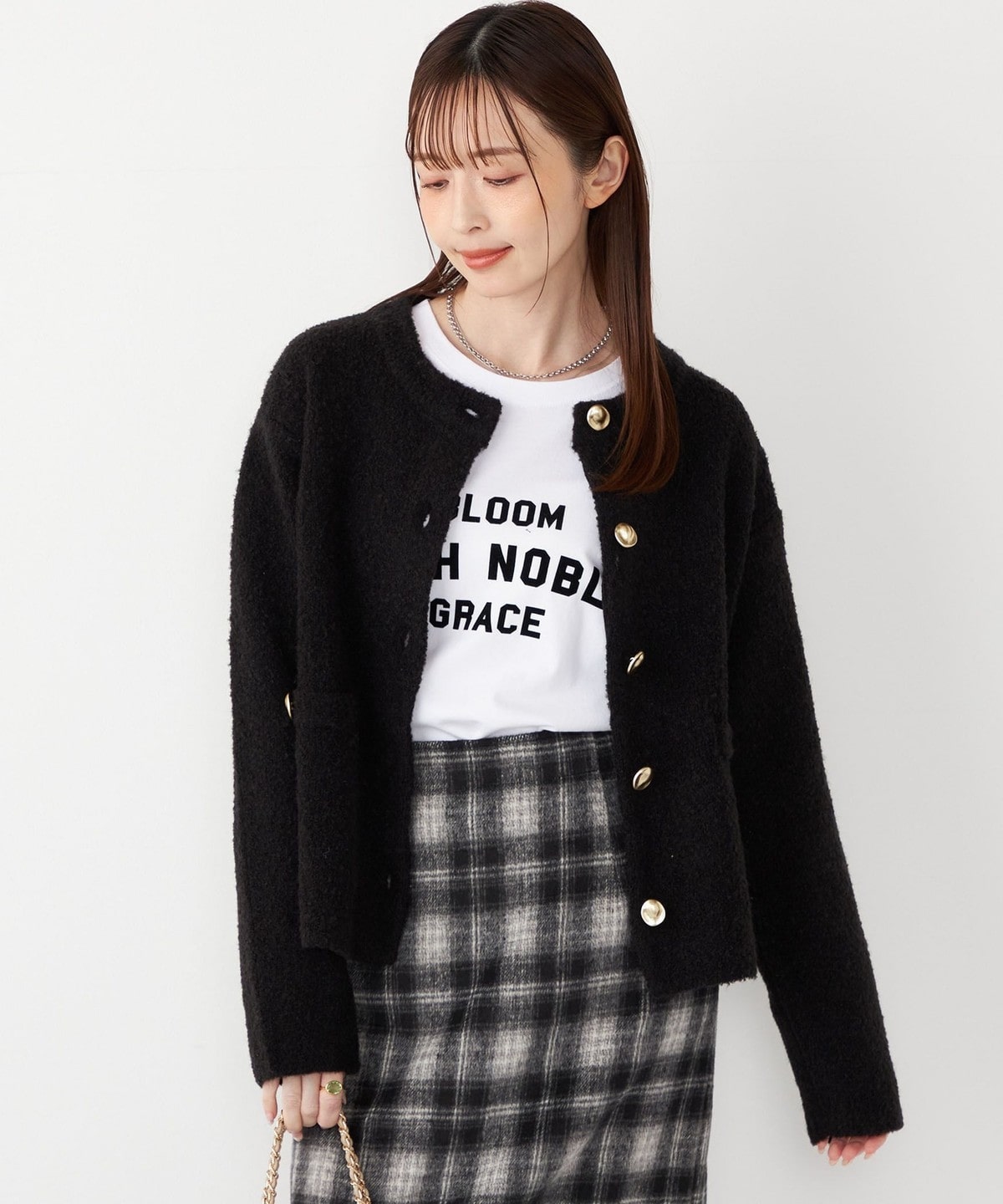 スカートにタックインして合わせていただくと、カジュアルすぎない大人の着こなしに。