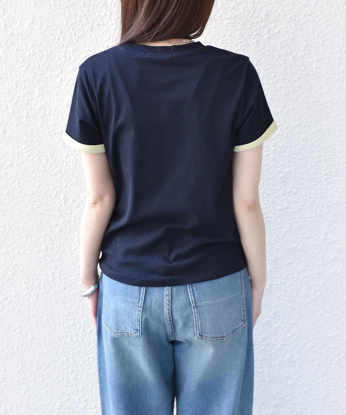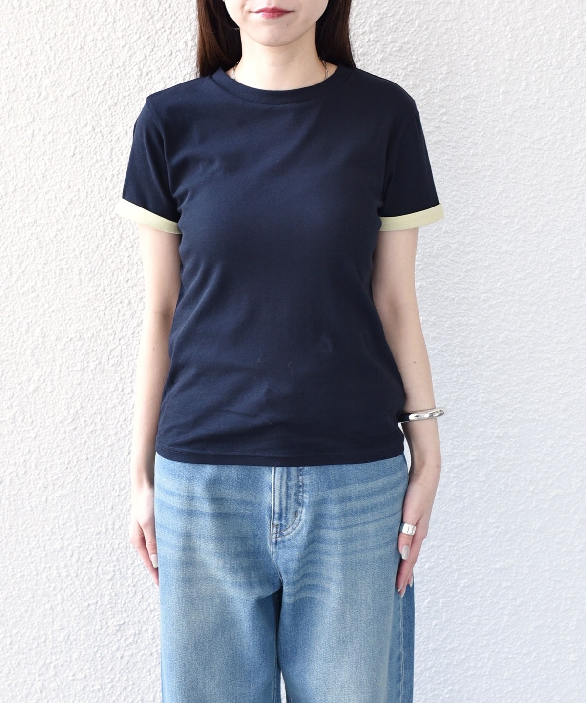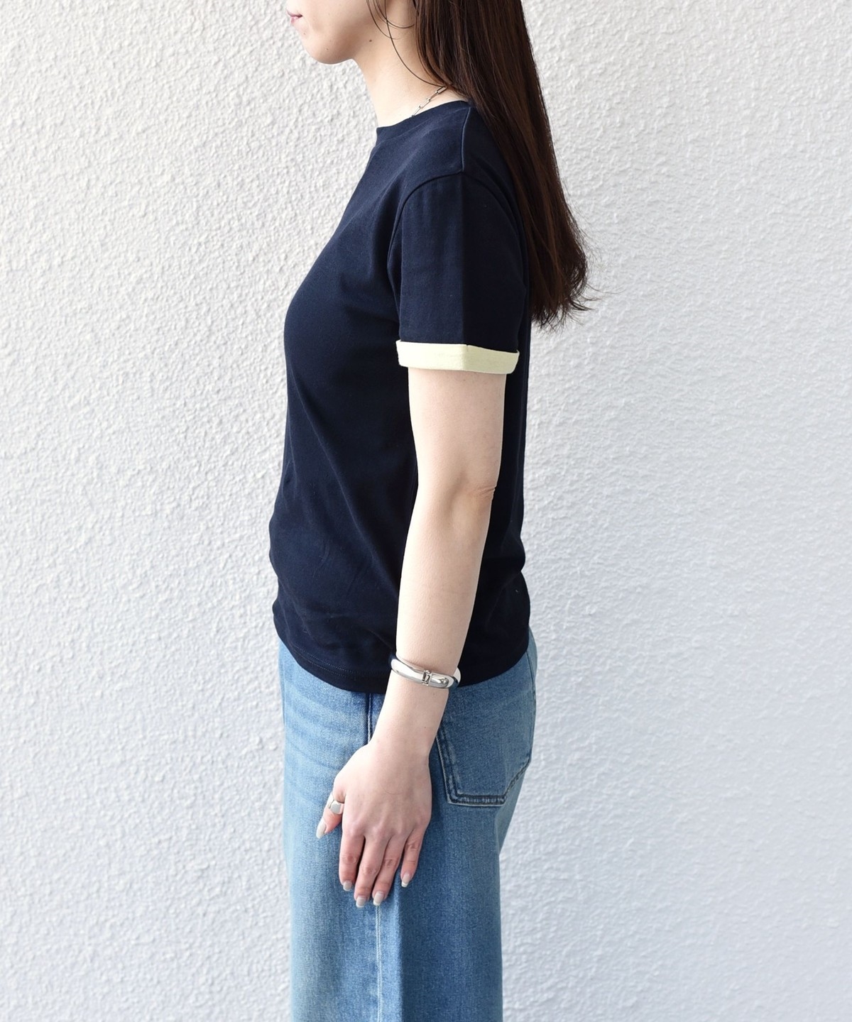 シンプルながら、バイカラーの袖口がアクセントになったシアーTシャツ。