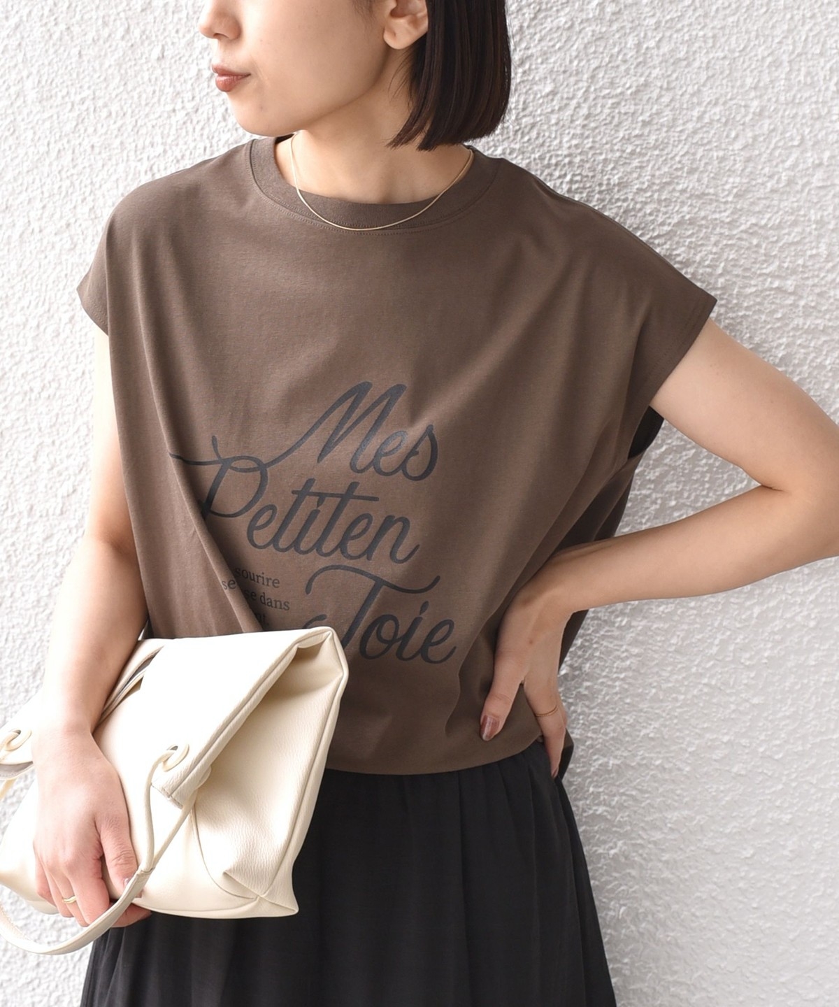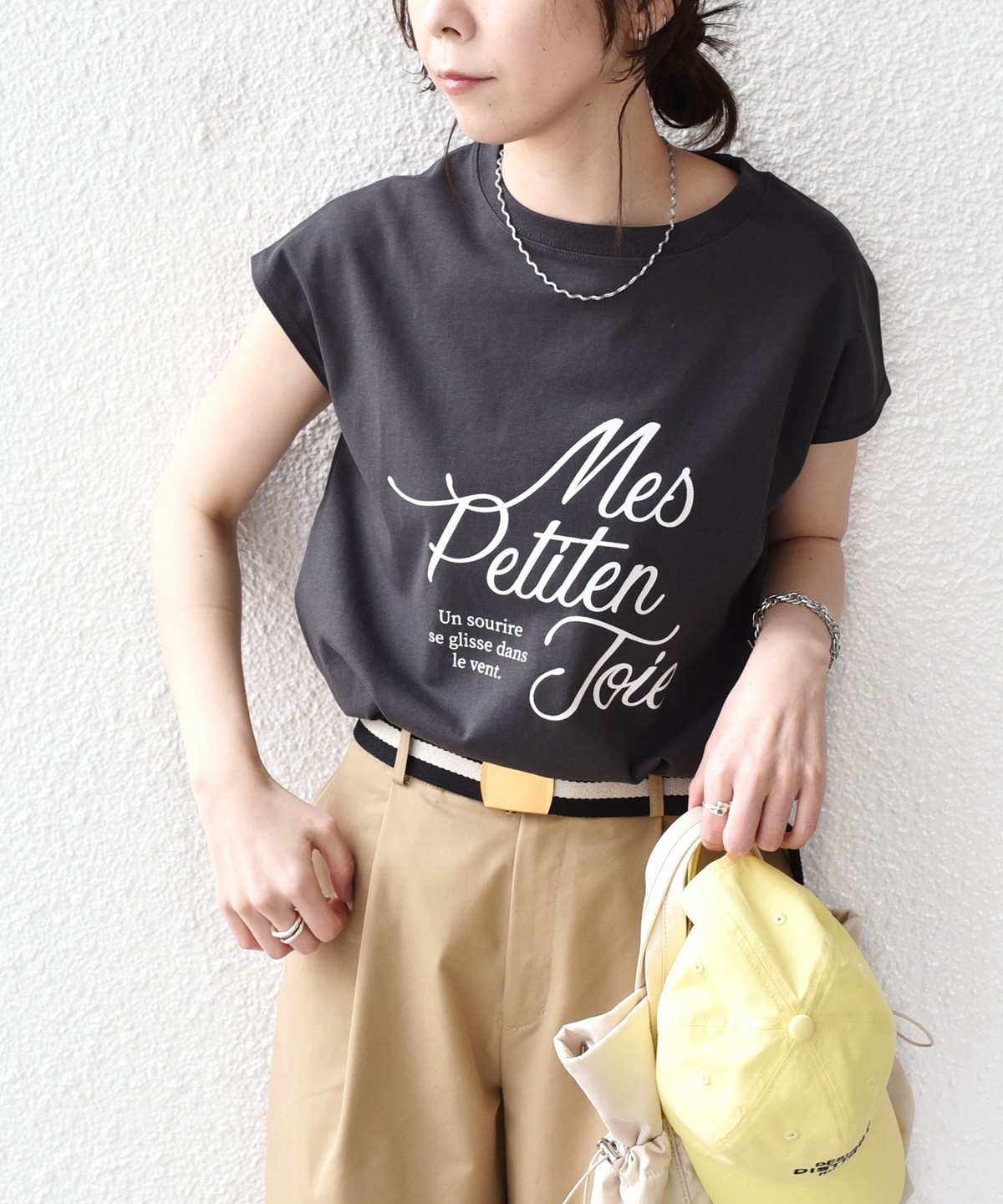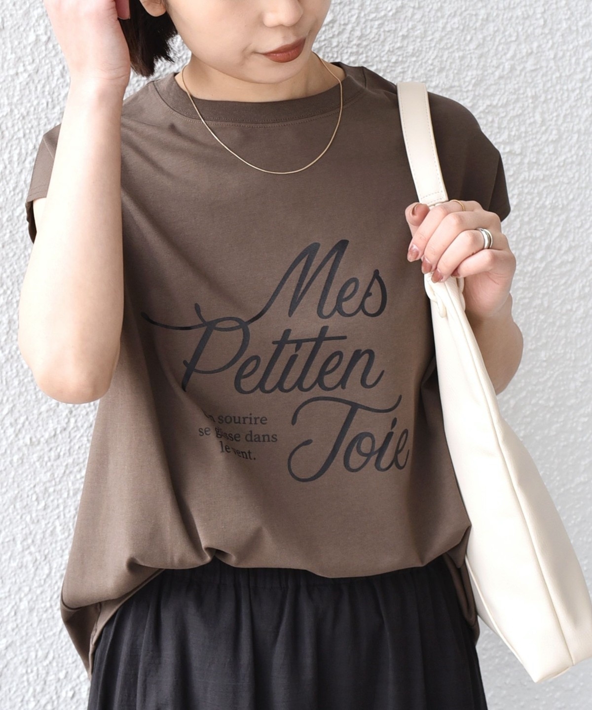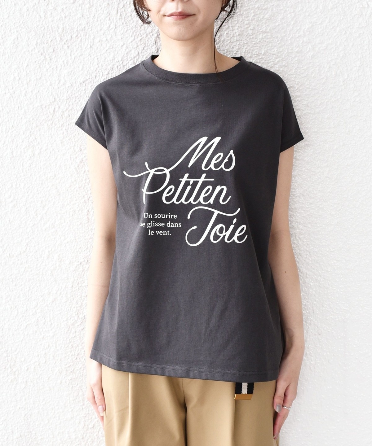 程よくゆとりのあるシルエットとフレンチスリーブが、カジュアルながらも女性らしい雰囲気で着用いただけます。