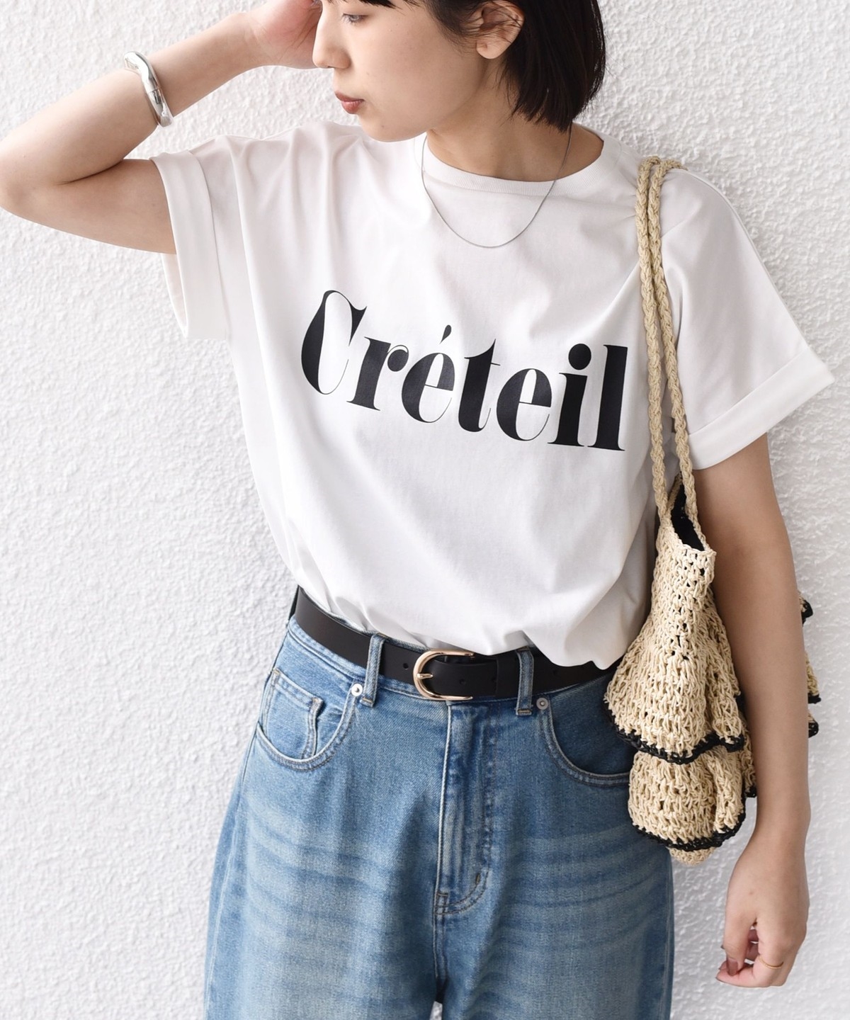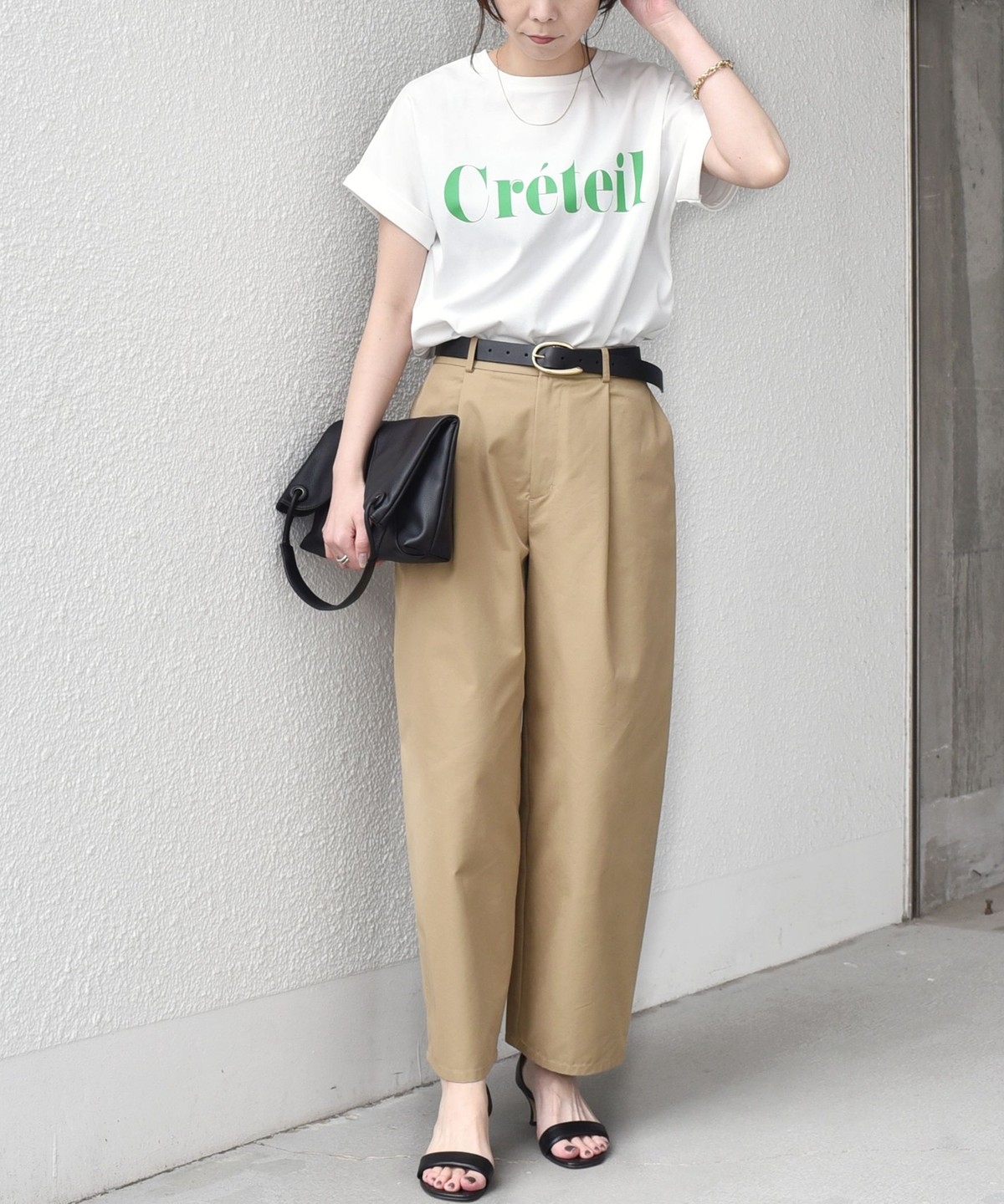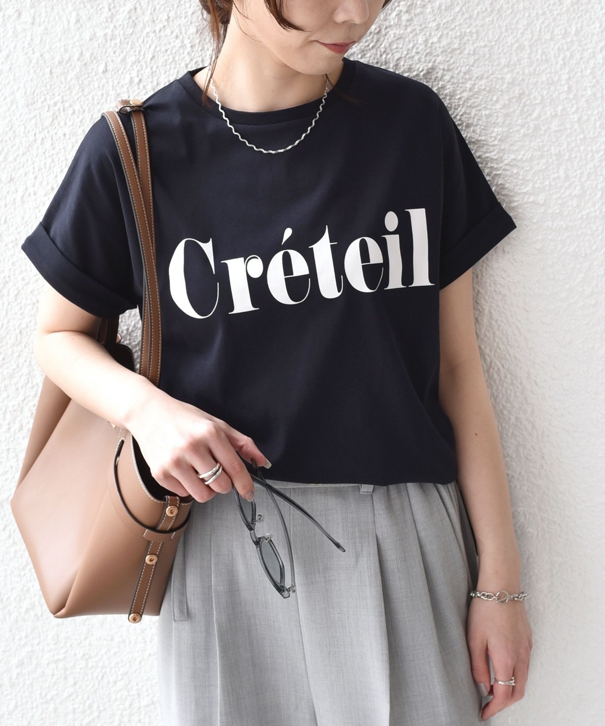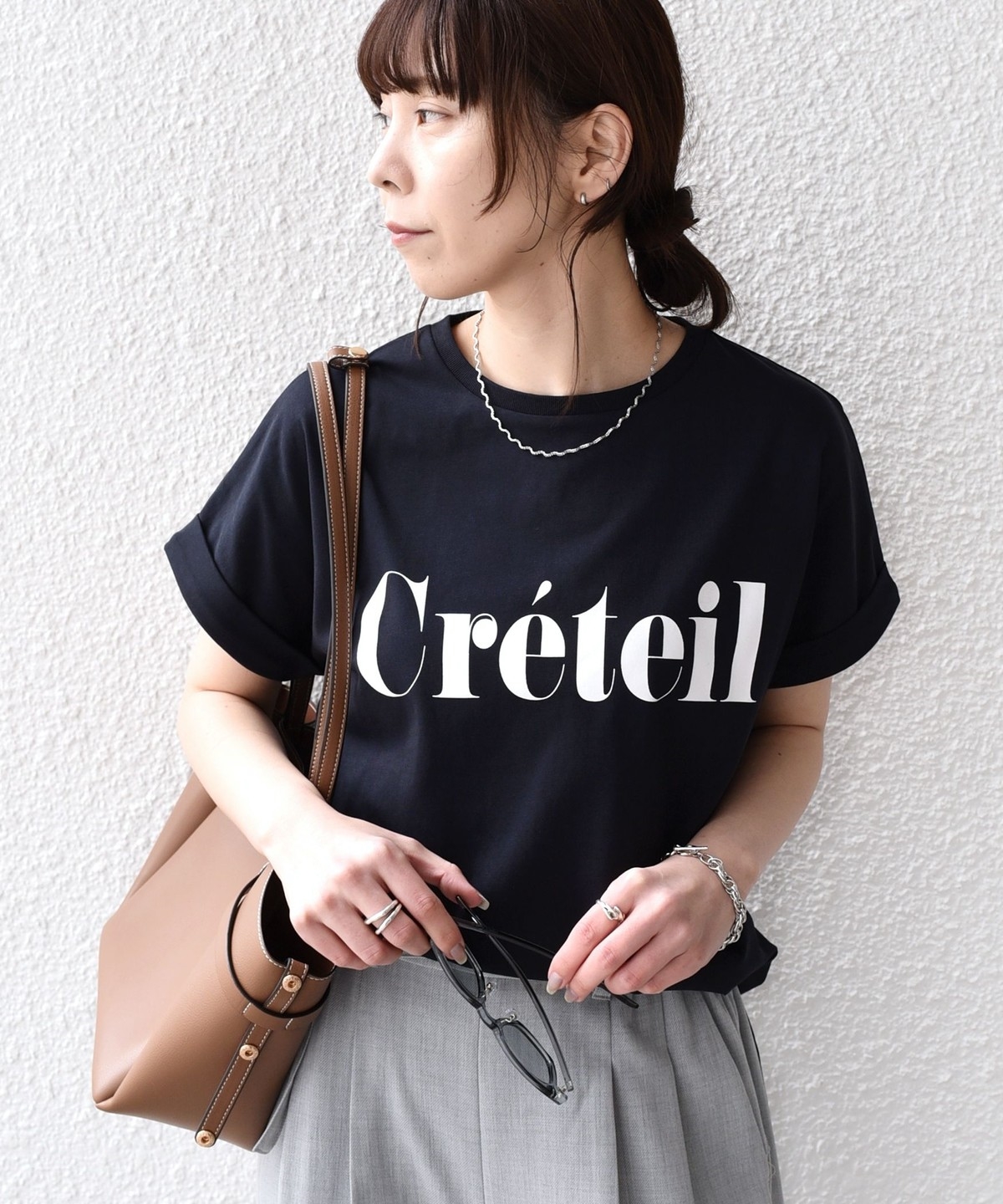 ゆったりとしたシルエットなので、タックインやフロントインしたアレンジもバランスよく決まります。