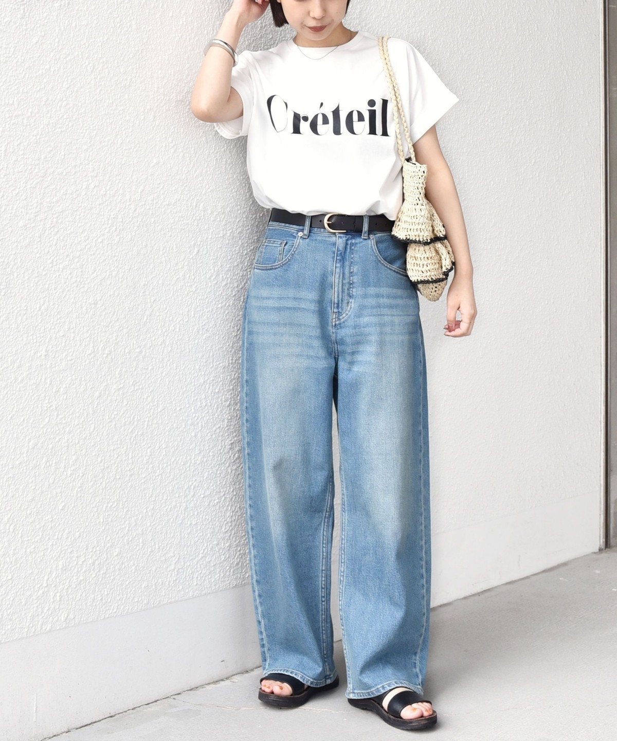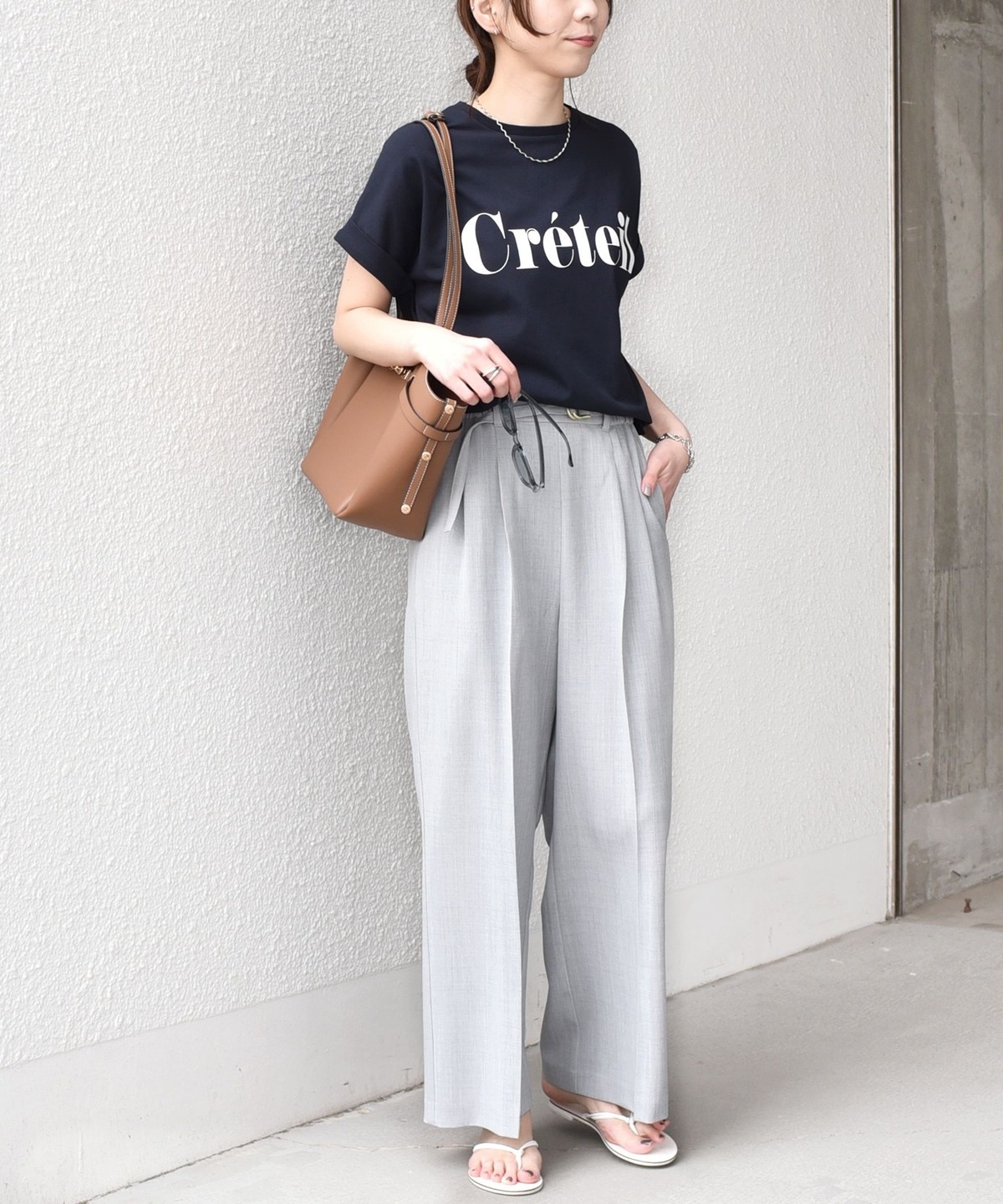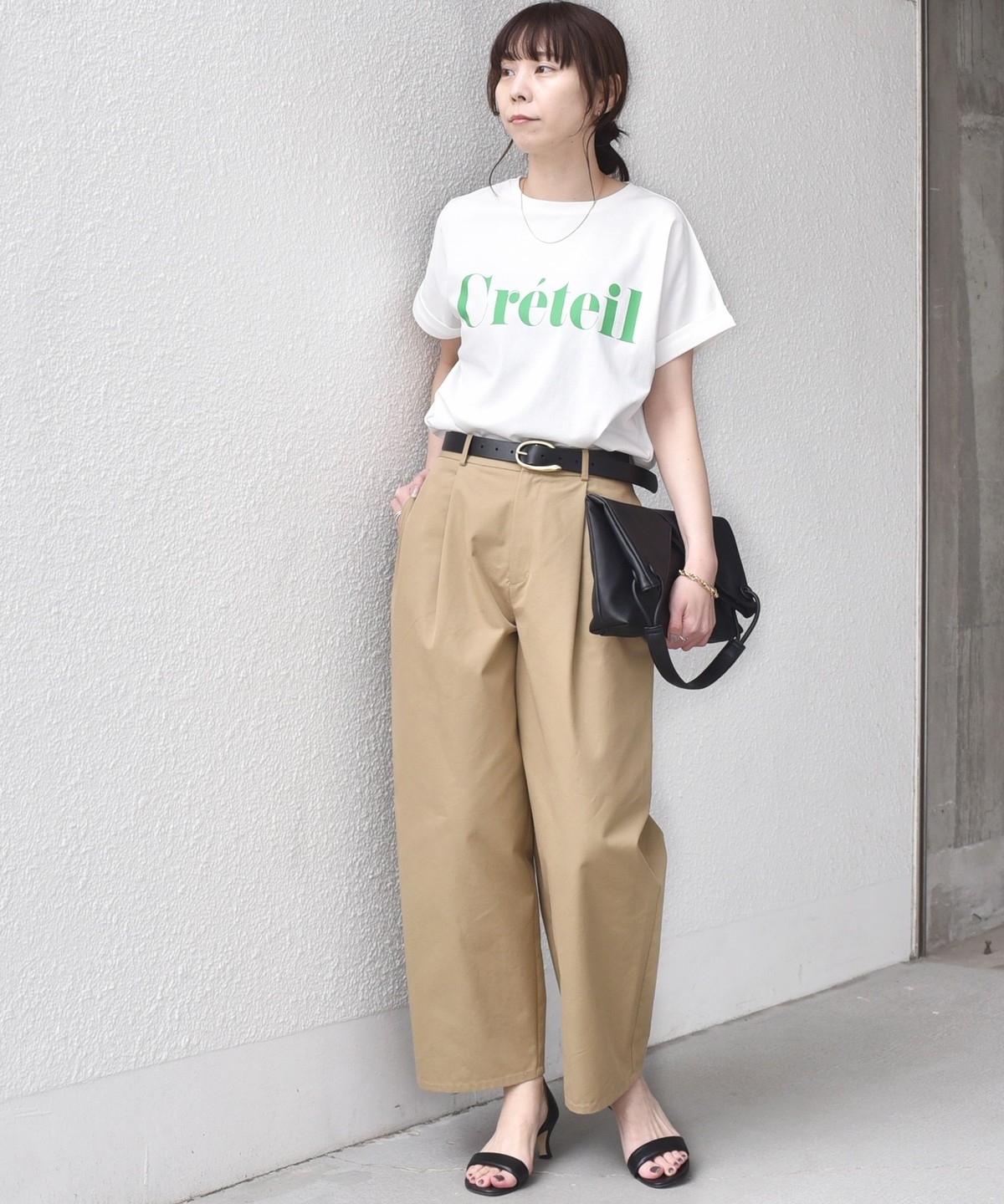 ゆったりとしたシルエットなので、タックインやフロントインしたアレンジもバランスよく決まります。