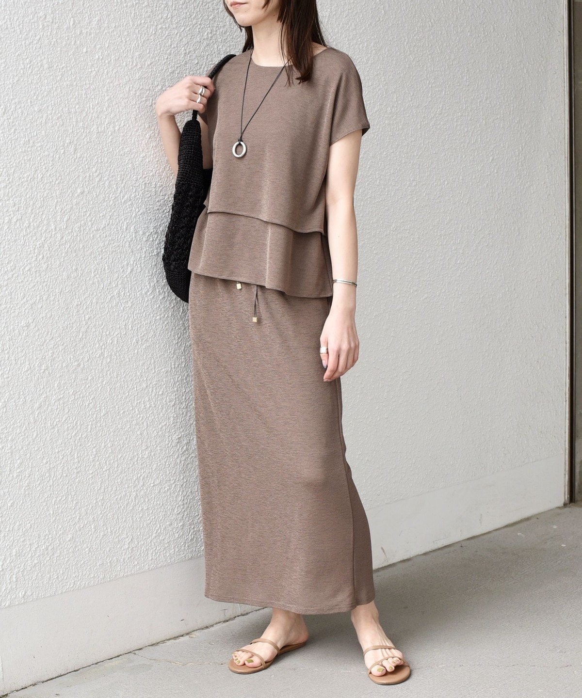 同素材のスカートと合わせたセットアップスタイルは、お仕事やお食事などのきちんとしたシーンにもおすすめ。