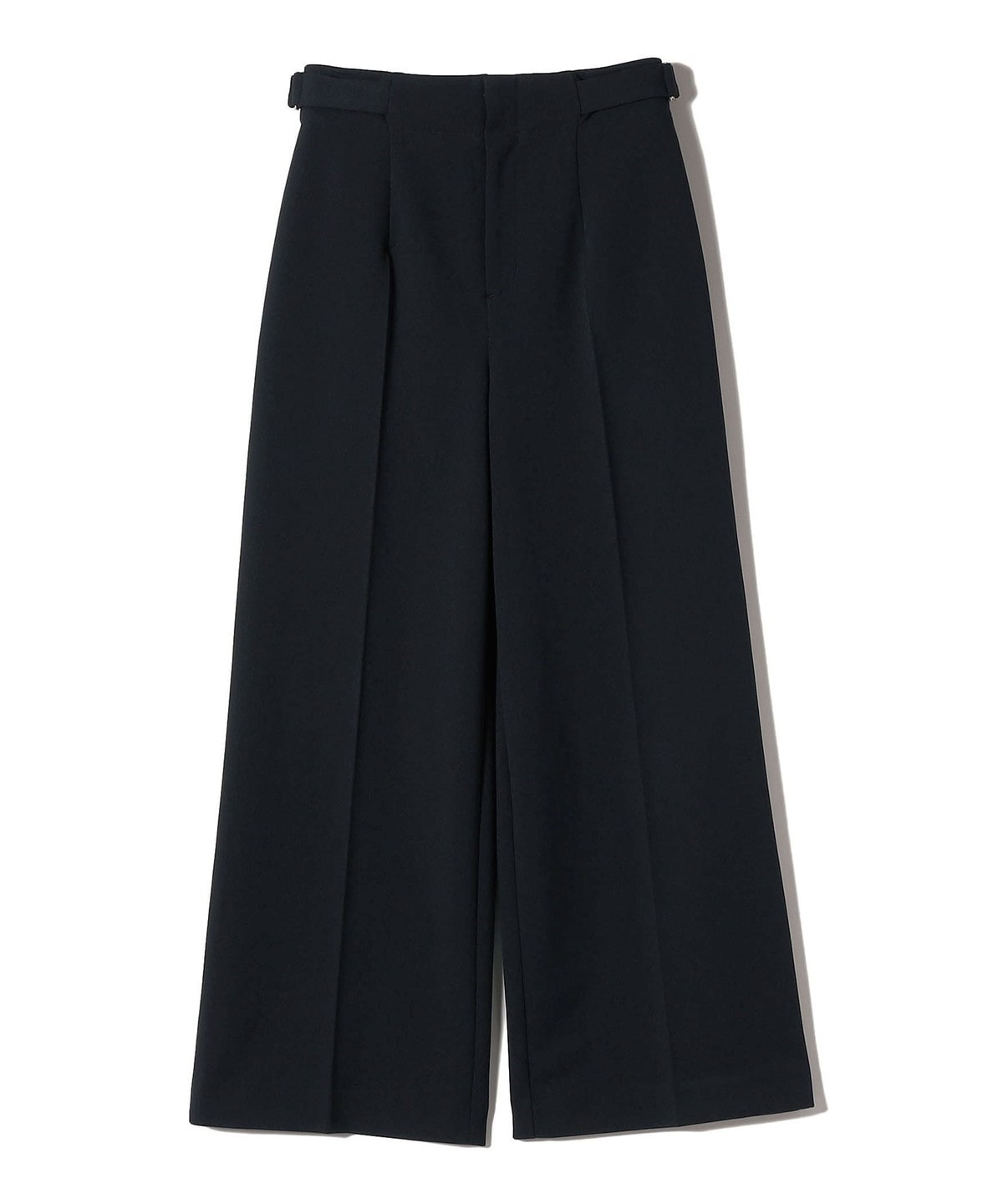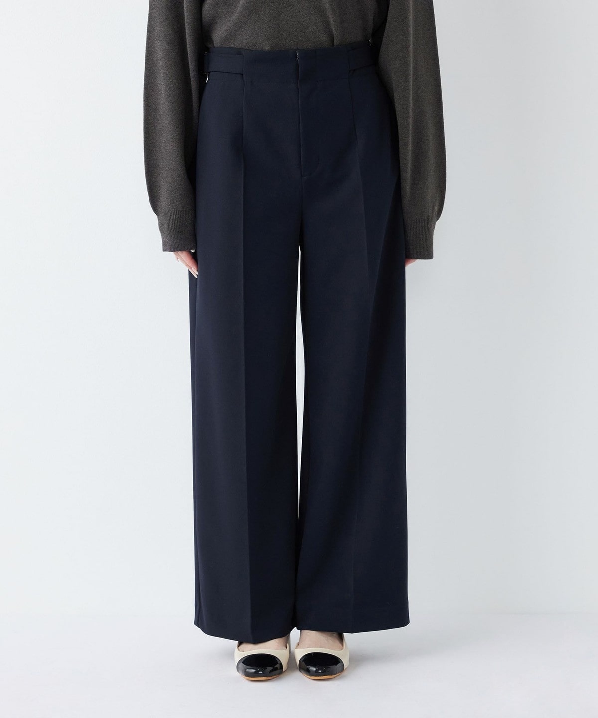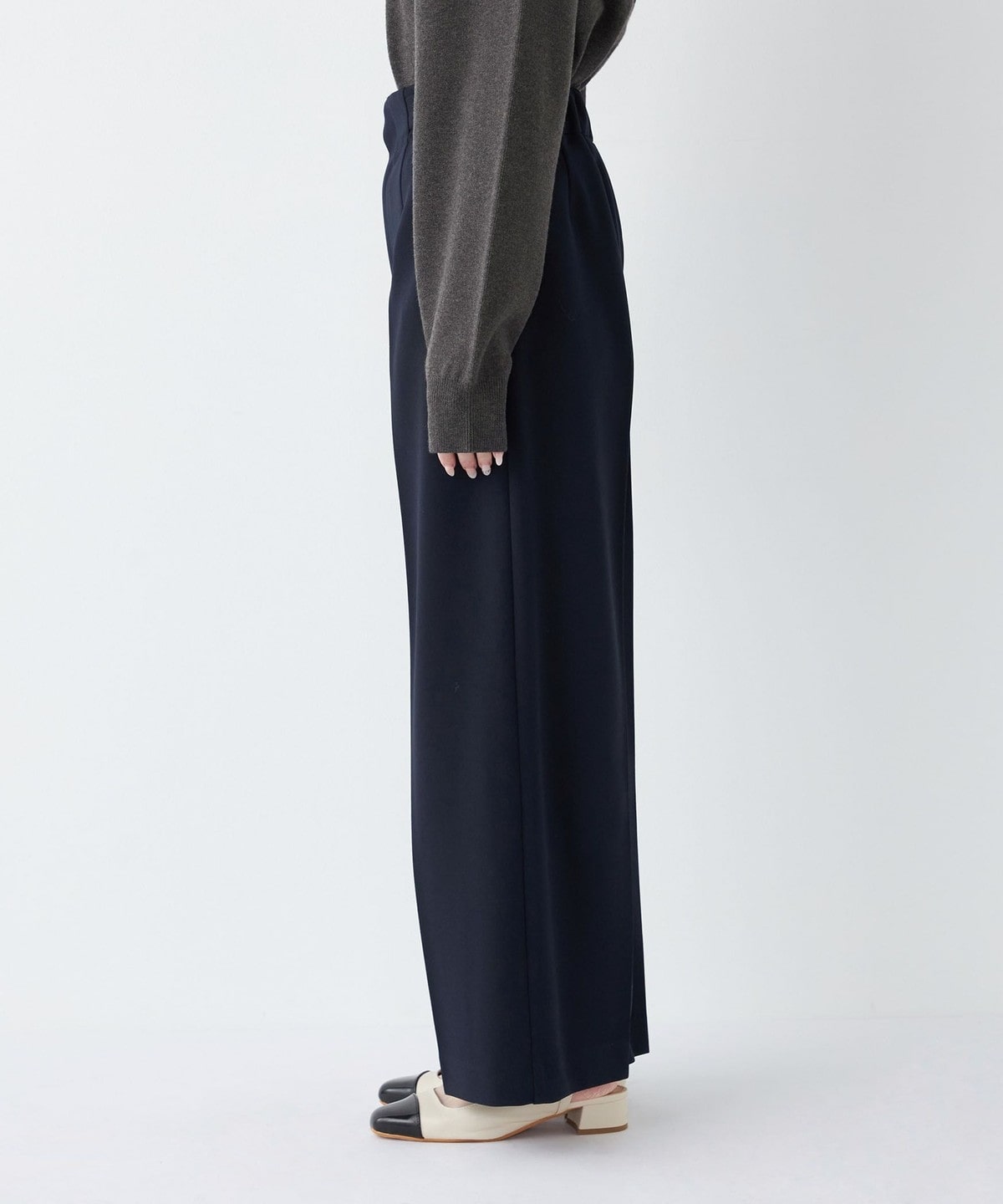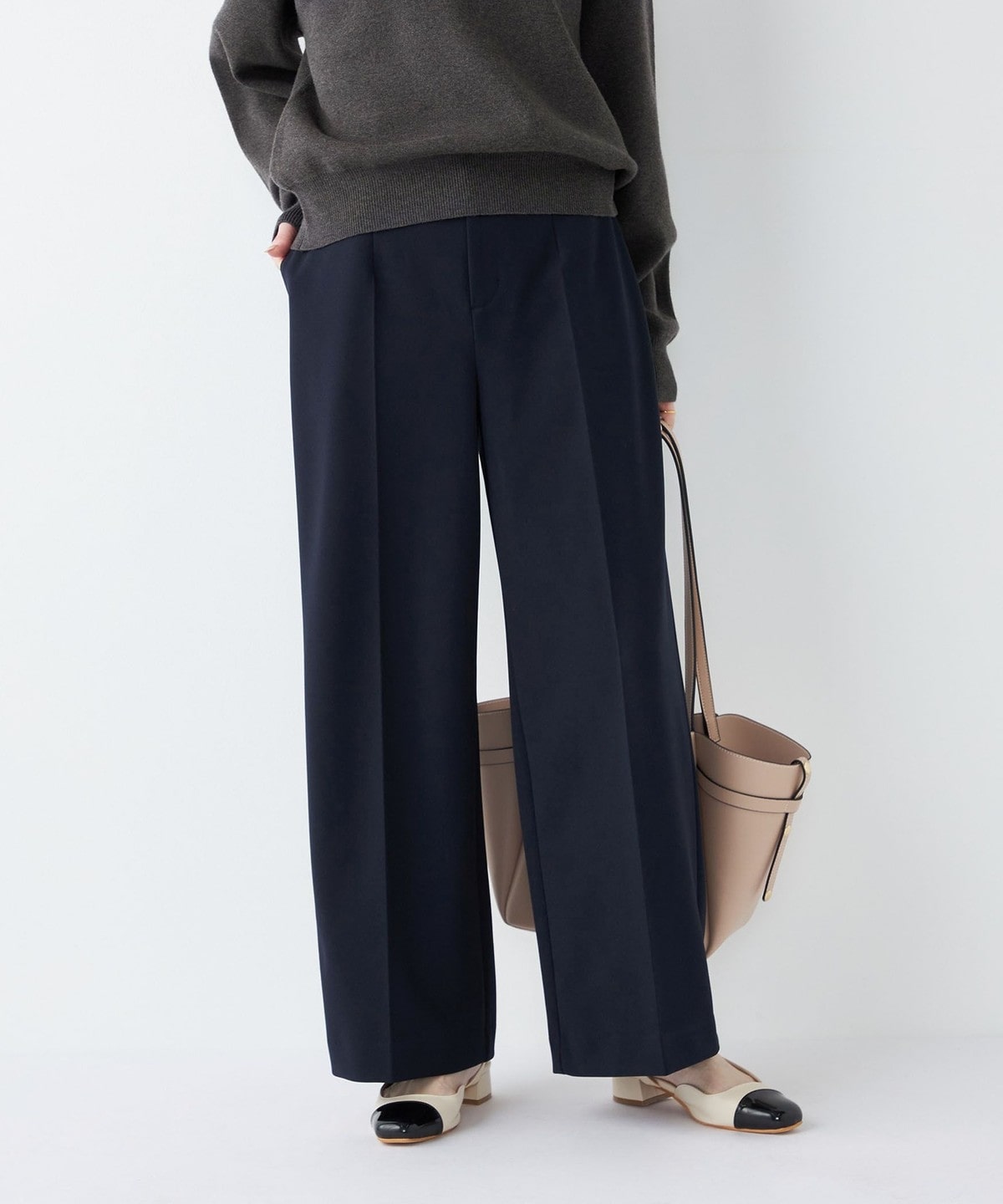 センタープレスがきちんと感を演出しつつ、ワイドシルエットでオンオフ問わず着まわしやすいデザインです。