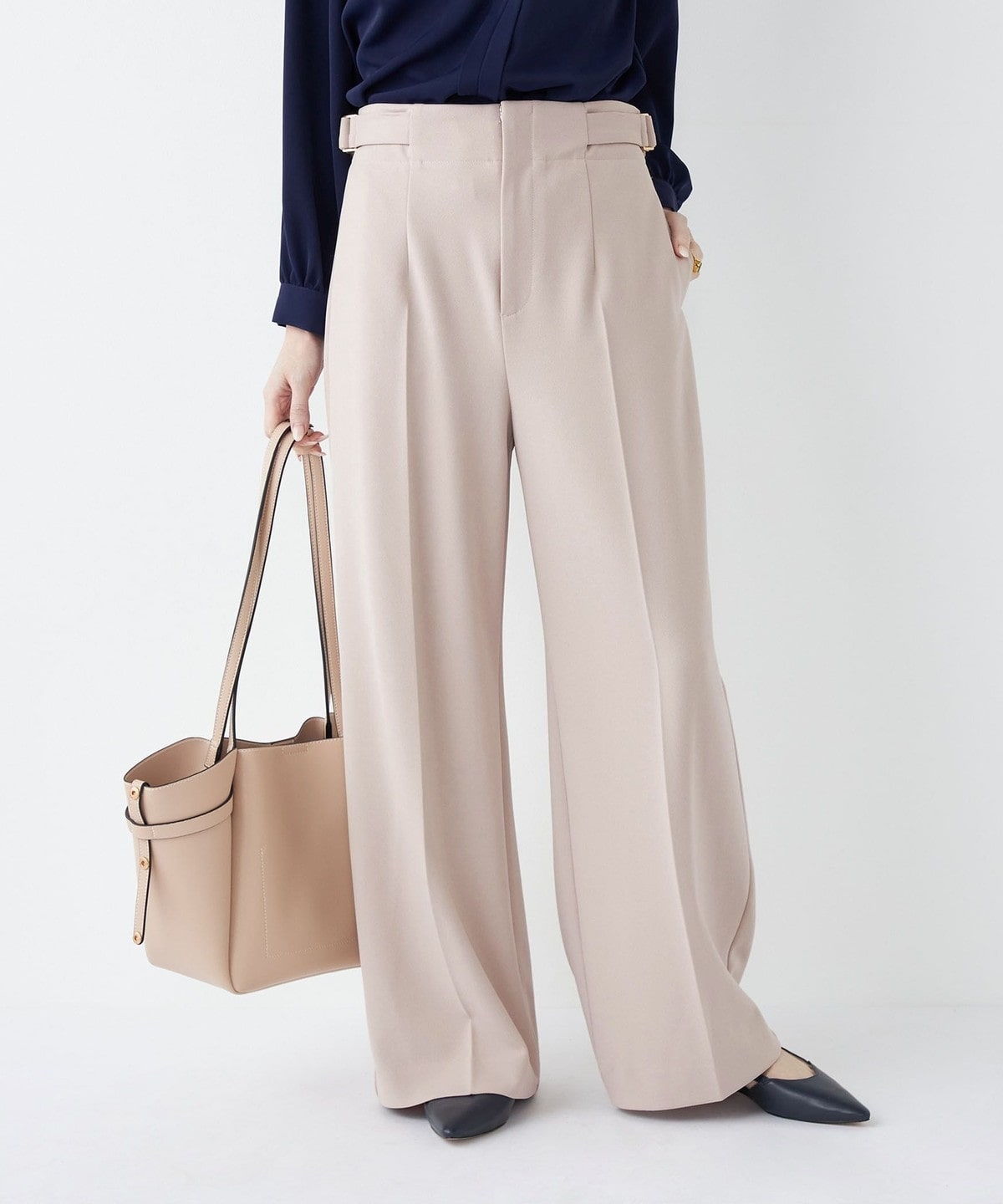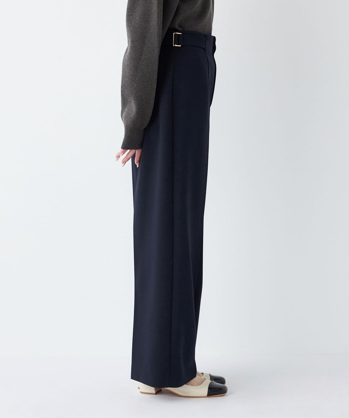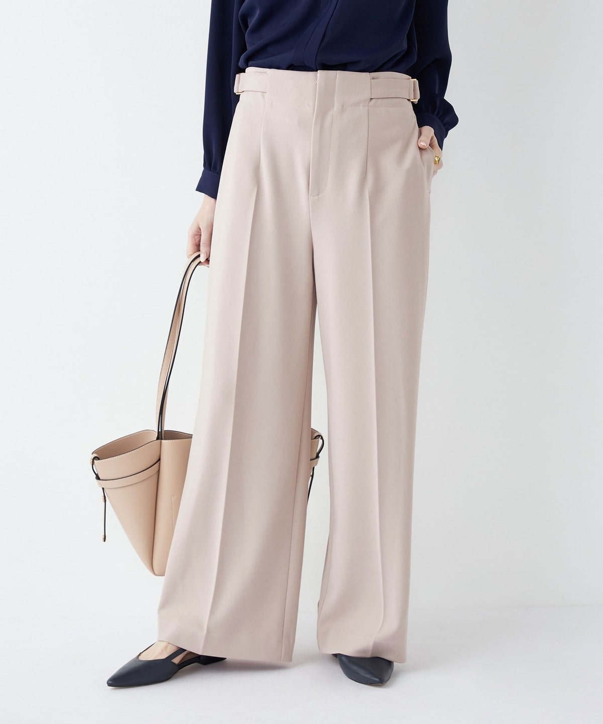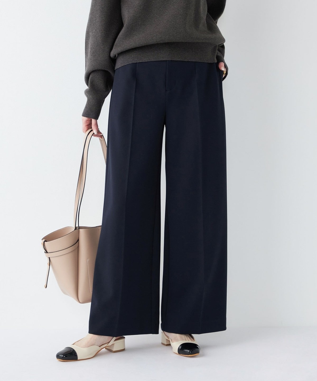 センタープレスがきちんと感を演出しつつ、ワイドシルエットでオンオフ問わず着まわしやすいデザインです。