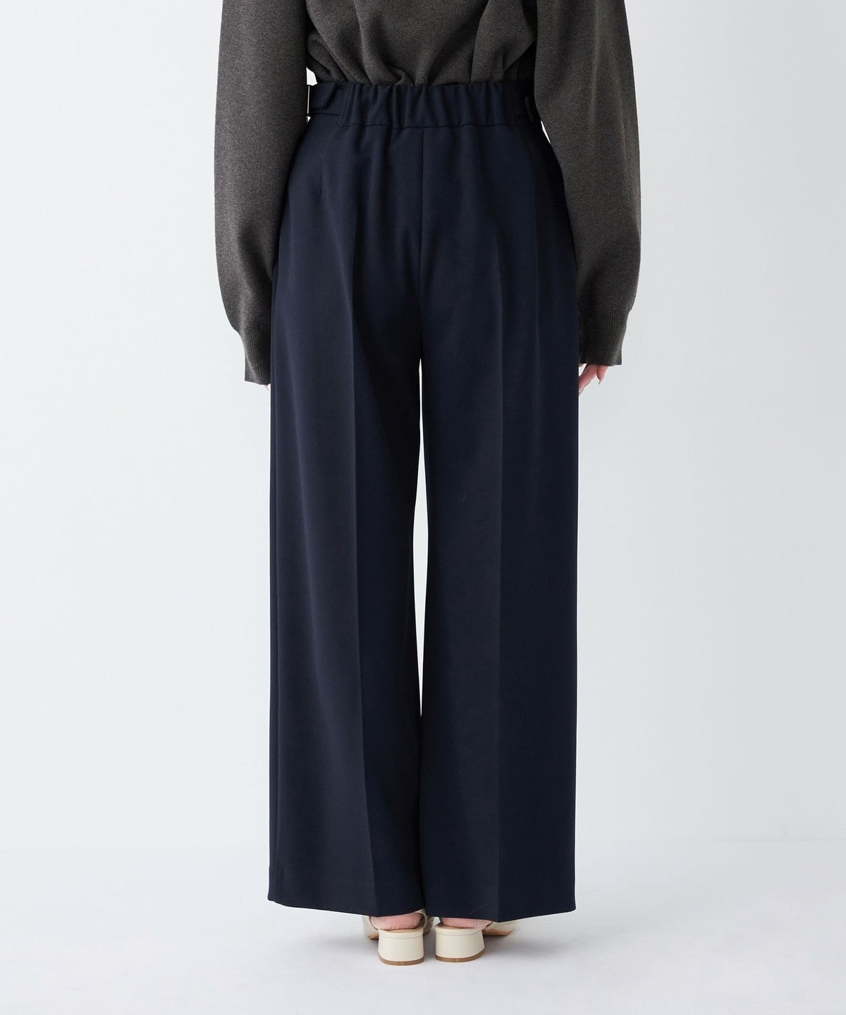 ウエスト後ろはゴム仕様で、サイドには調整可能なベルトが付き。ストレッチ性のある素材感とあわせて、ストレスフリーな履き心地も魅力です。