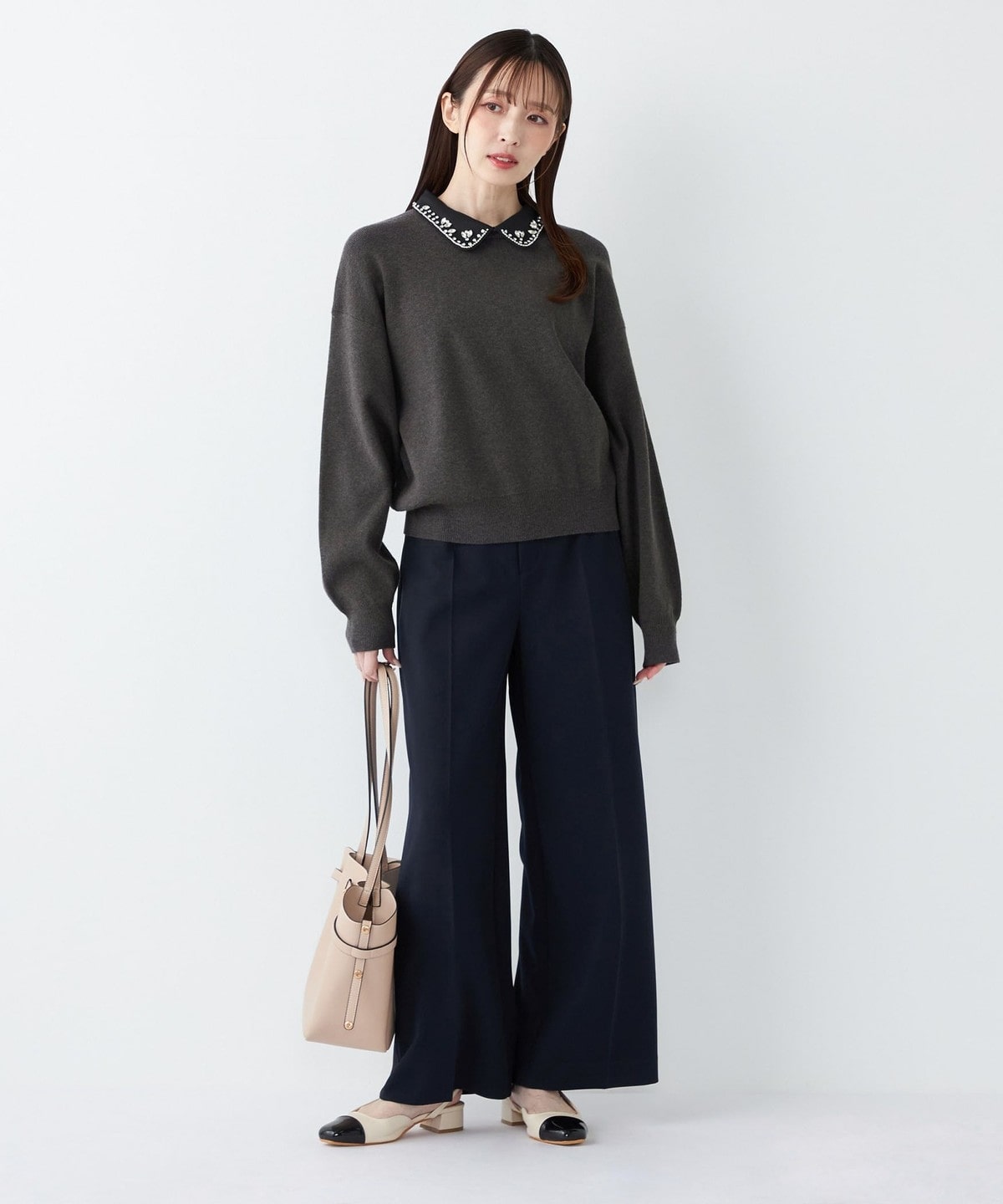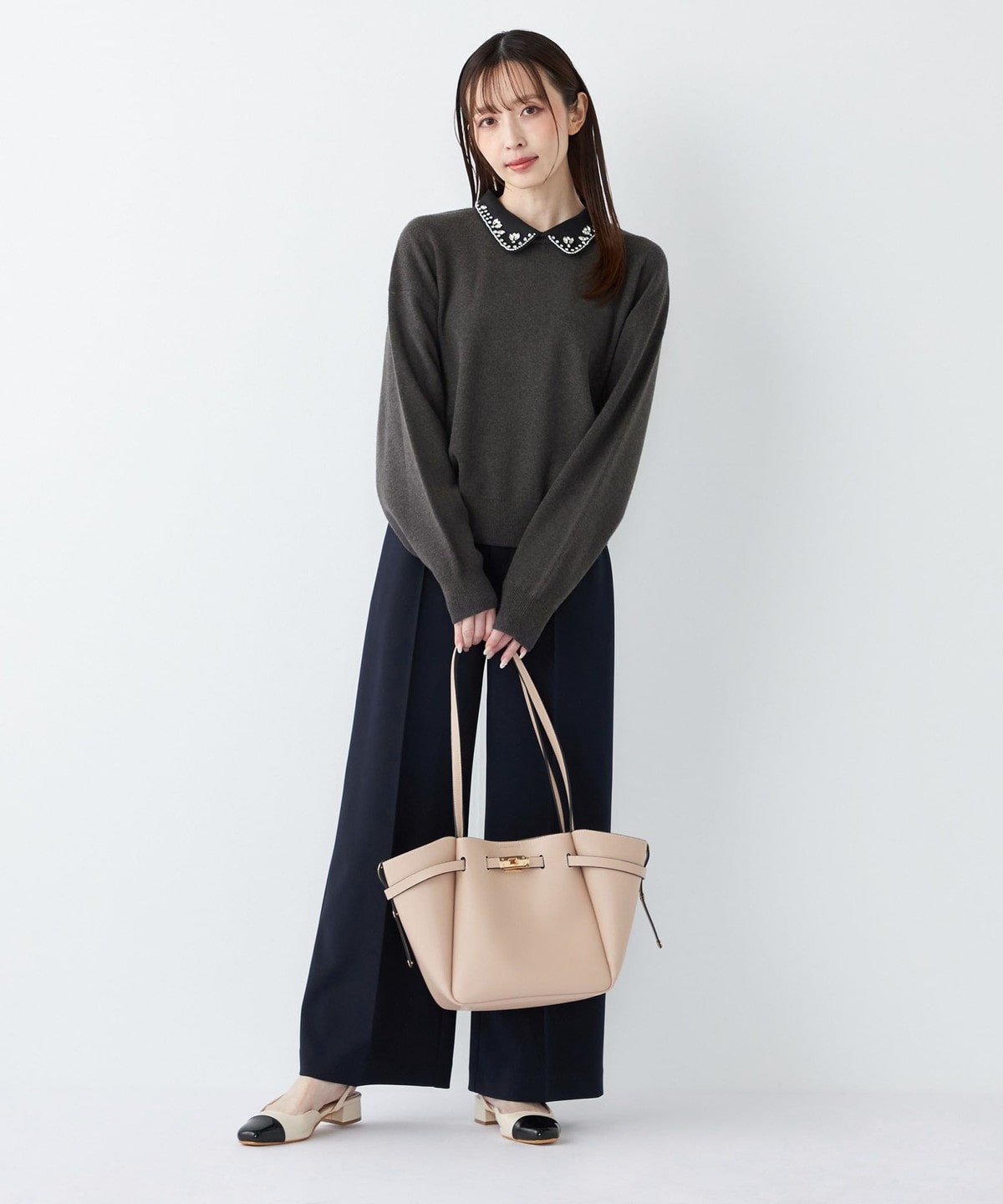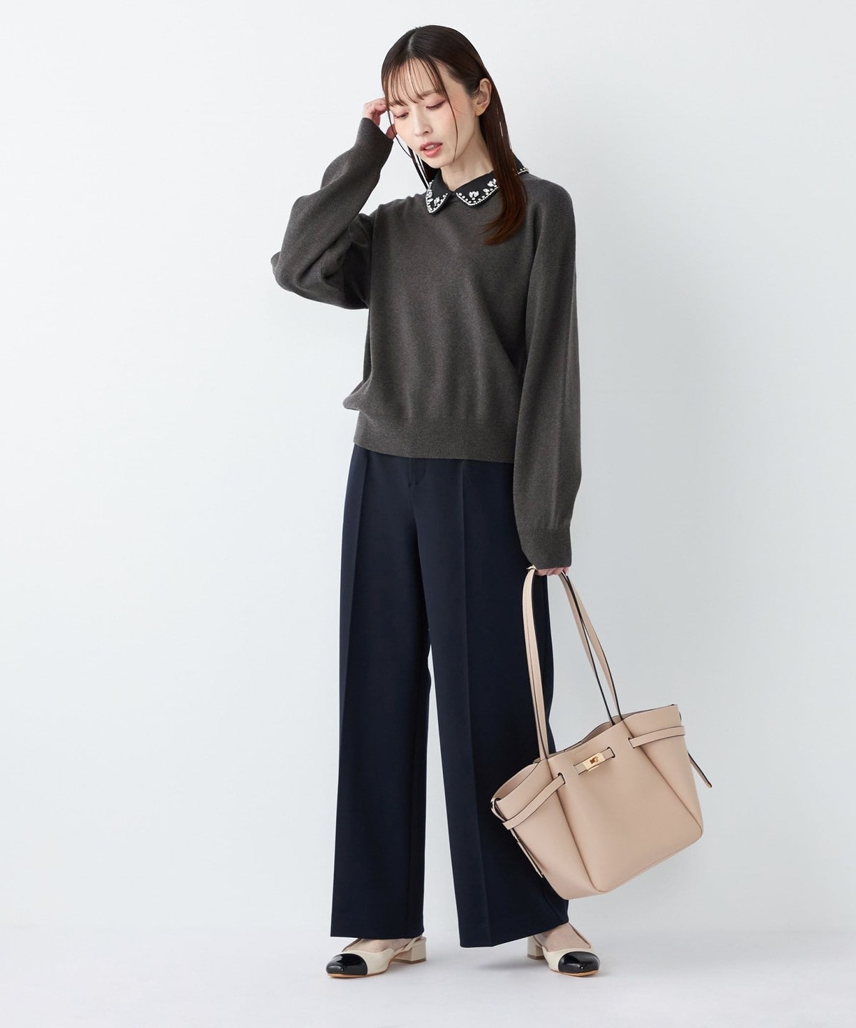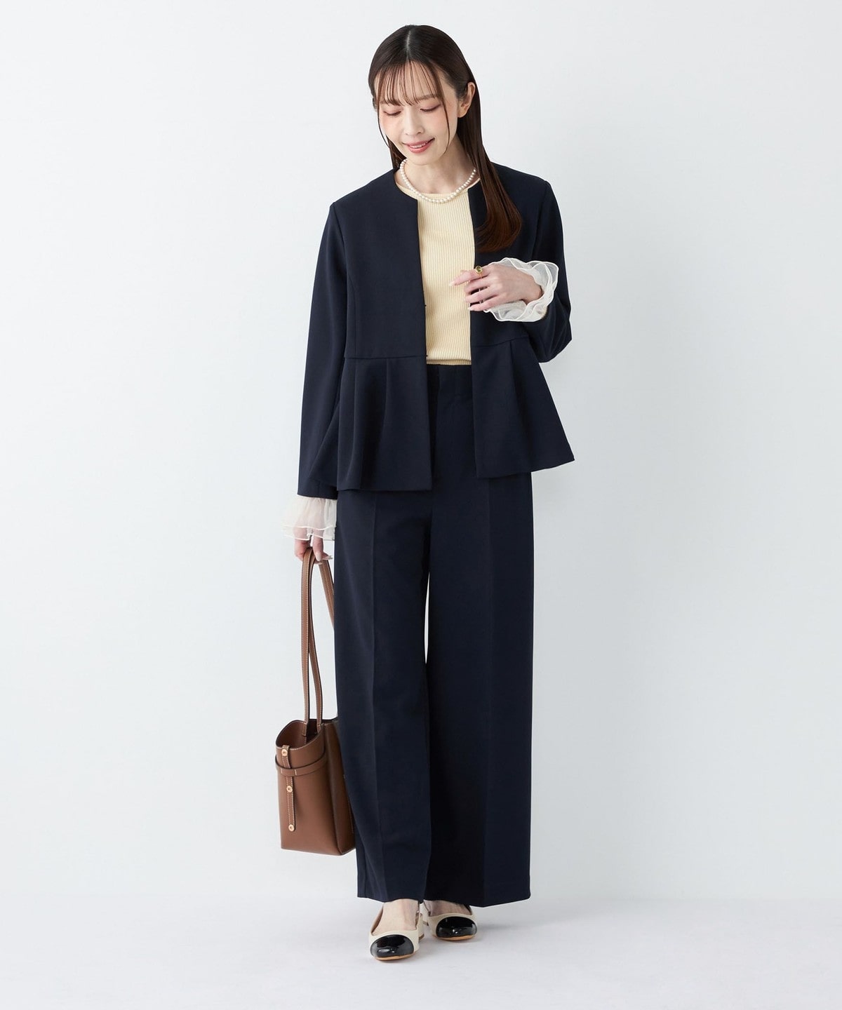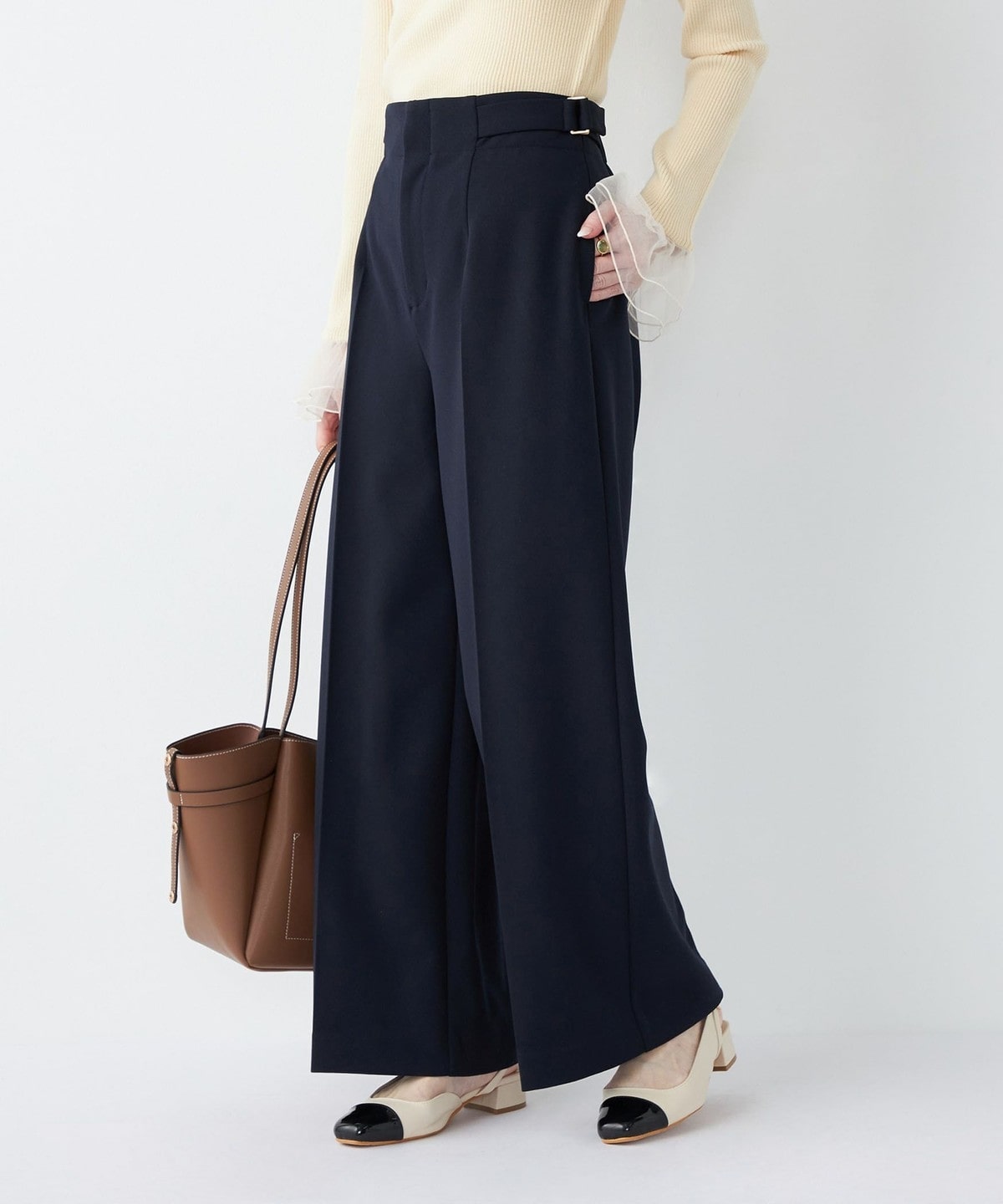 ブラウスやタートルネックをインして、きれいめなオフィススタイルに。