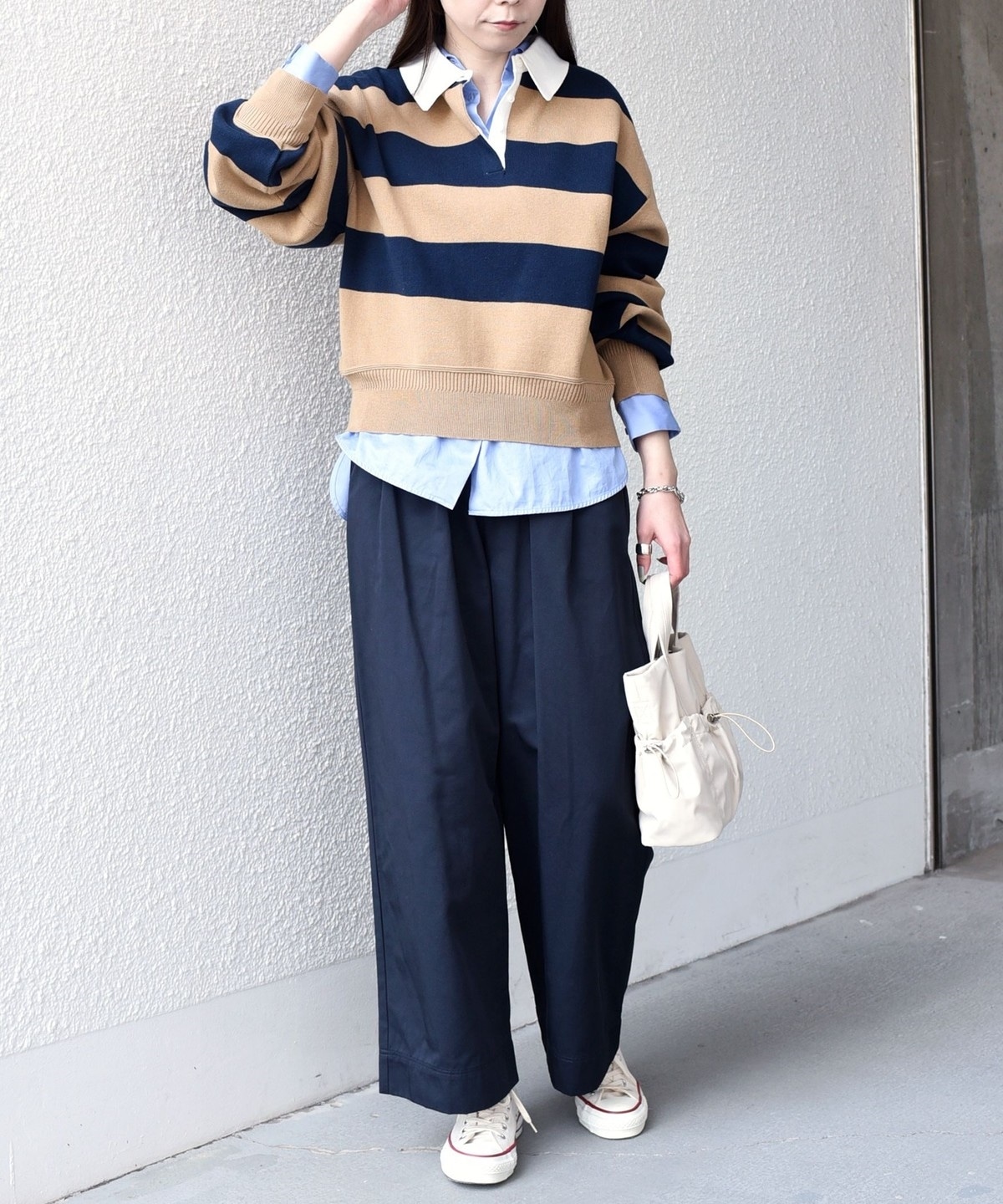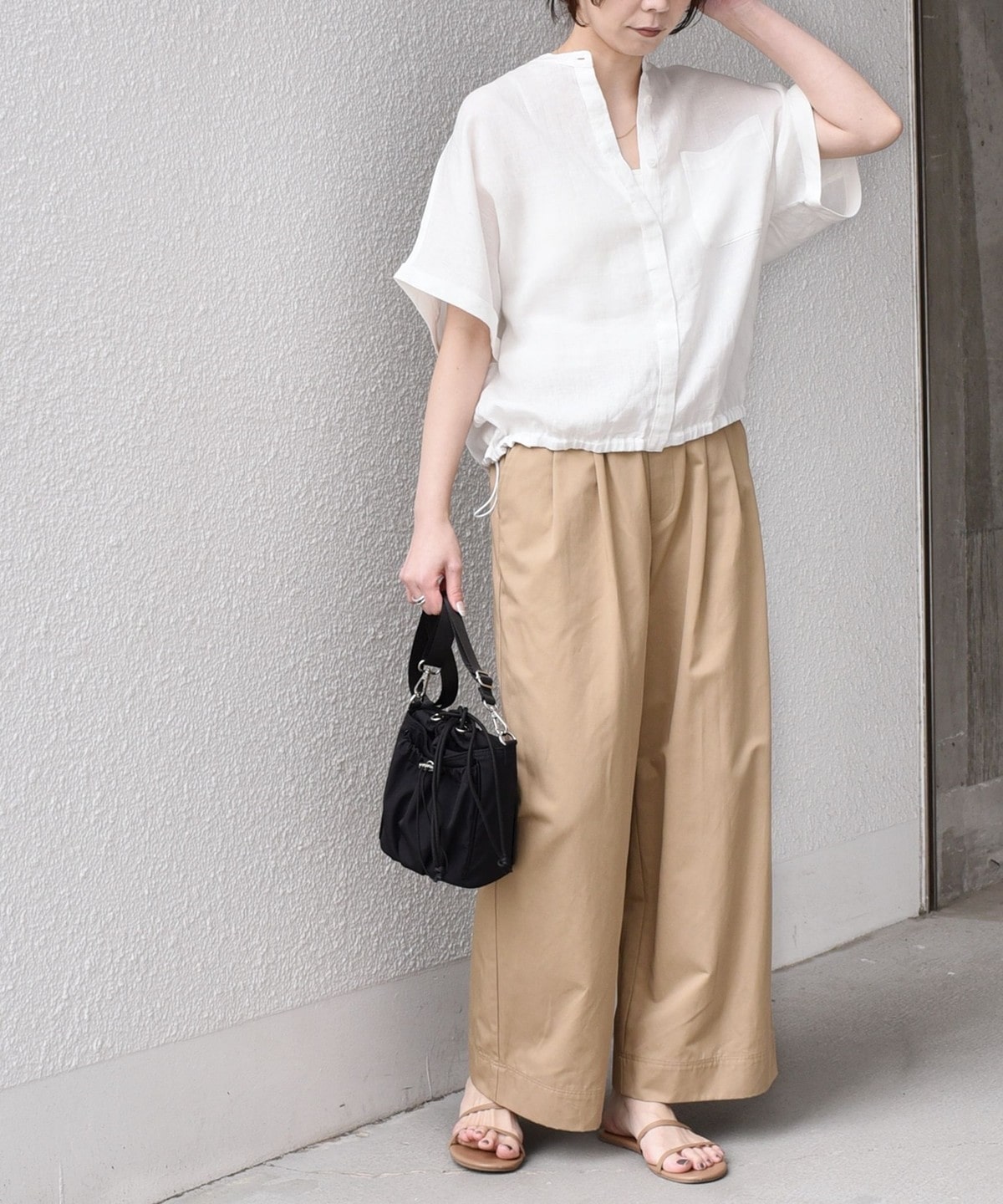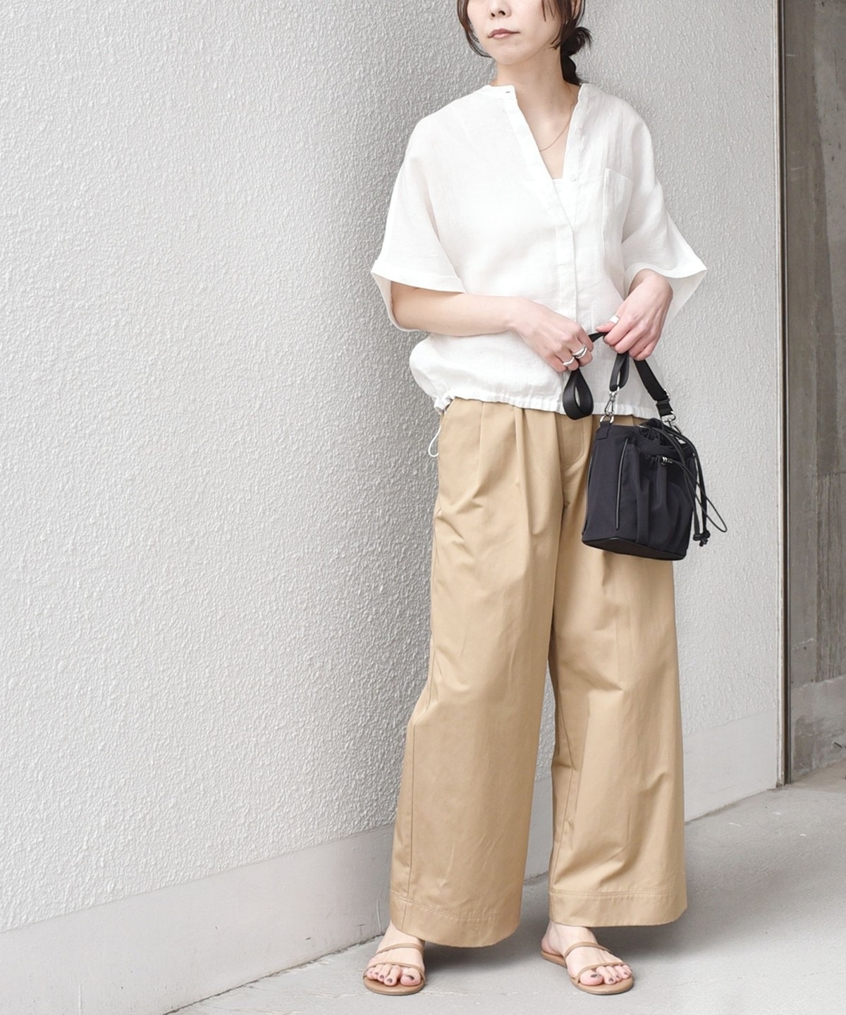 ハリのある素材感が上品な印象を与えつつ、ワイドすぎない絶妙なバランスでラフに着こなせます。