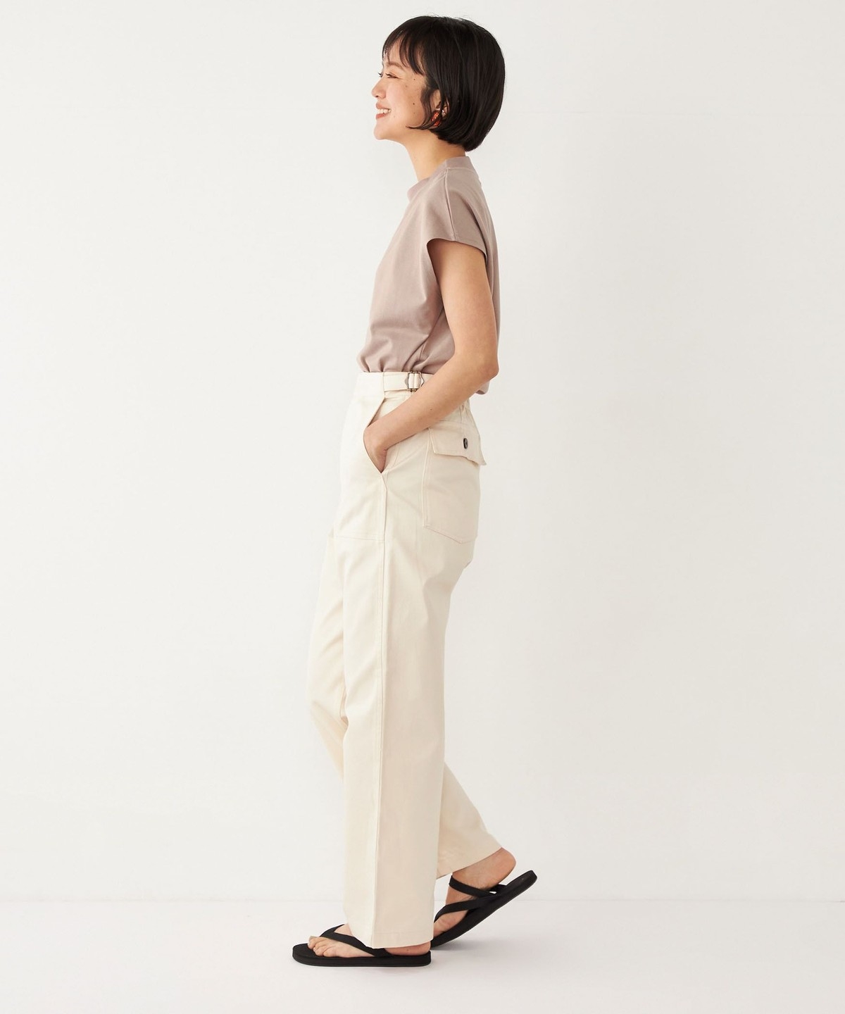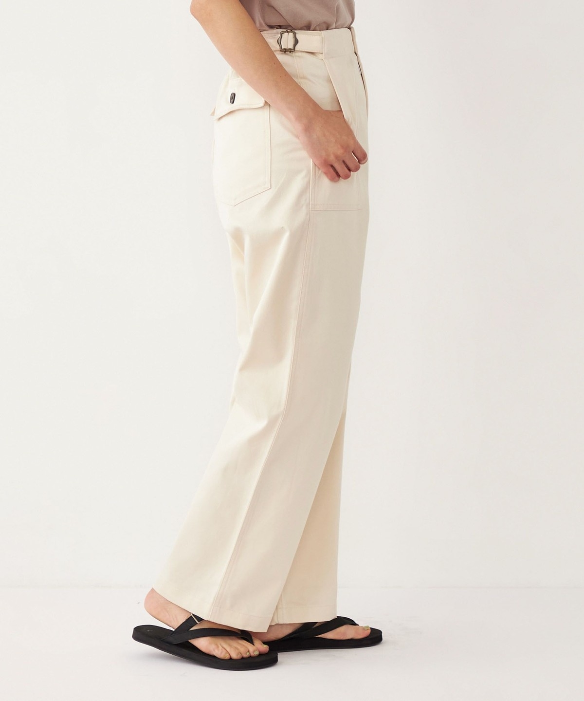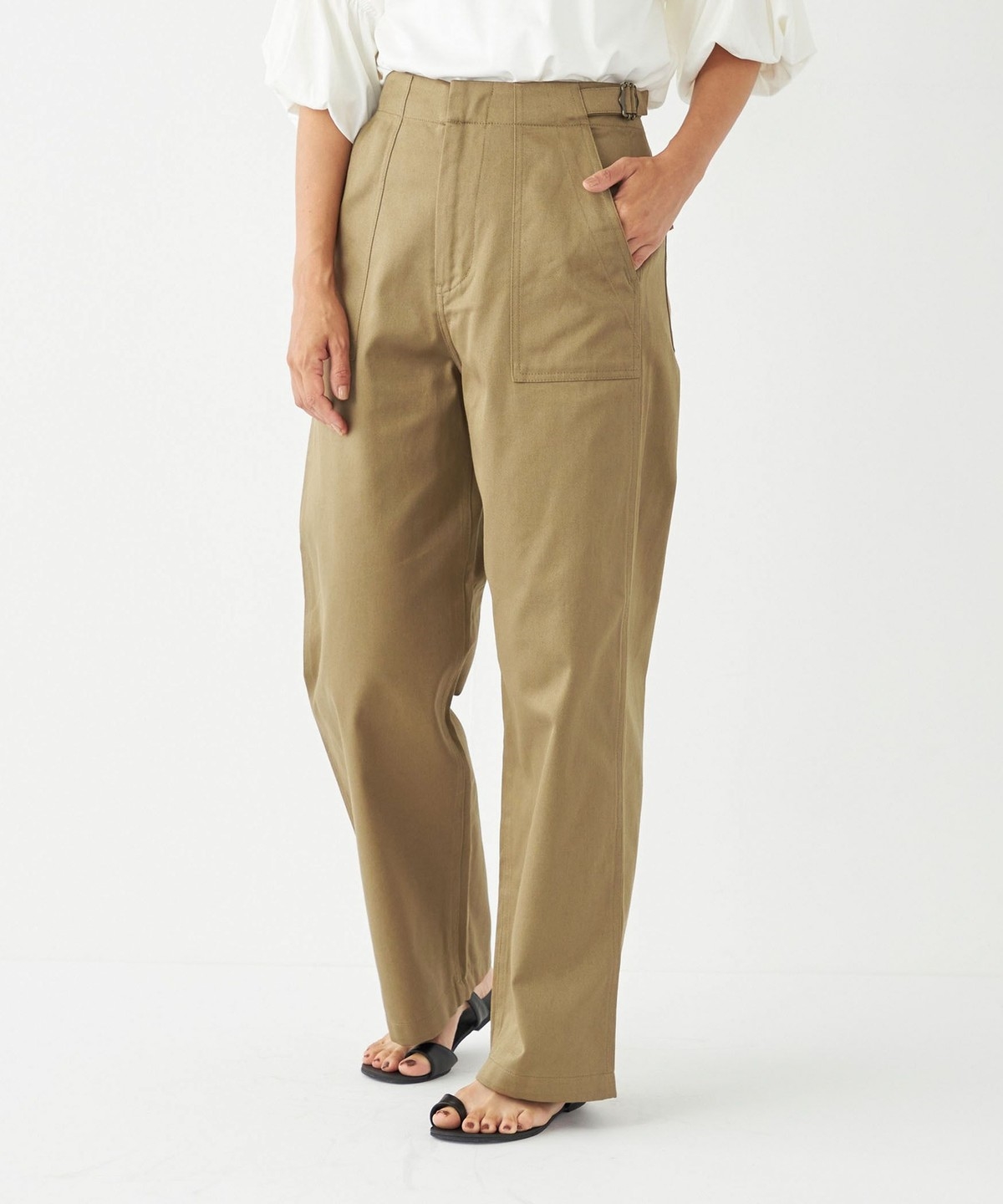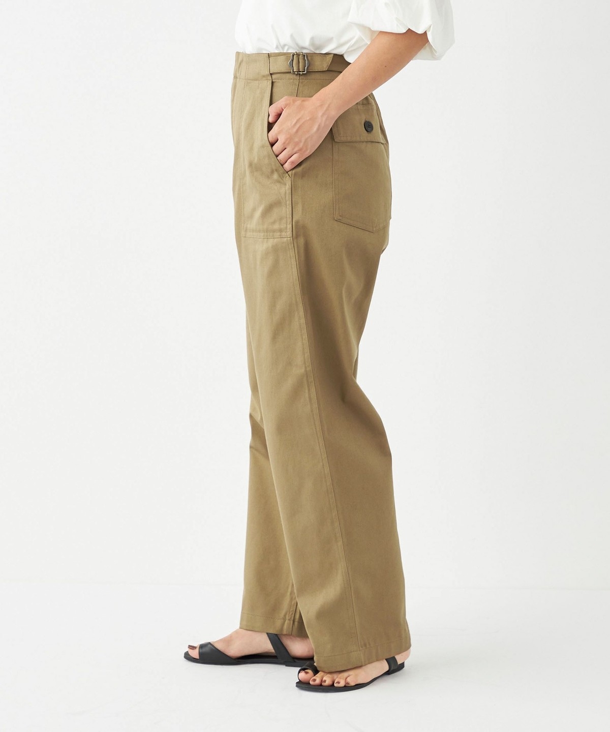 ウエストのサイドベルトがさりげないアクセントに。