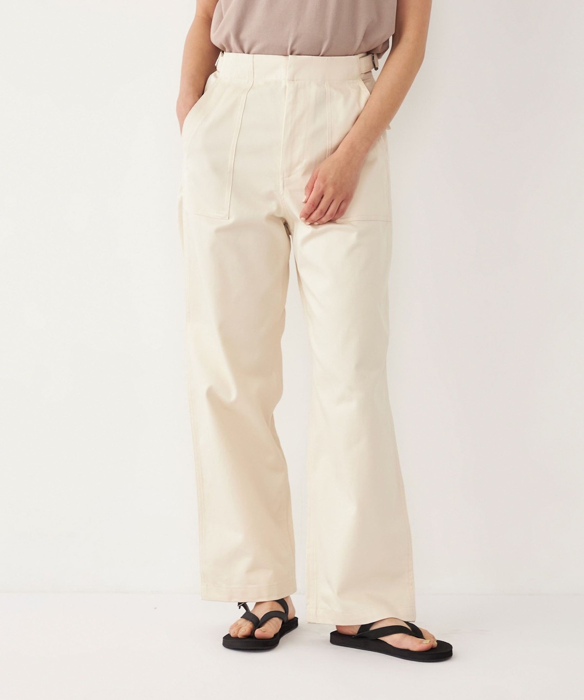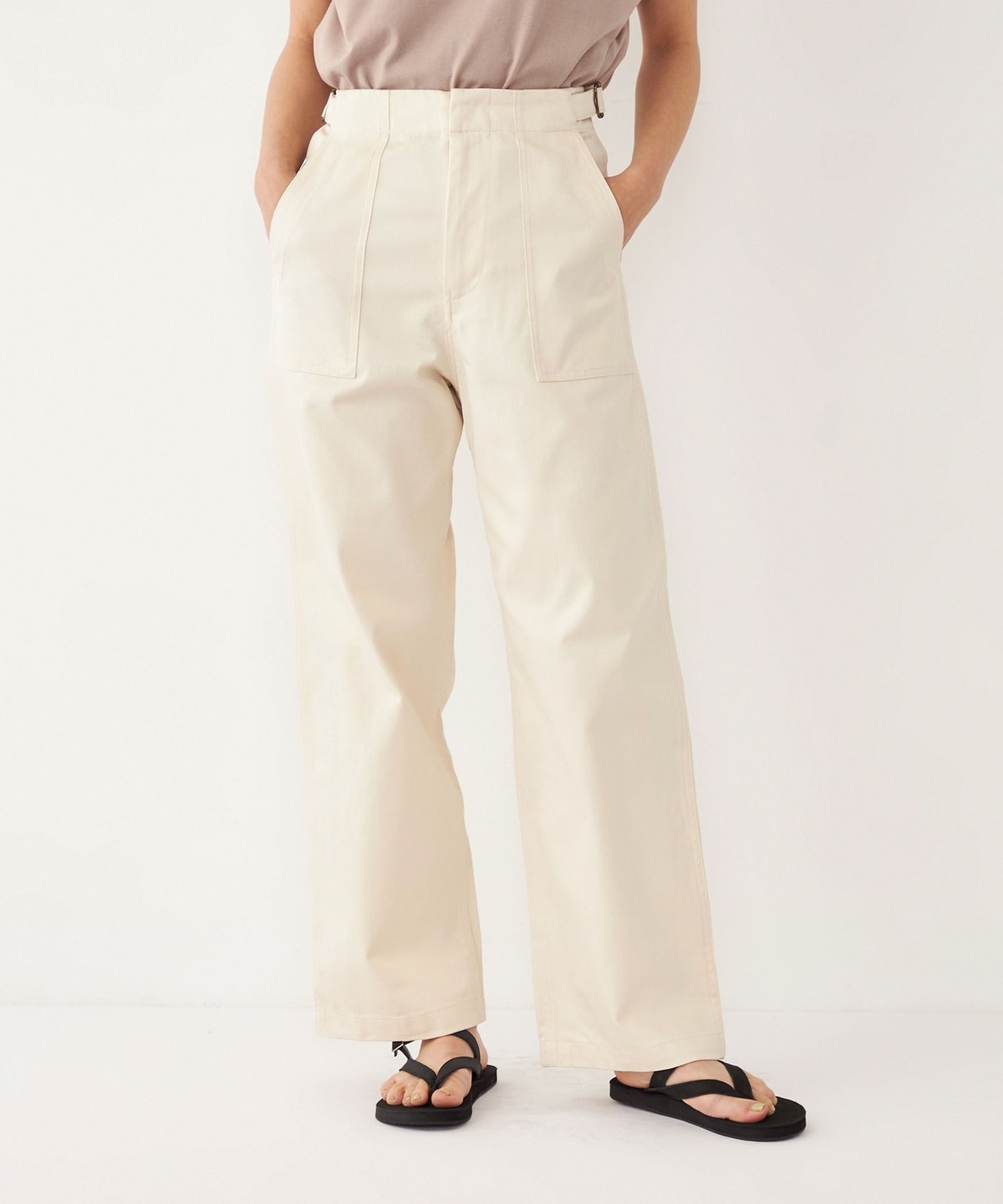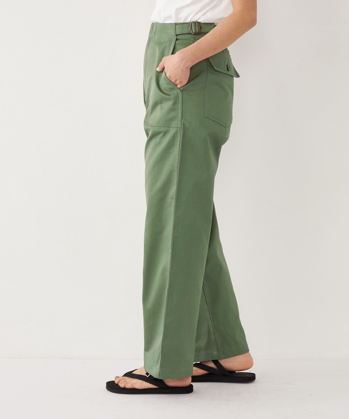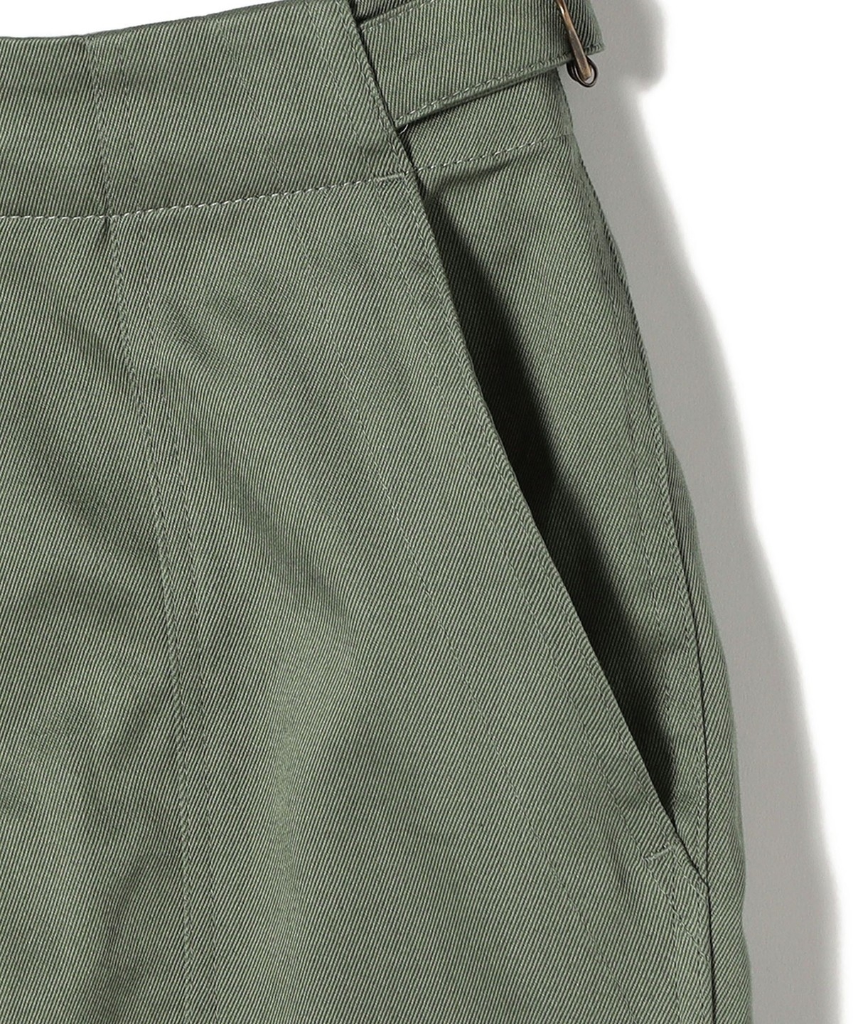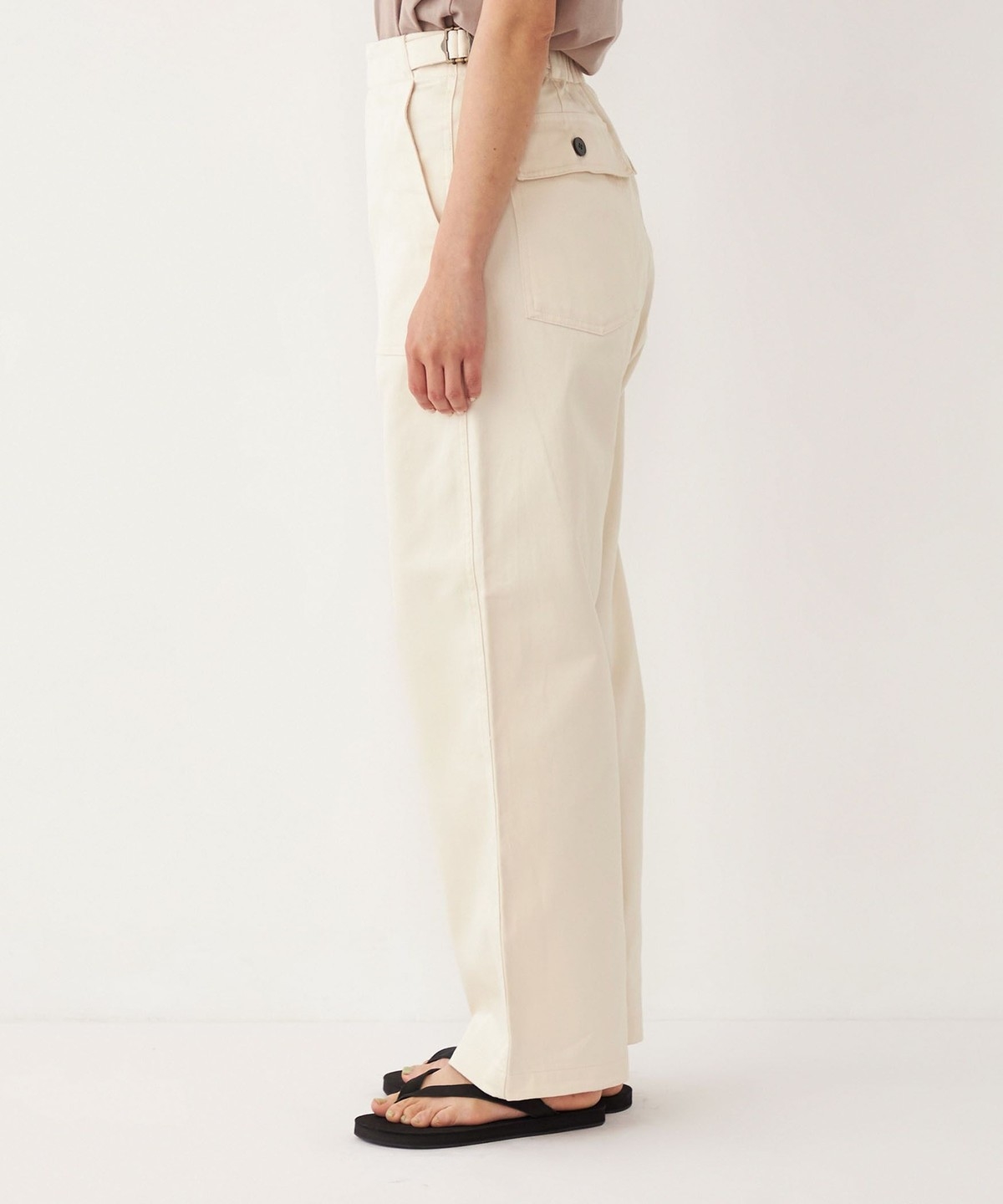 ウエストのサイドベルトがさりげないアクセントに。