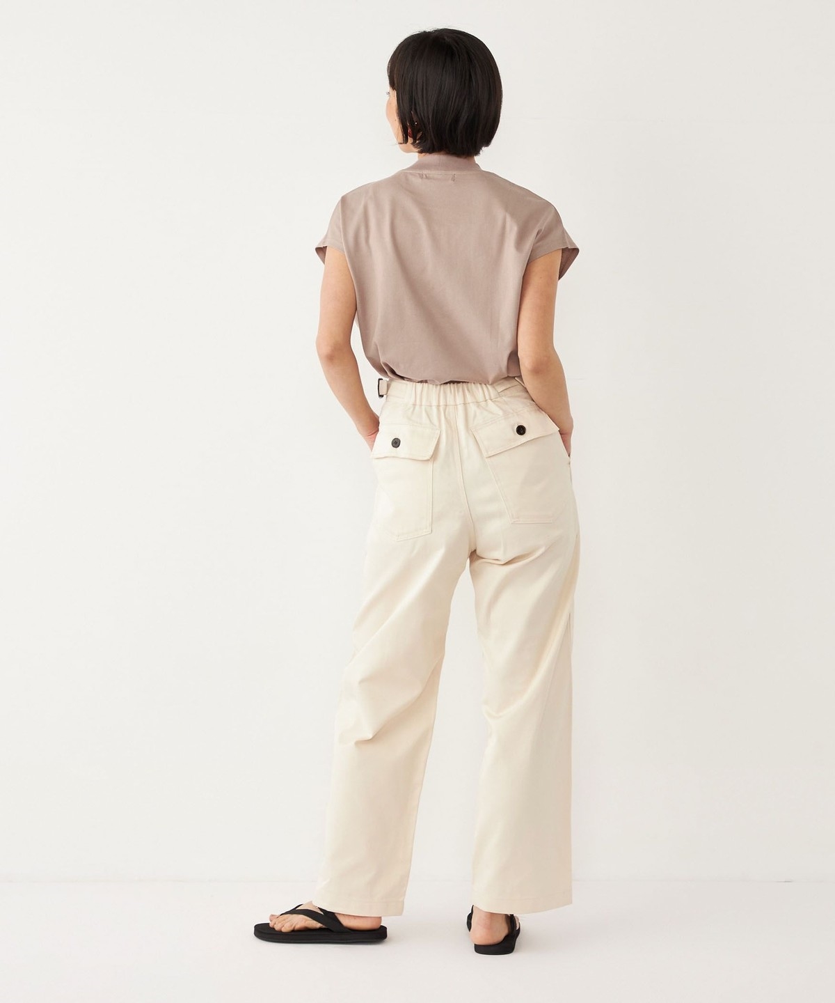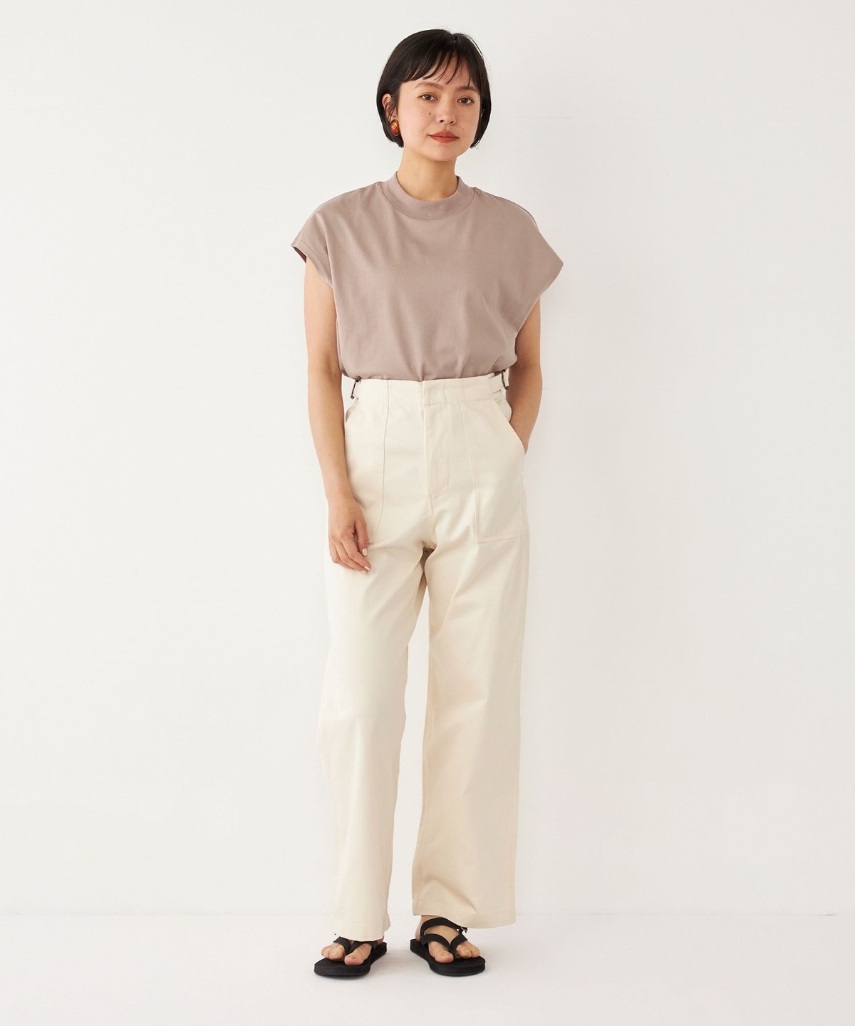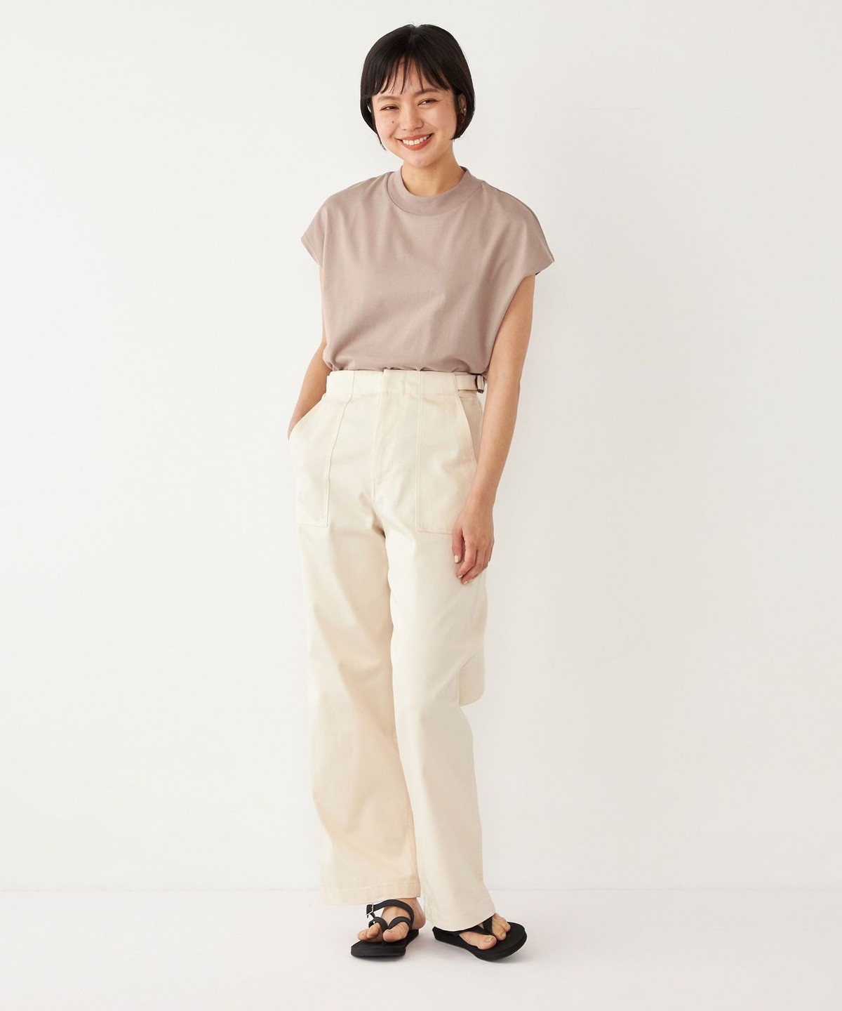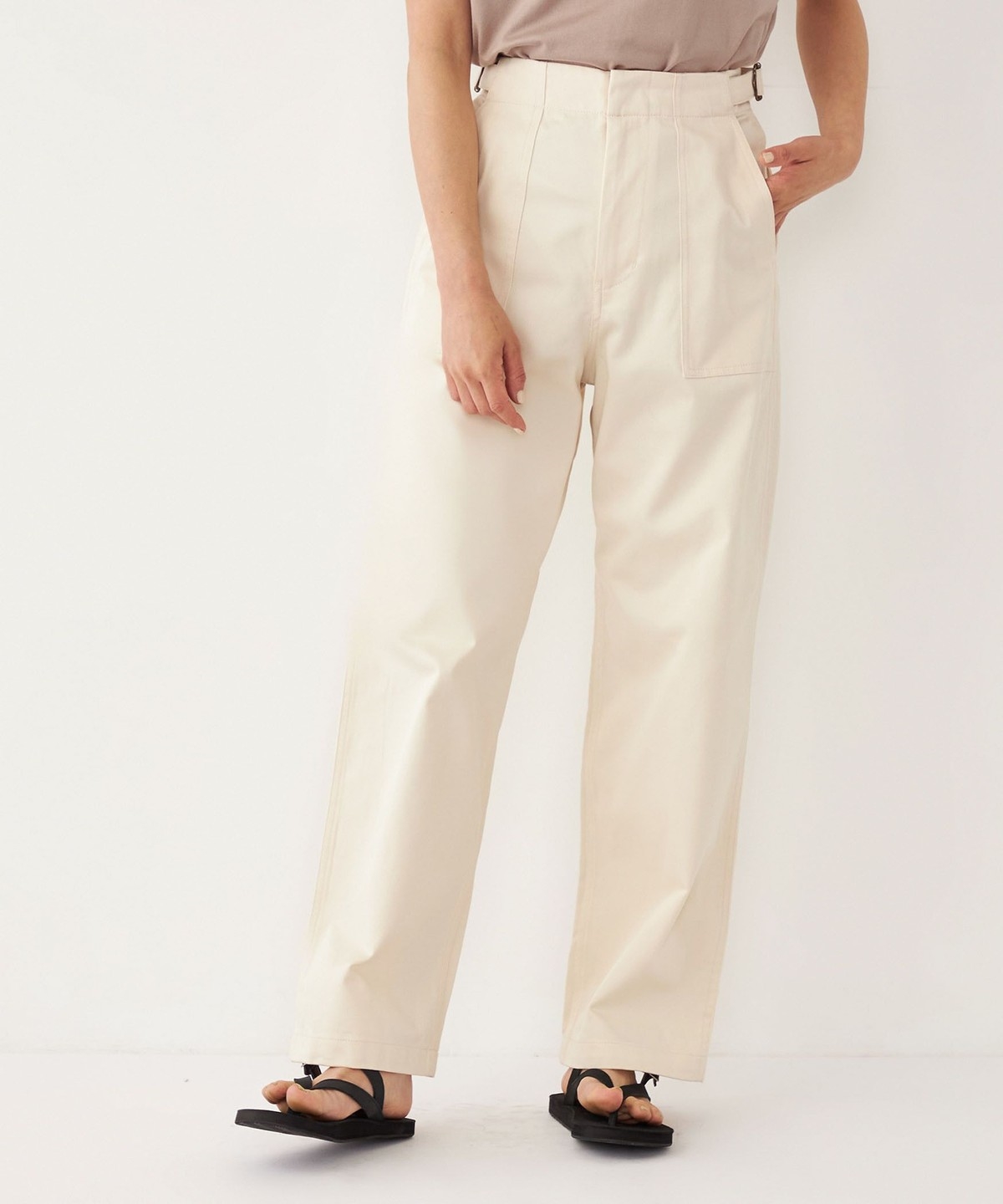 ウエストのサイドベルトがさりげないアクセントに。