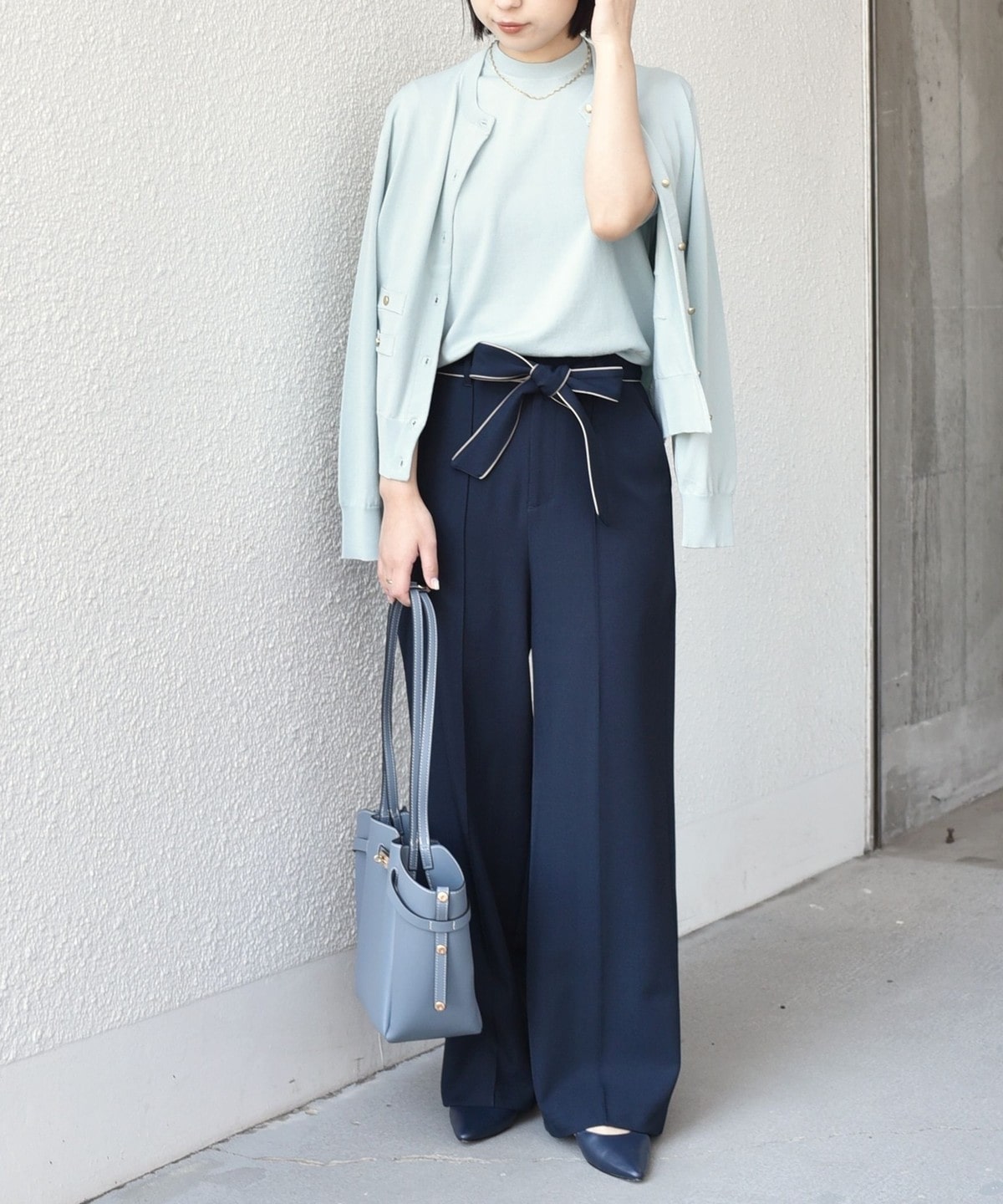 リボンを外せば、オーバーシルエットのトップスやシャツなど、カジュアルなアイテムとも好相性です。