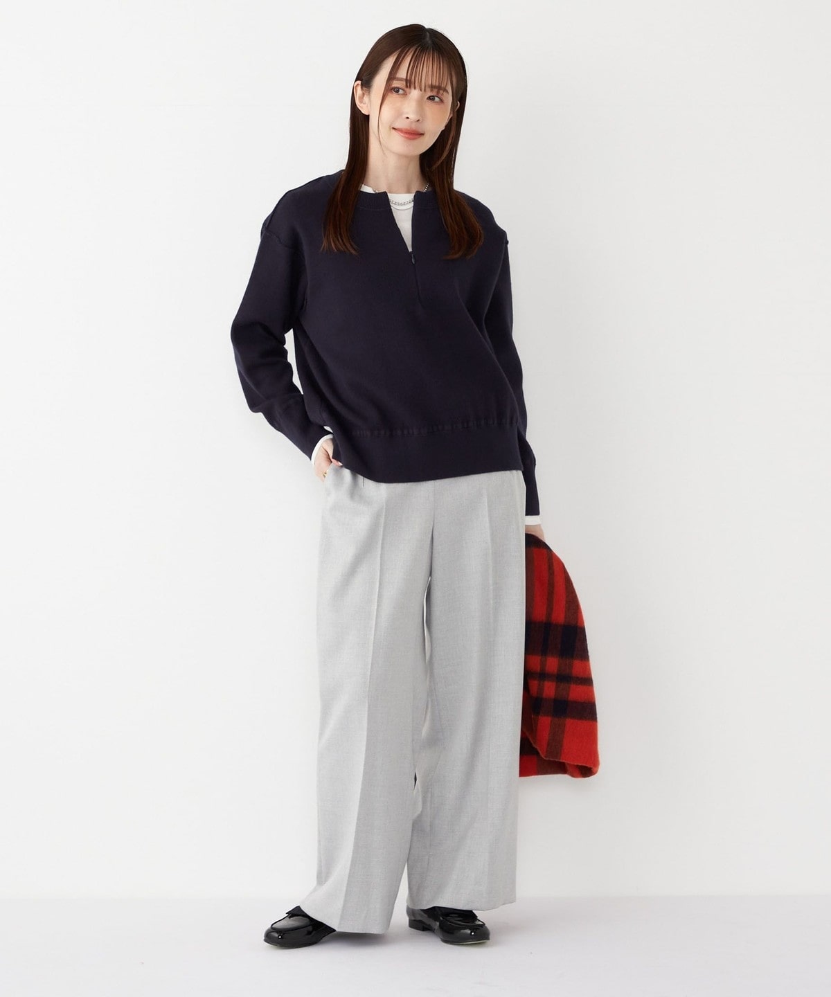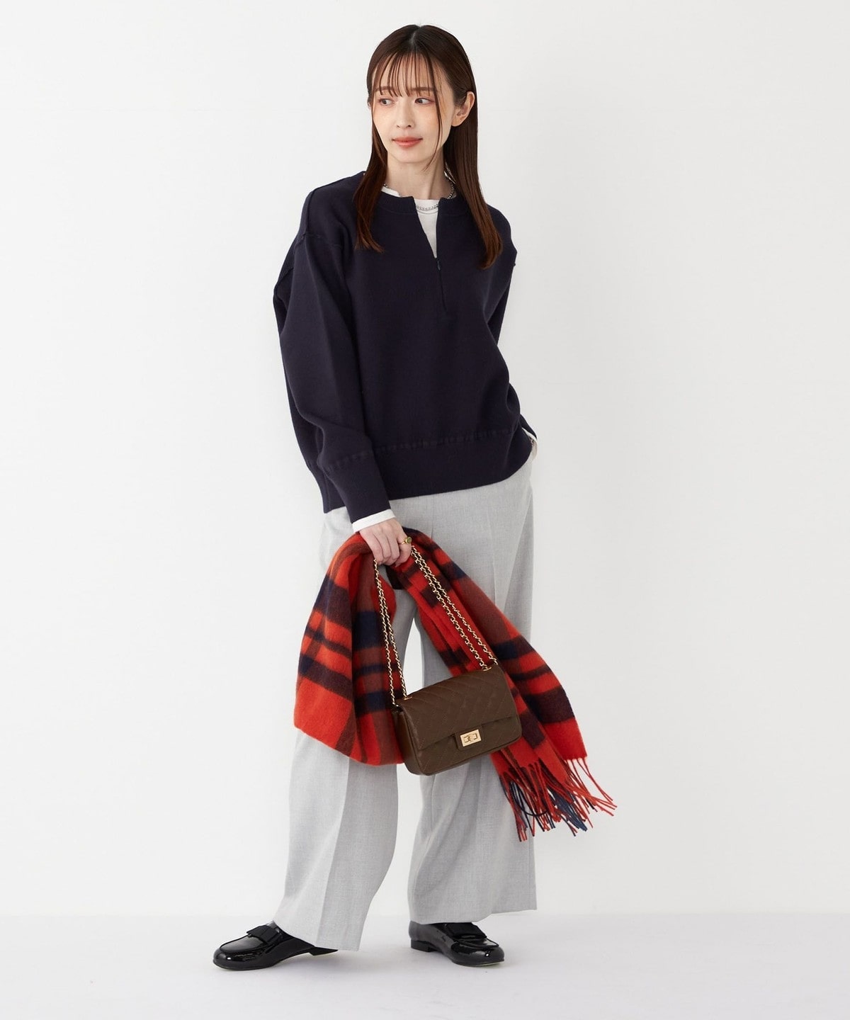 ニットやスウェットと合わせてカジュアルに、ブラウスやジャケットと合わせて通勤にも◎