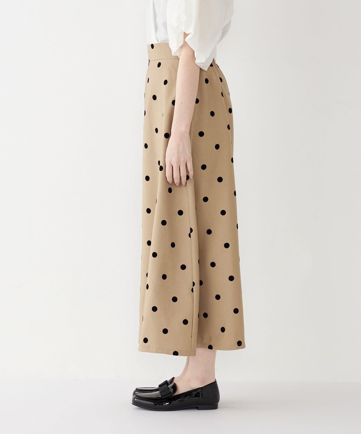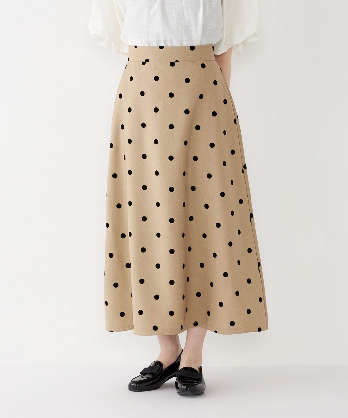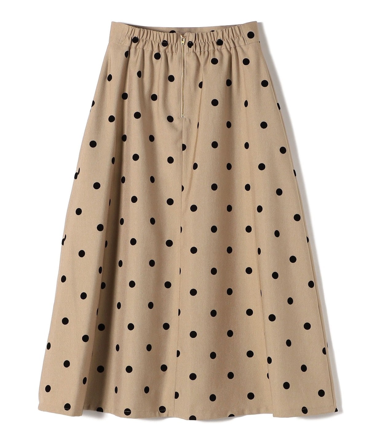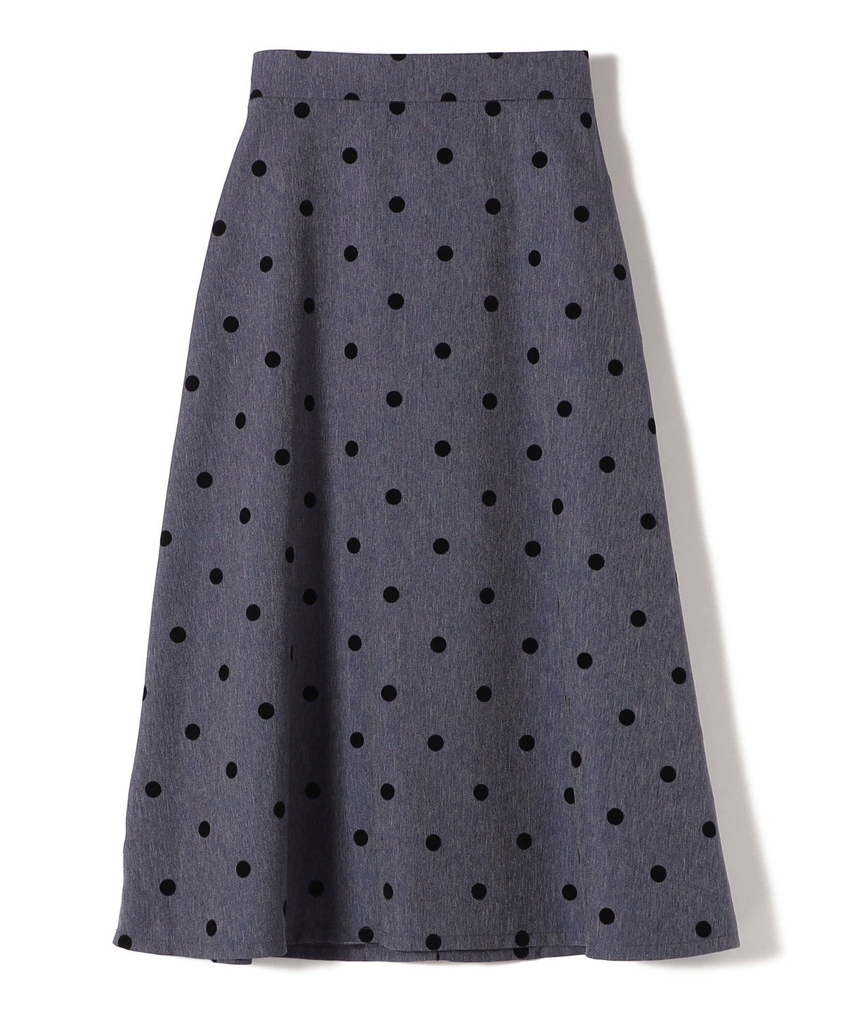 デニムのような風合いの生地が特徴の、ドット柄のフレアスカート。