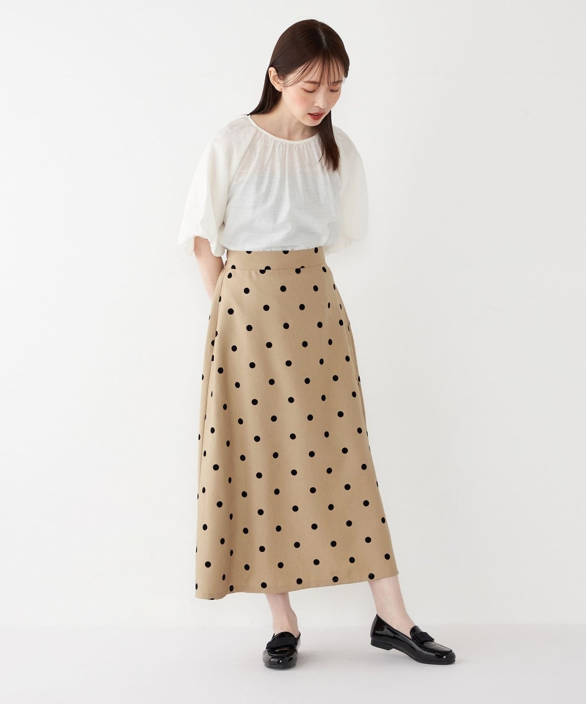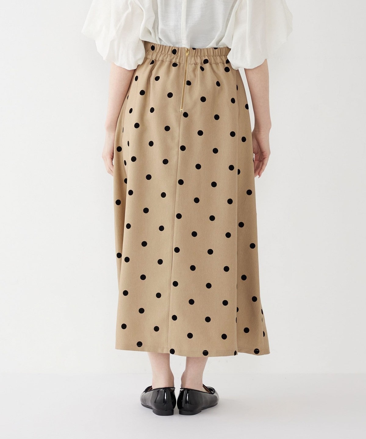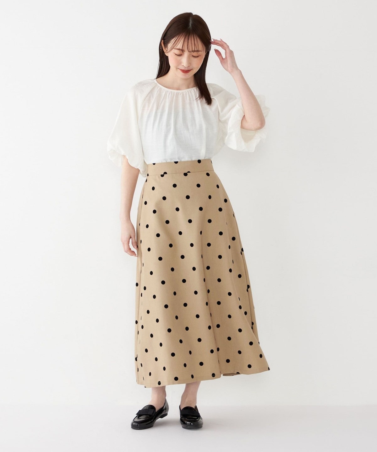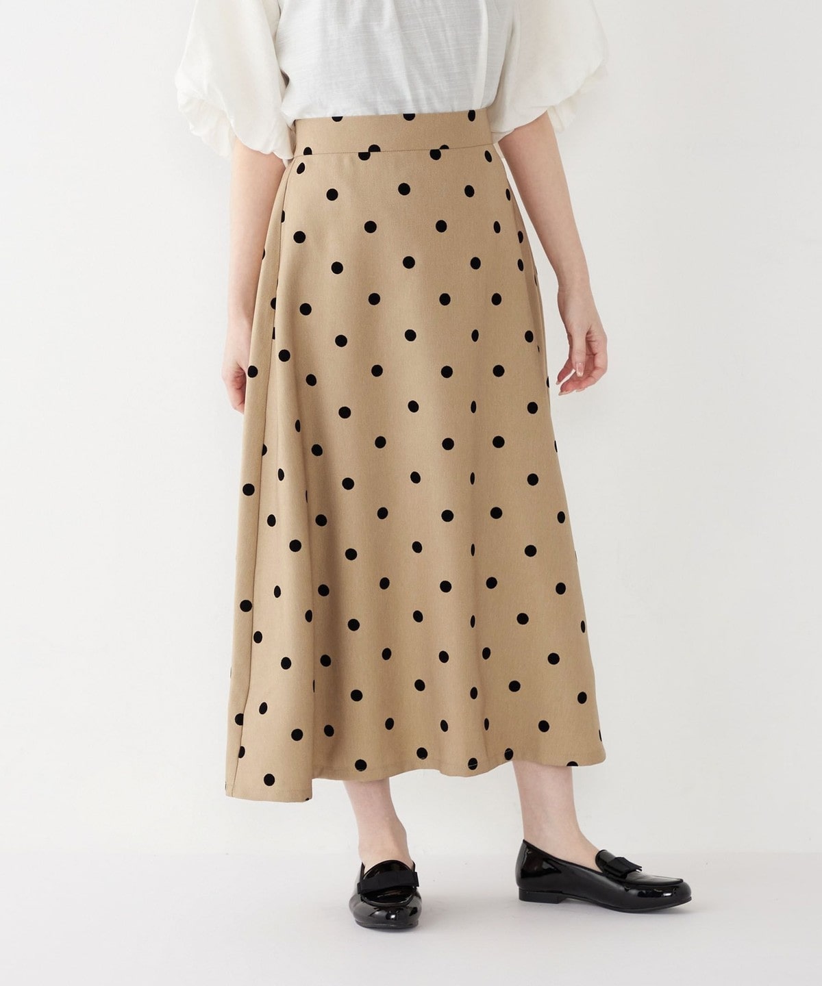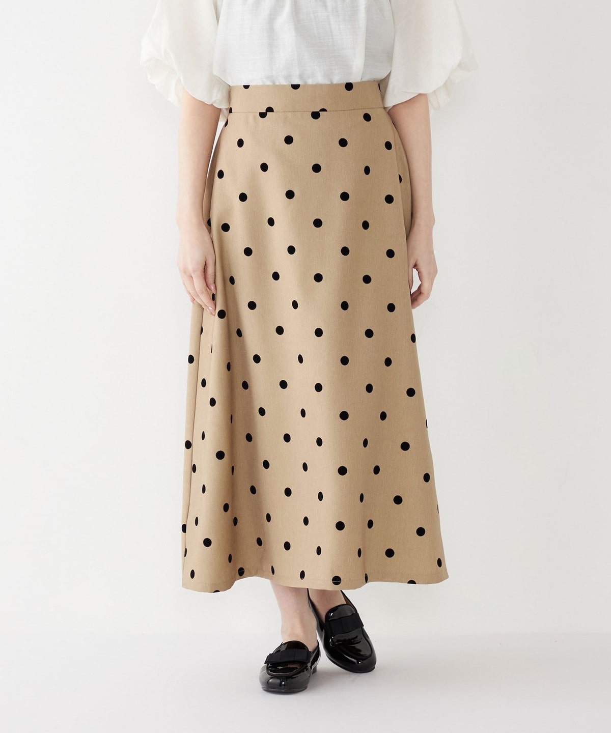 デニムのような風合いの生地が特徴の、ドット柄のフレアスカート。