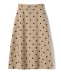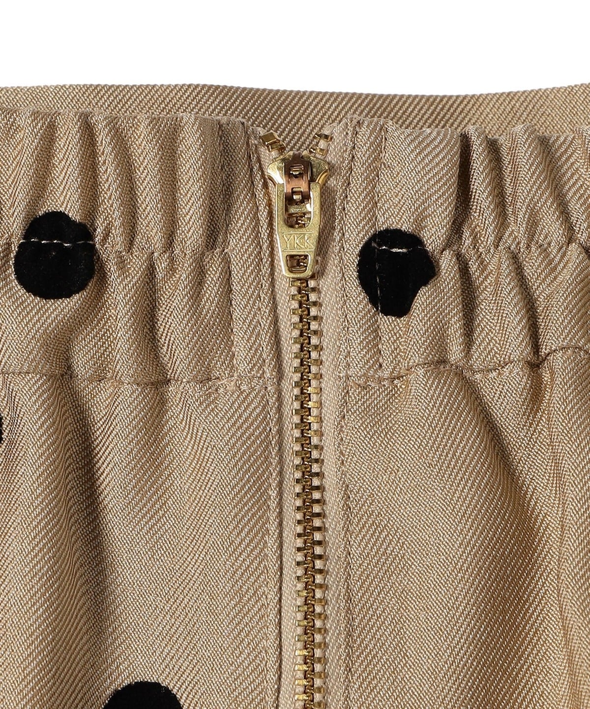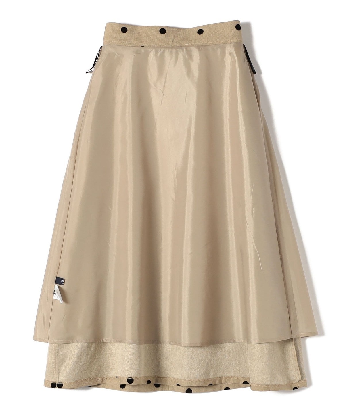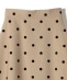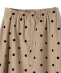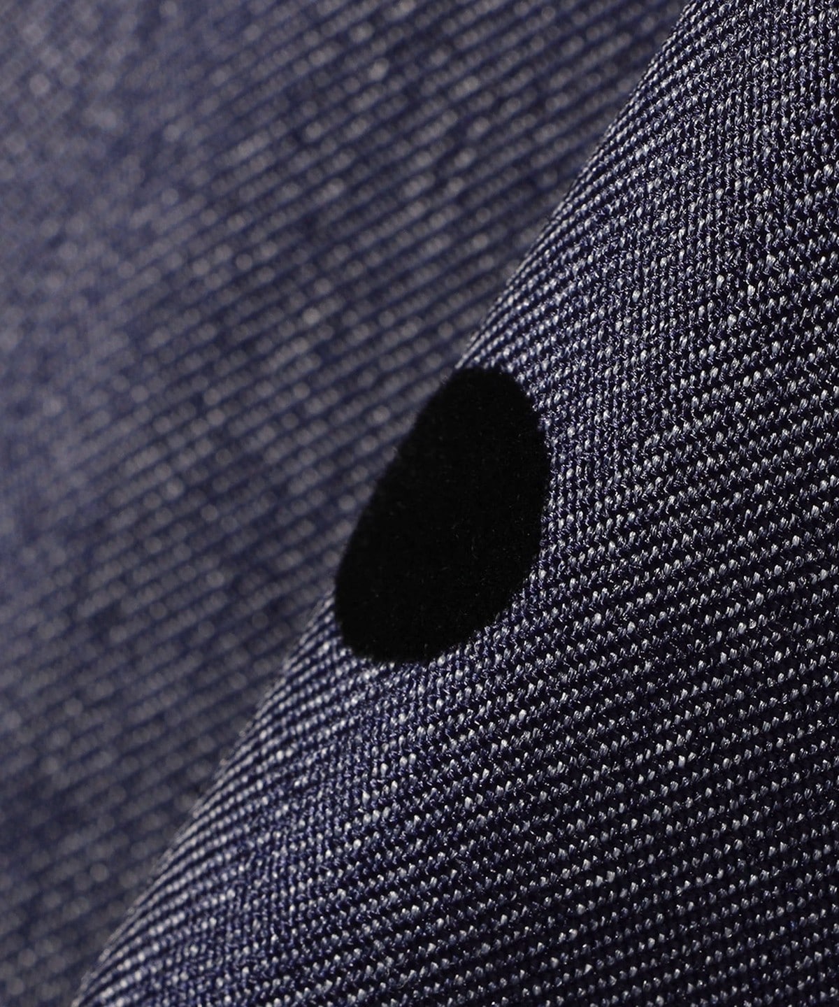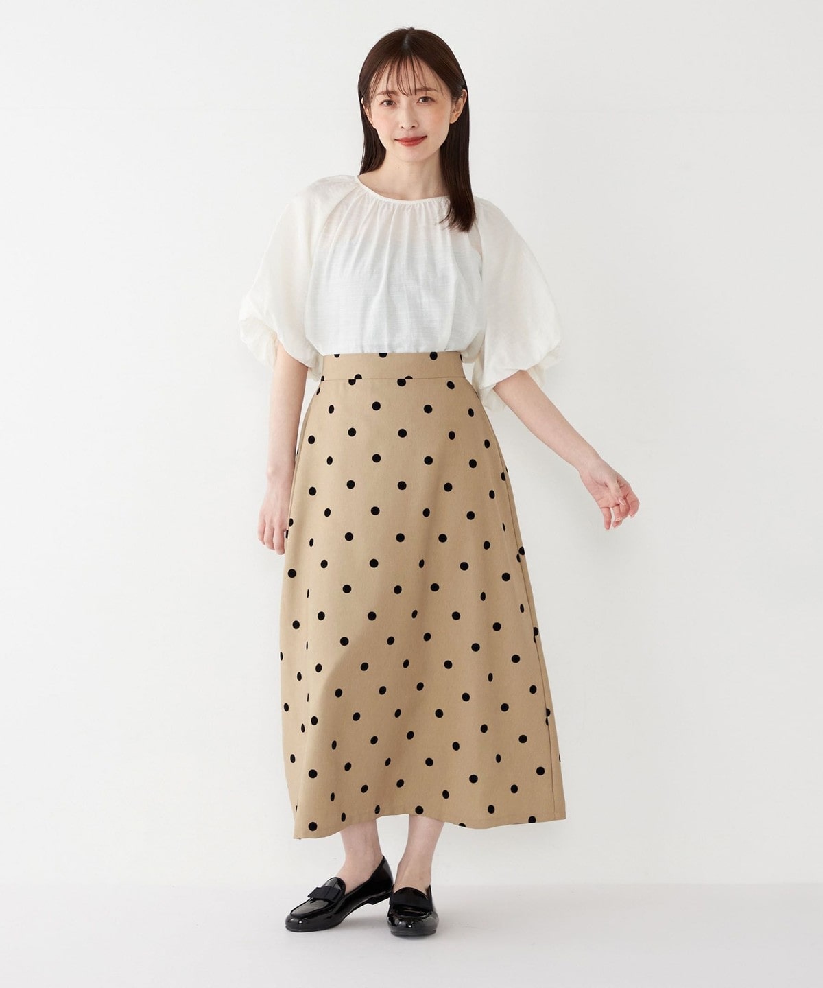 デニムのような風合いの生地が特徴の、ドット柄のフレアスカート。