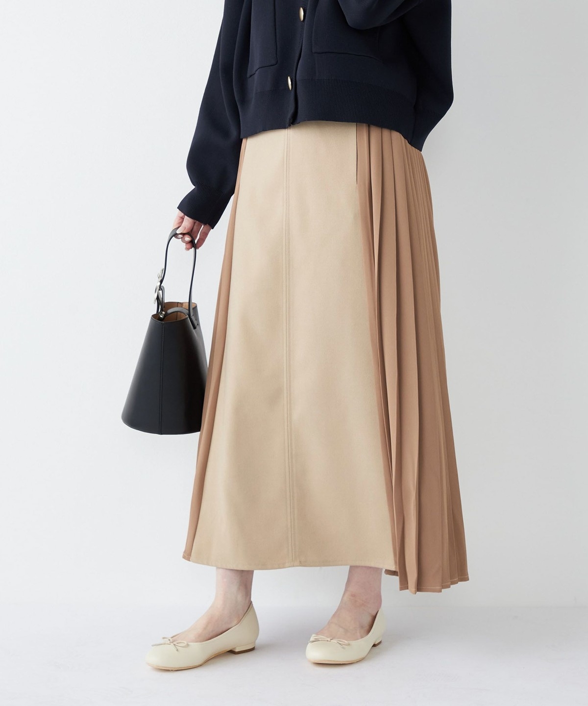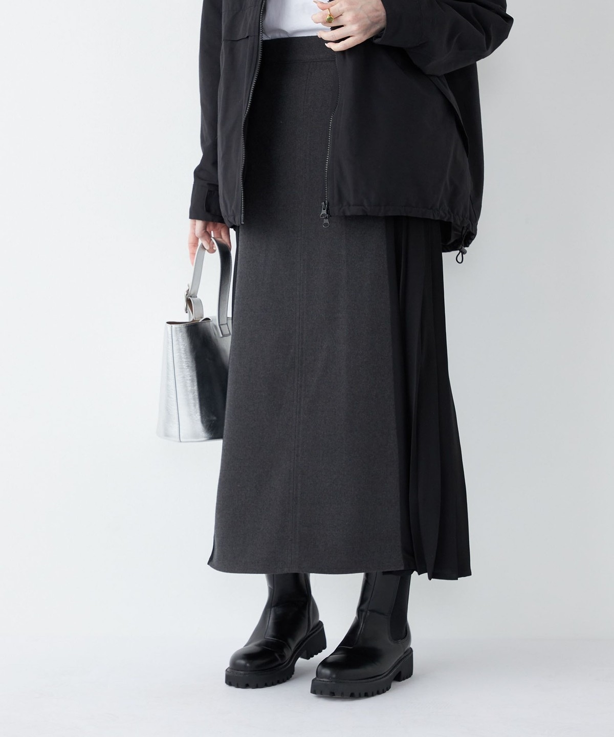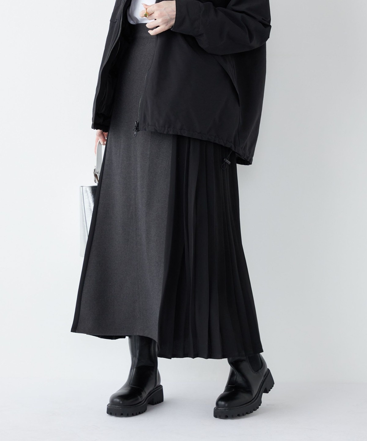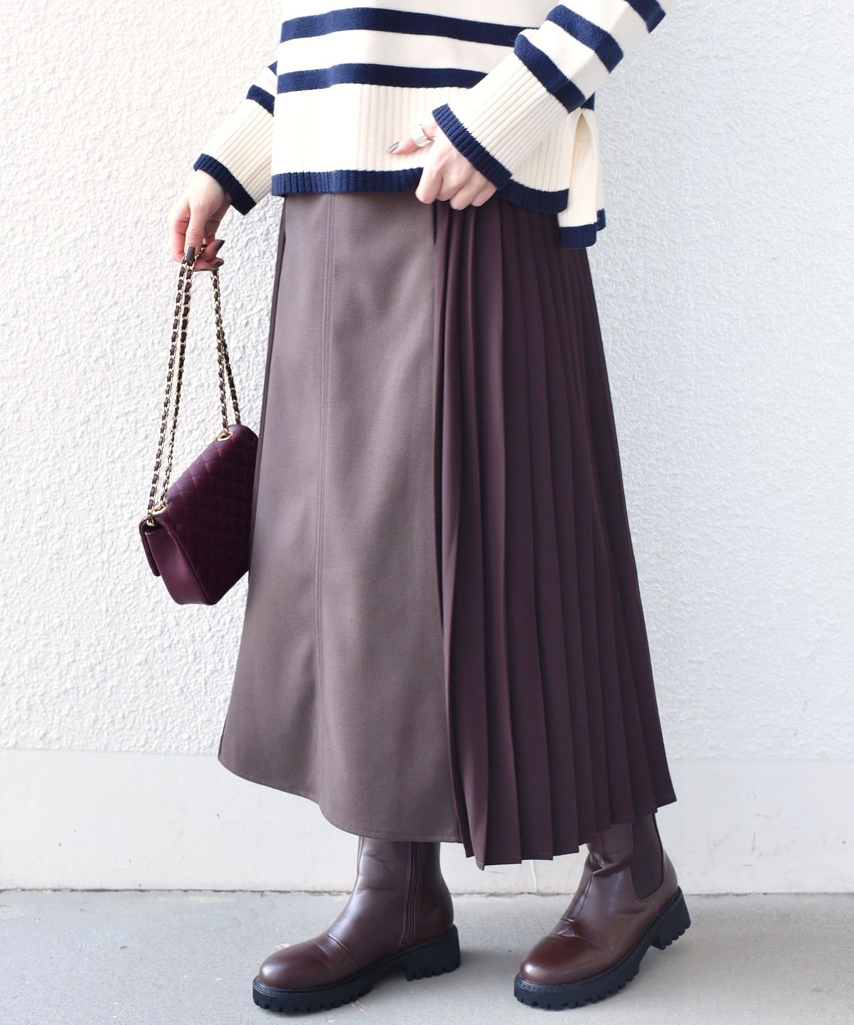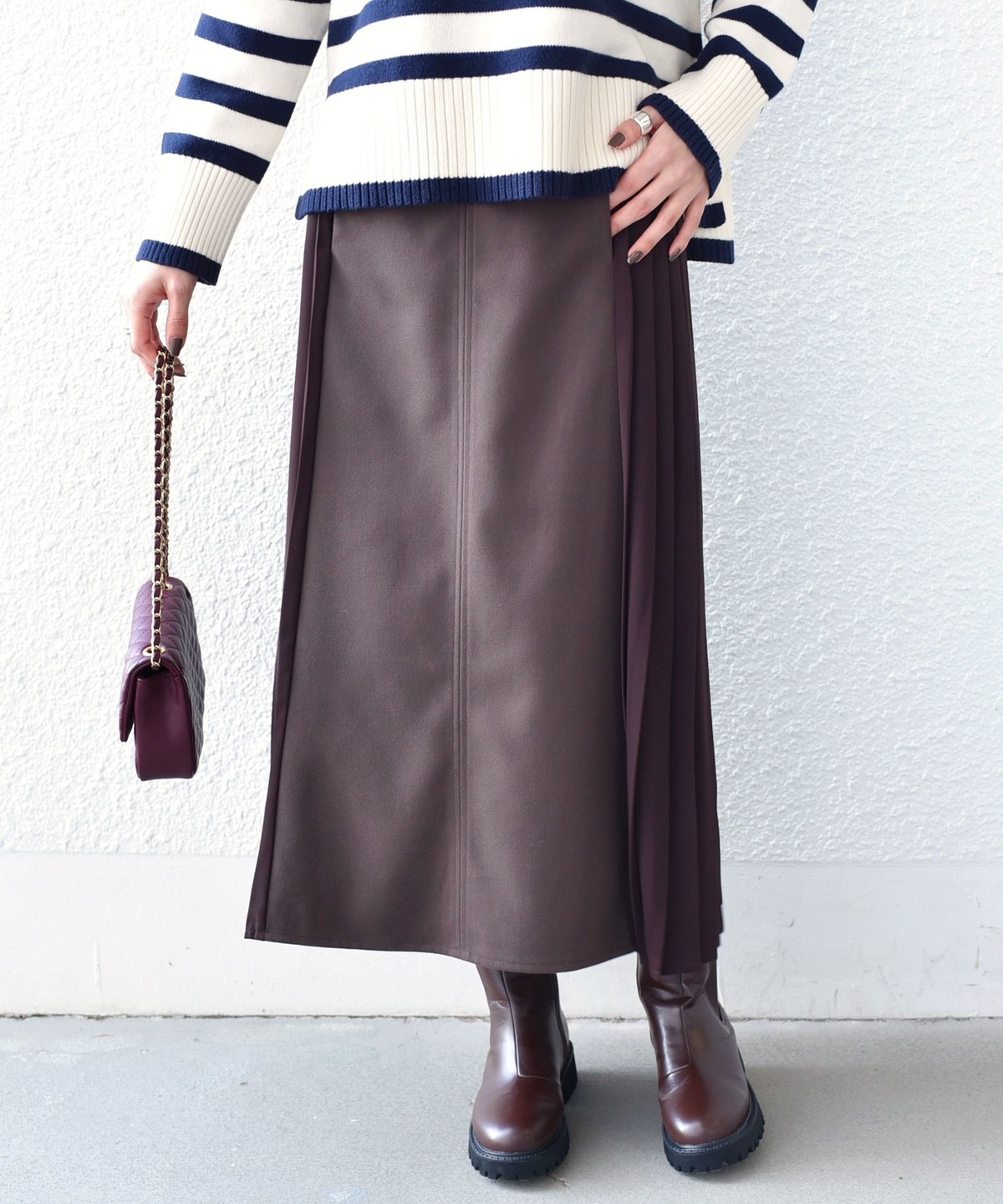 ウォーム感のある素材とプリーツをドッキングしたコンビスカート。