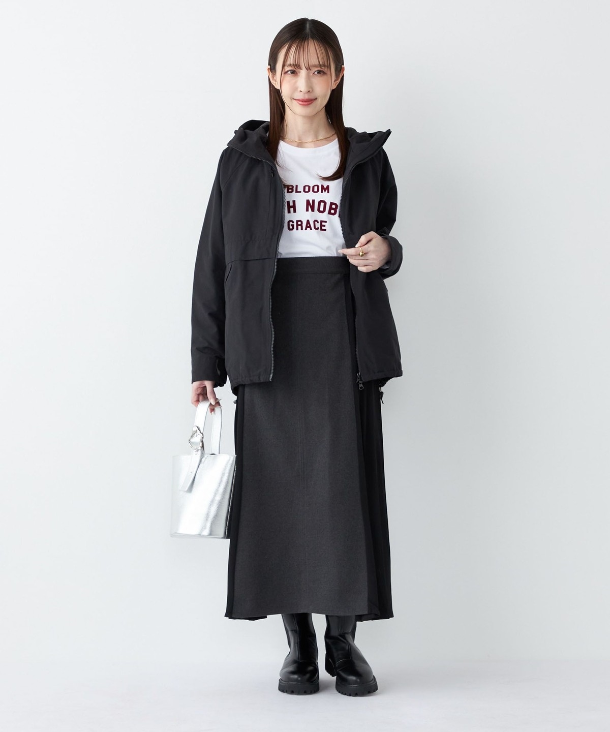 やや着丈が長めのシルエットなので、短めのトップスと合わせるとすっきり着ていただけます。