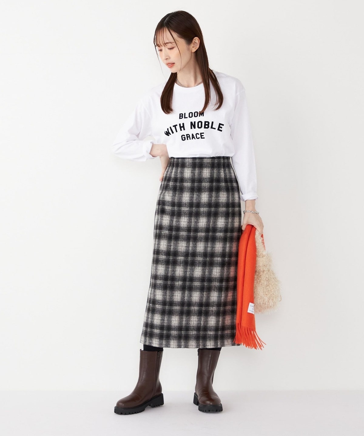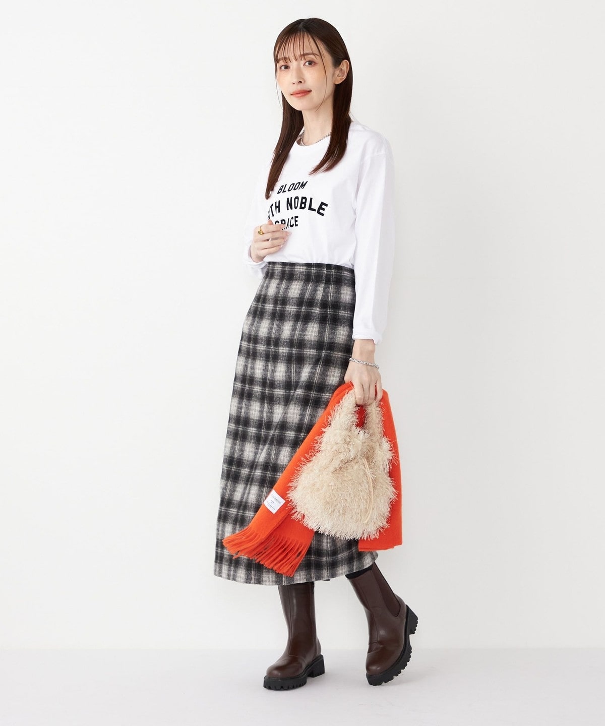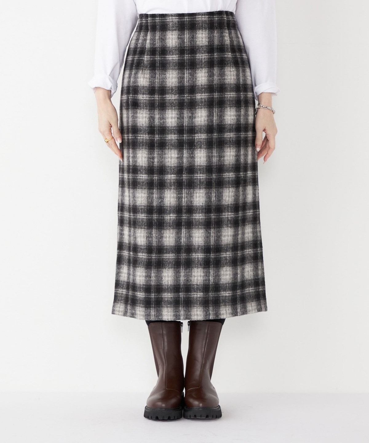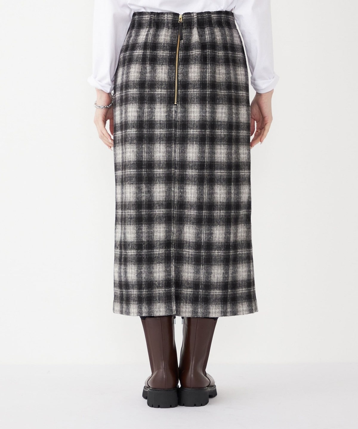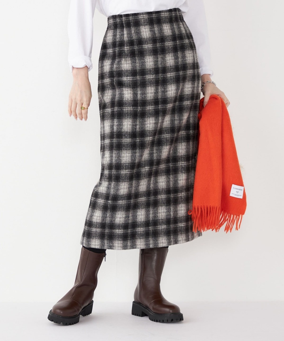 秋冬のムードを高める、起毛素材のチェック柄スカート。