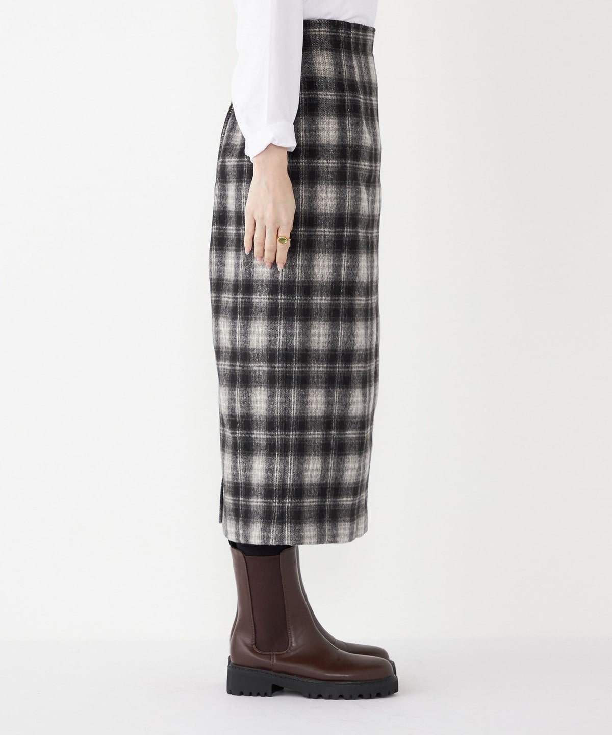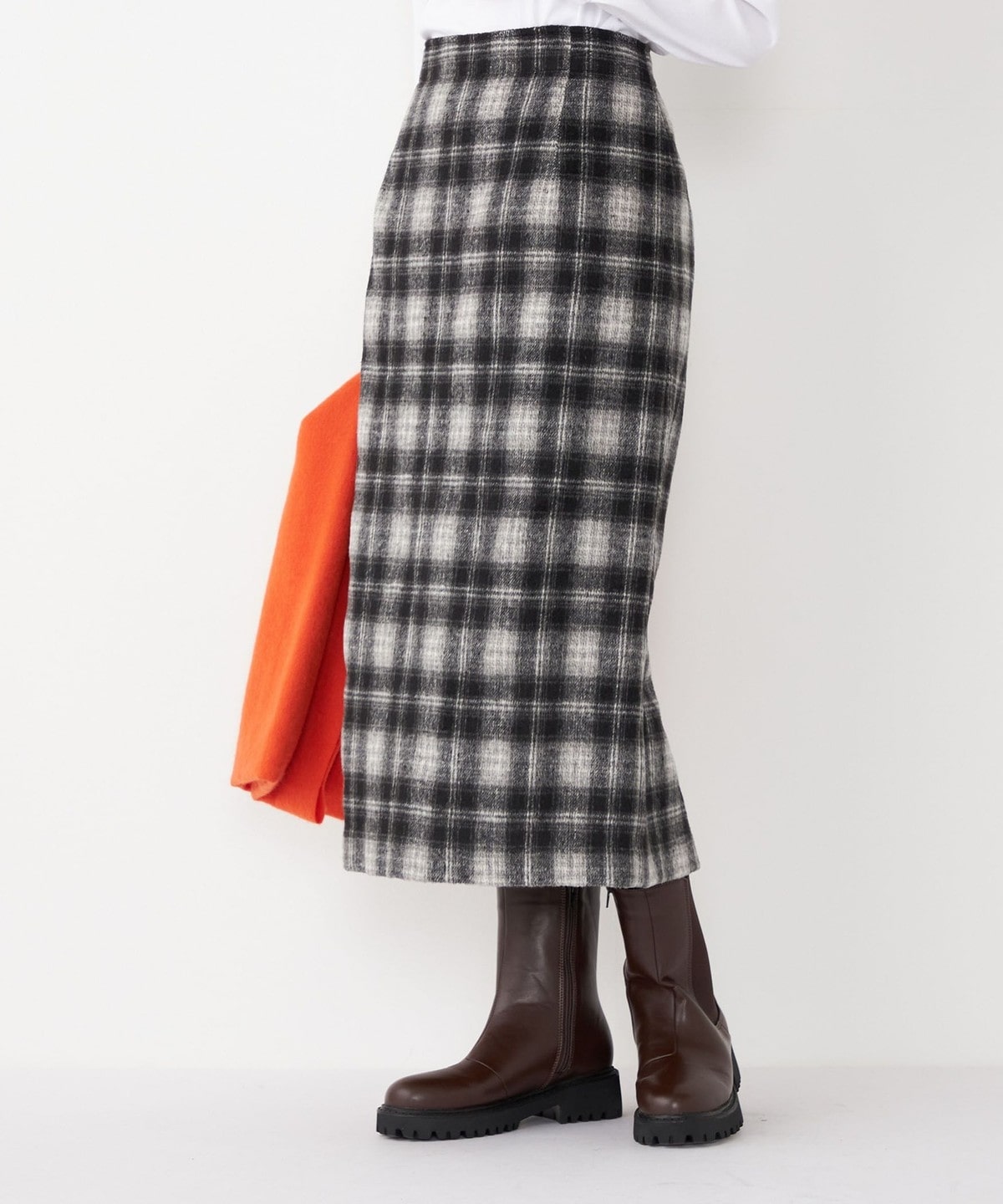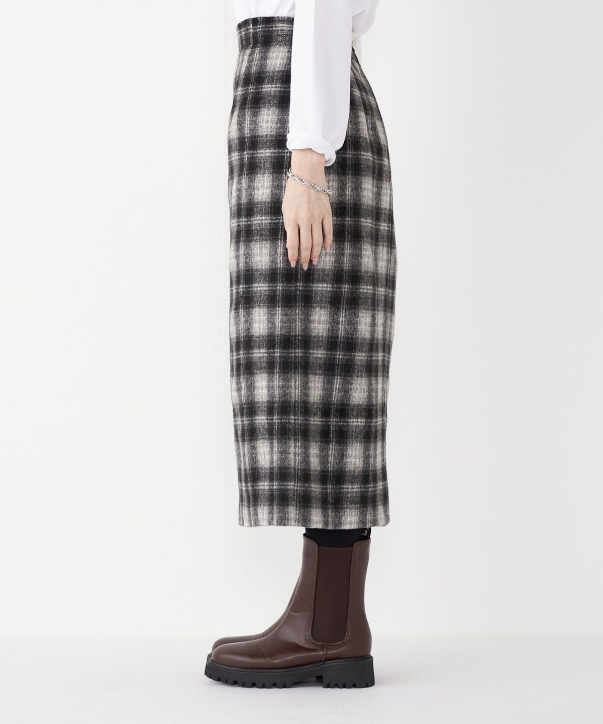 これからの季節に取り入れたくなるチェック柄のタイトスカート。