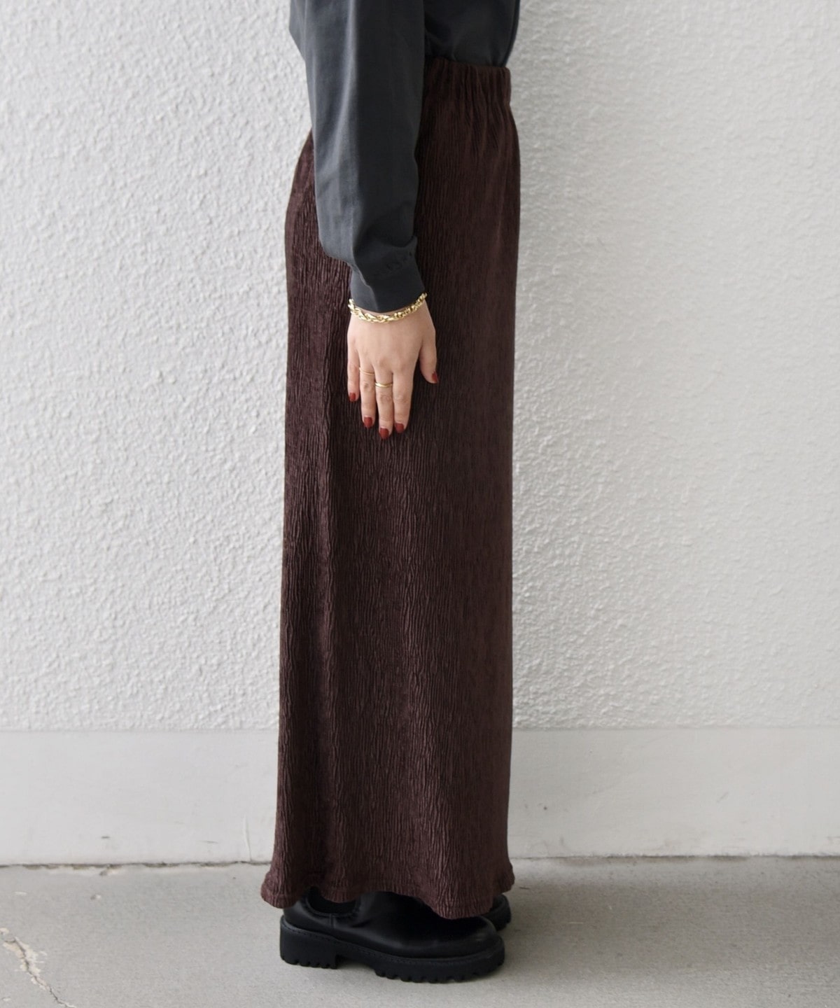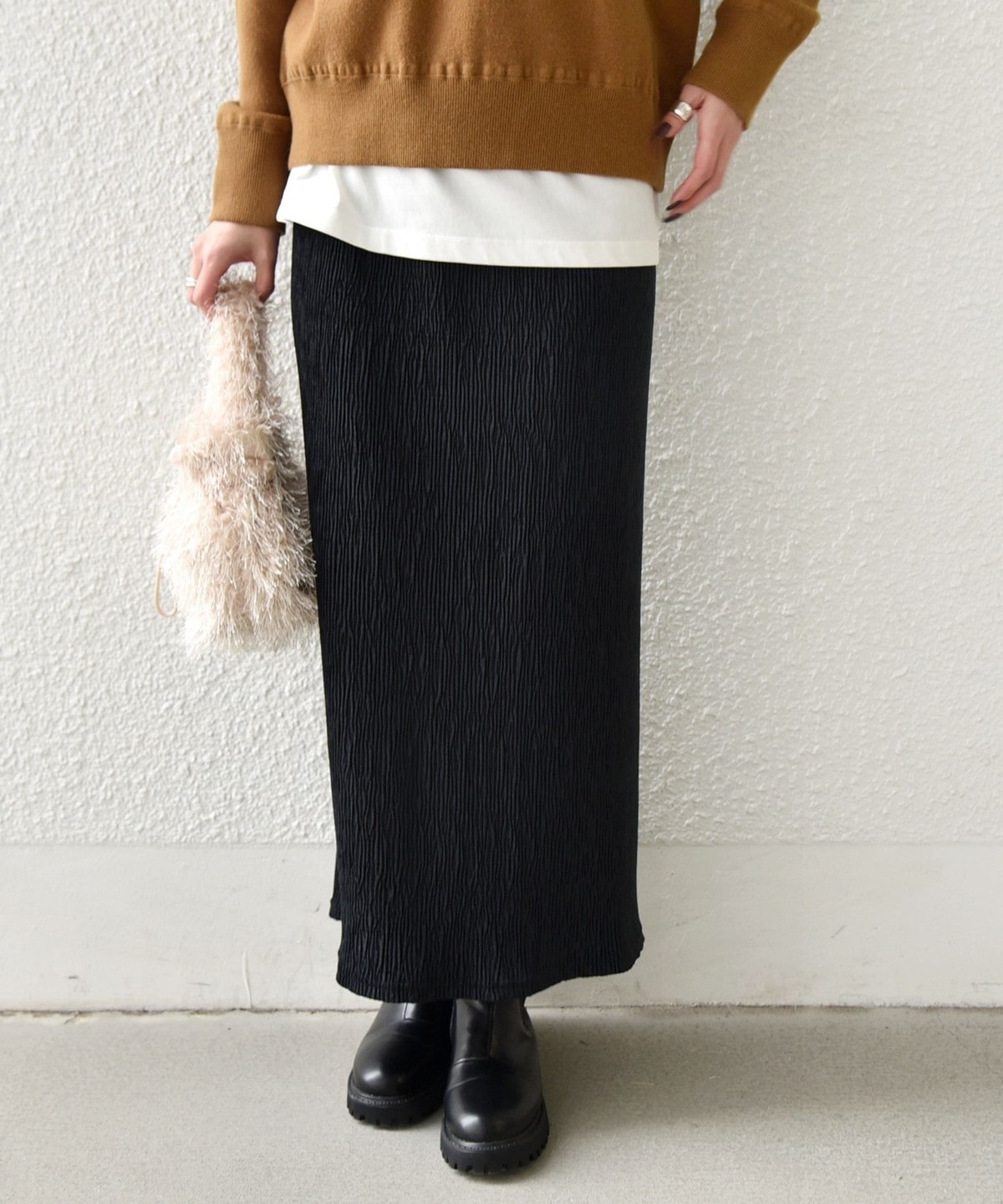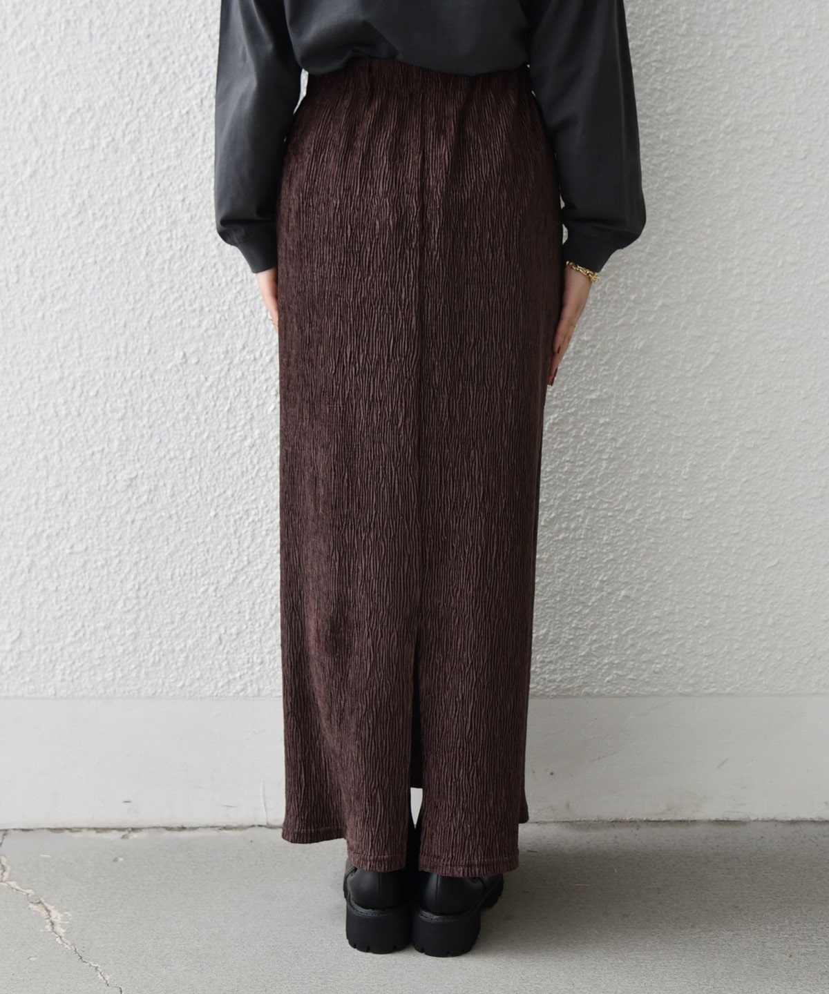 細かなプリーツが施されたタイトスカート。