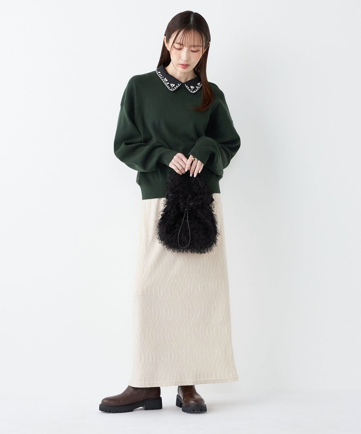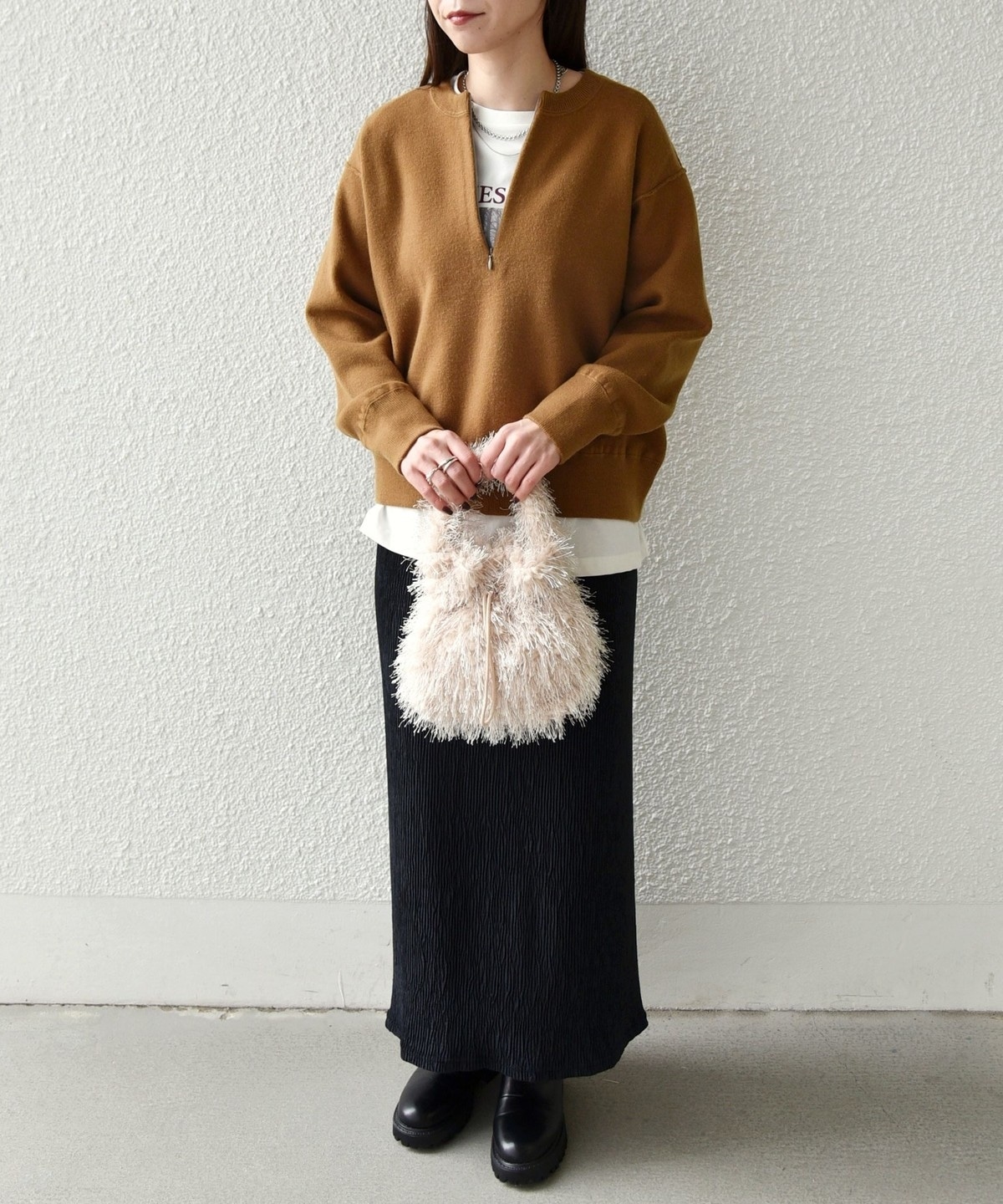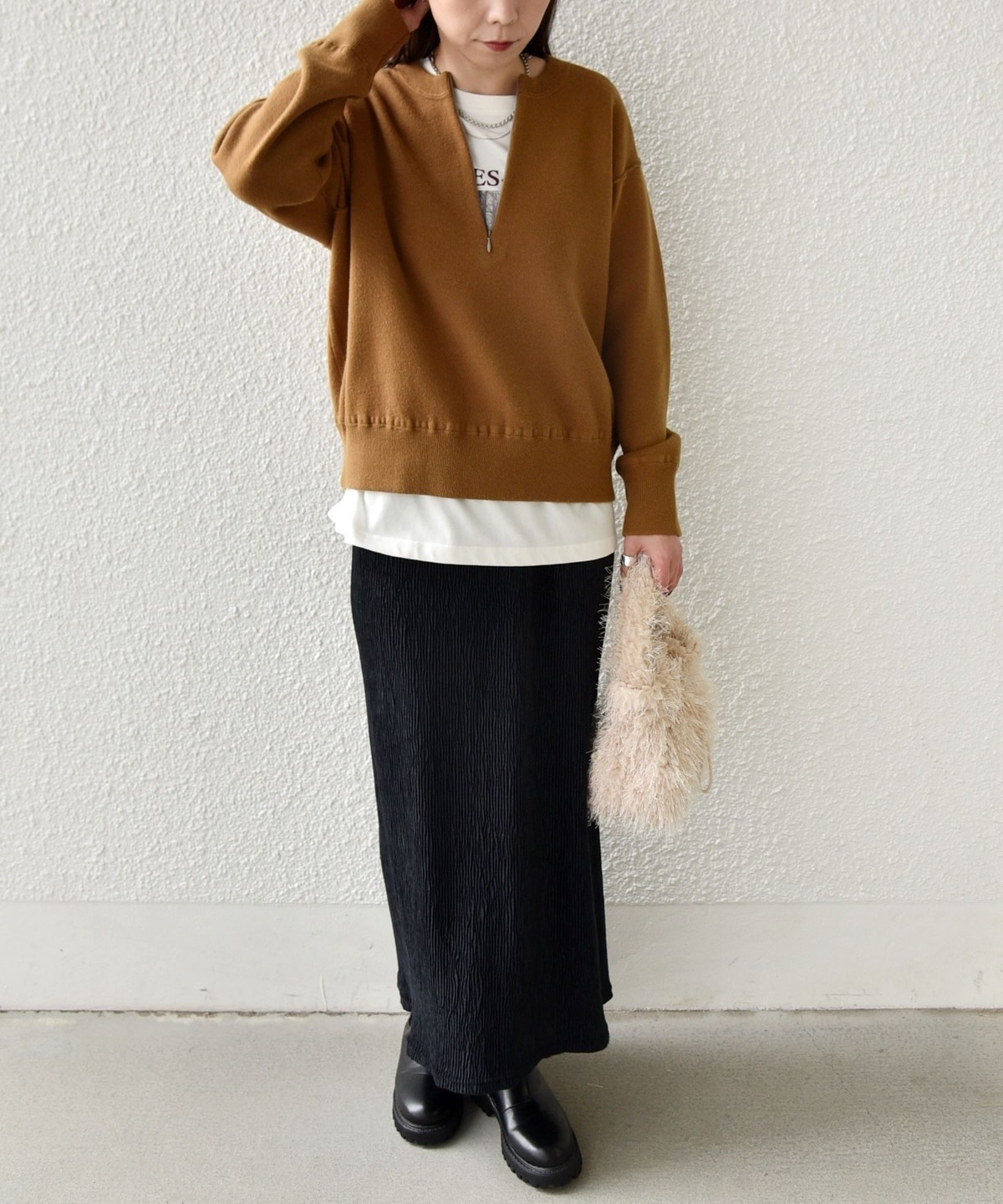 ブラックやブラウンはベーシックで着こなしやすく、オフホワイトとピンクは冬の差し色として華やかさをプラスしてくれます。