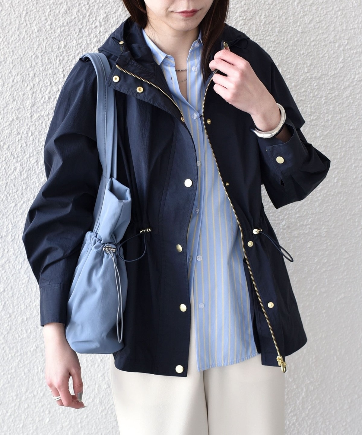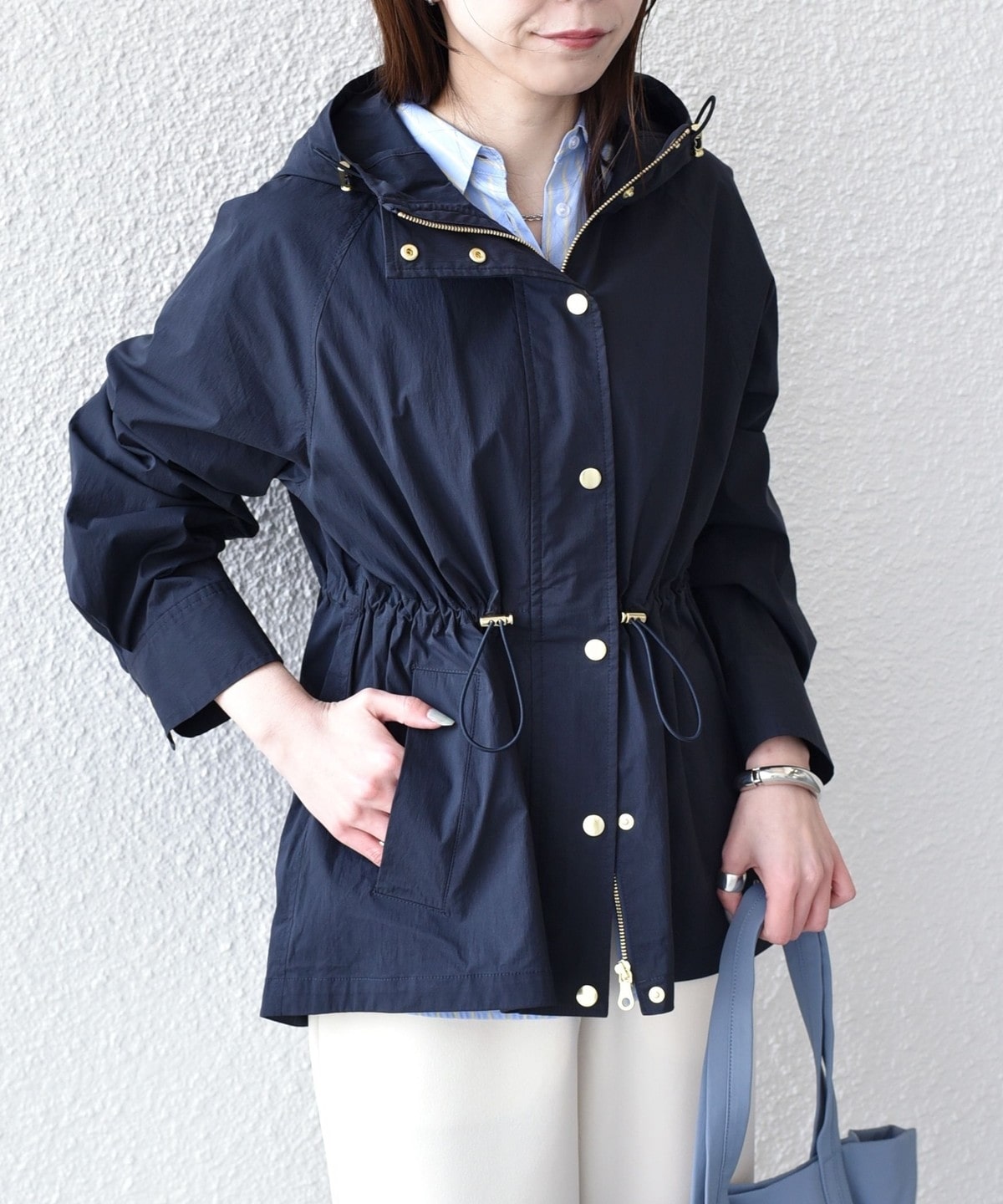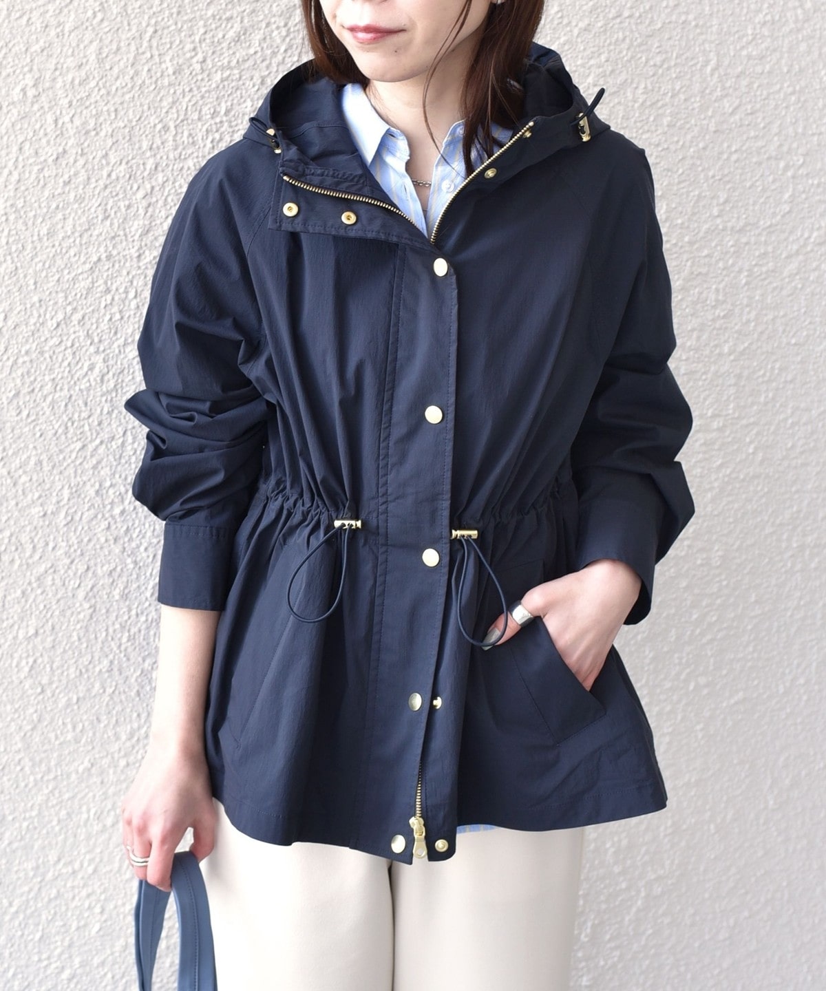 ゴールドカラーのボタンや金具が、さりげなく女性らしい上品さをプラスしてくれます。
