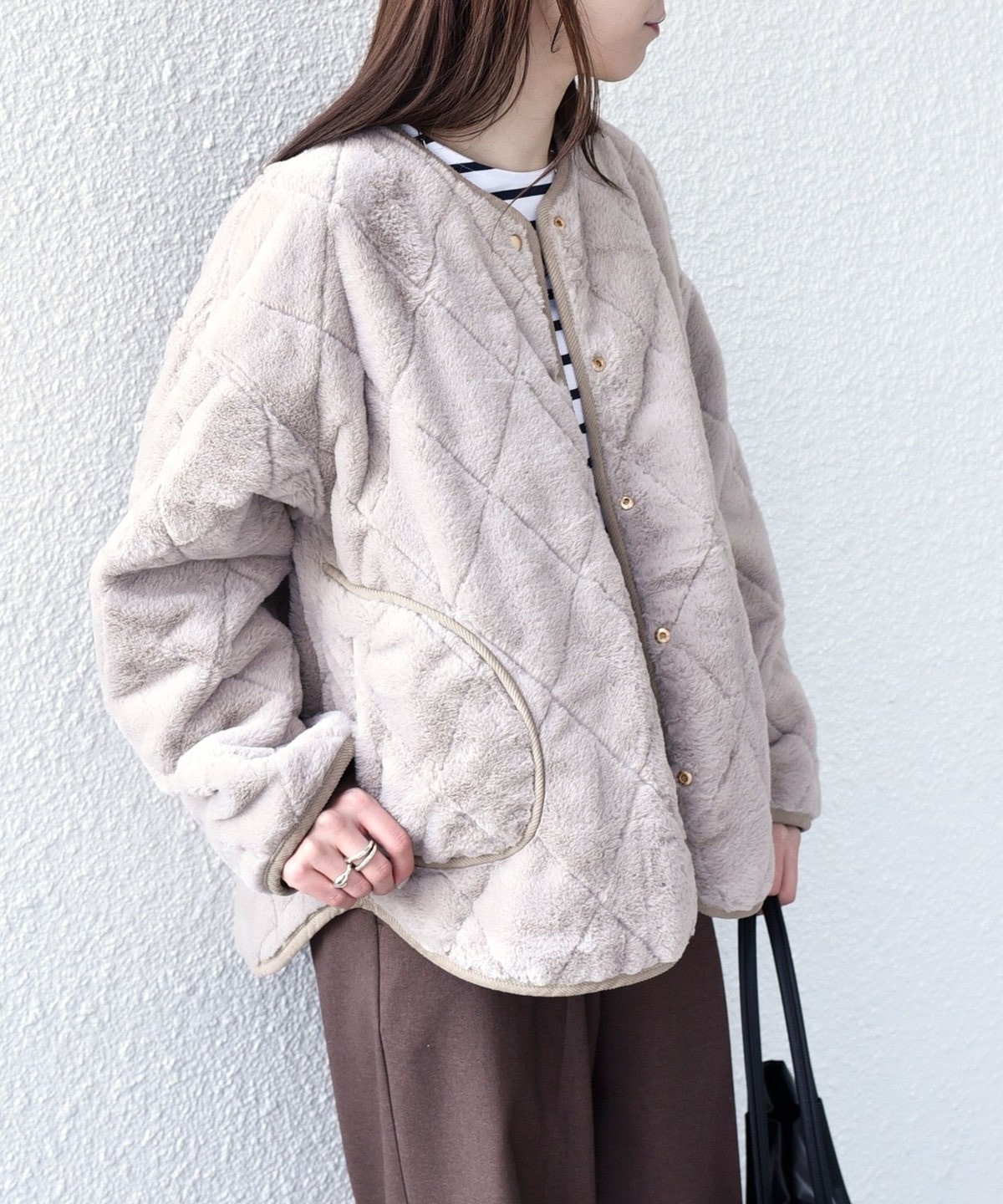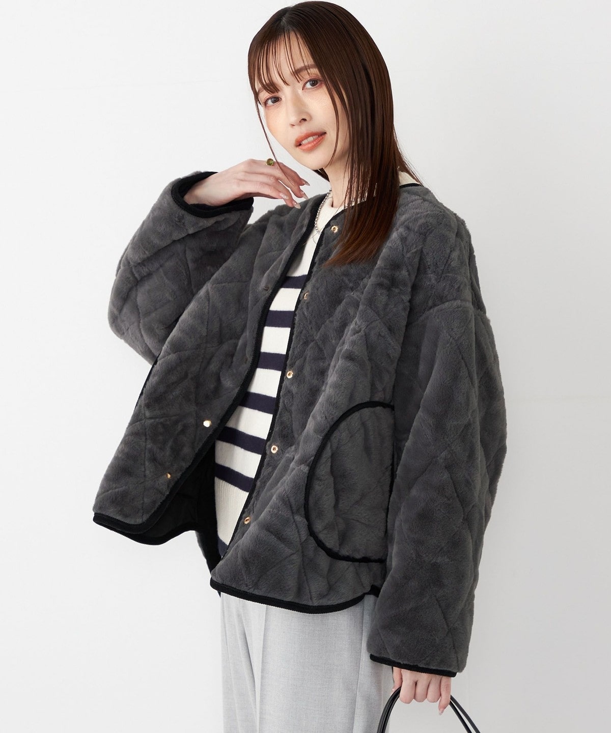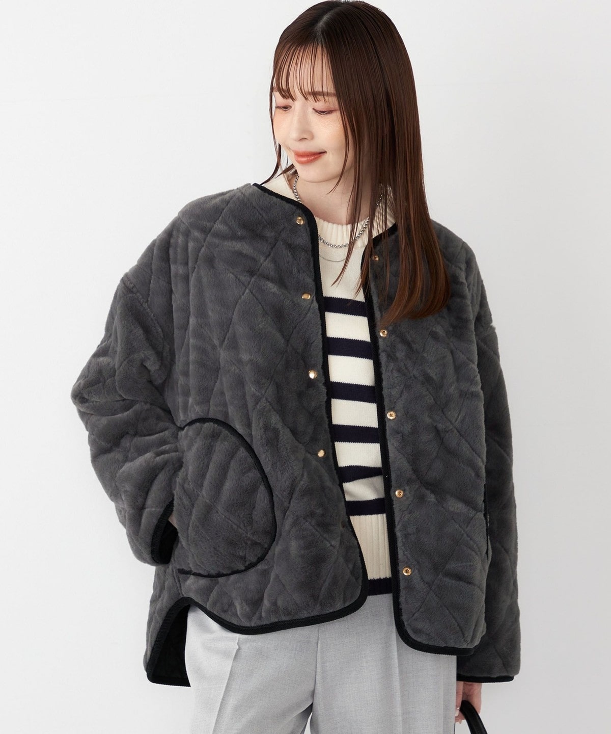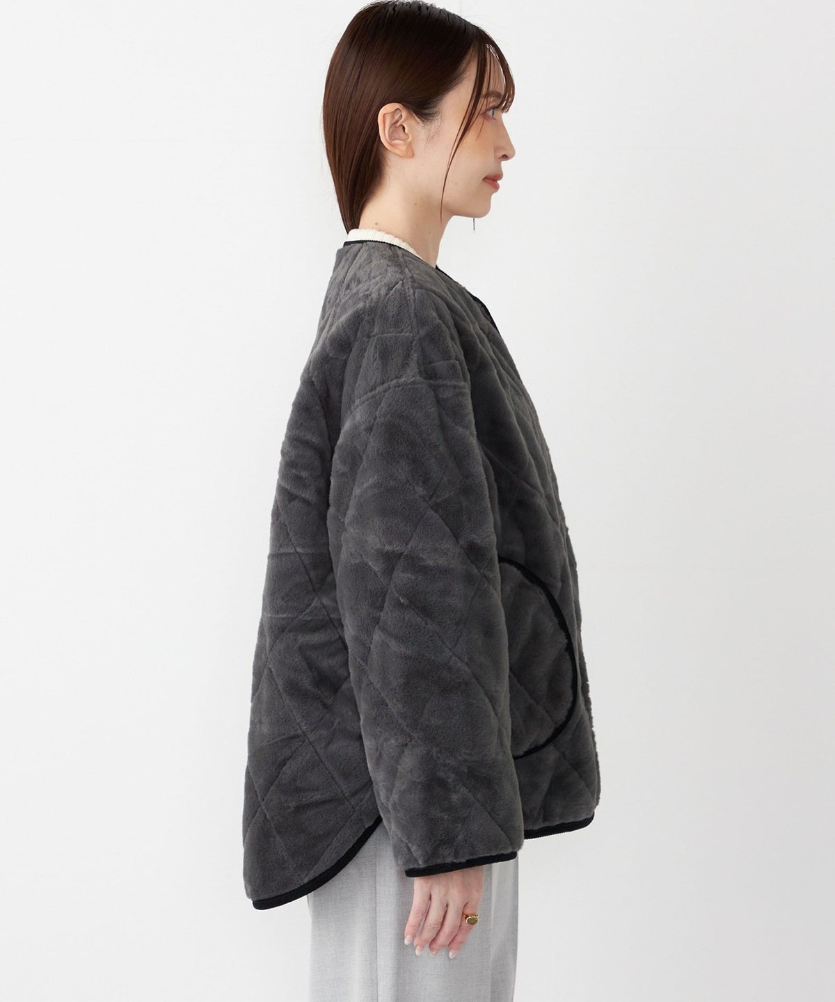 光沢感のある合繊面とフェイクファー面、表情の異なる2つの素材を楽しめるキルティングコート。