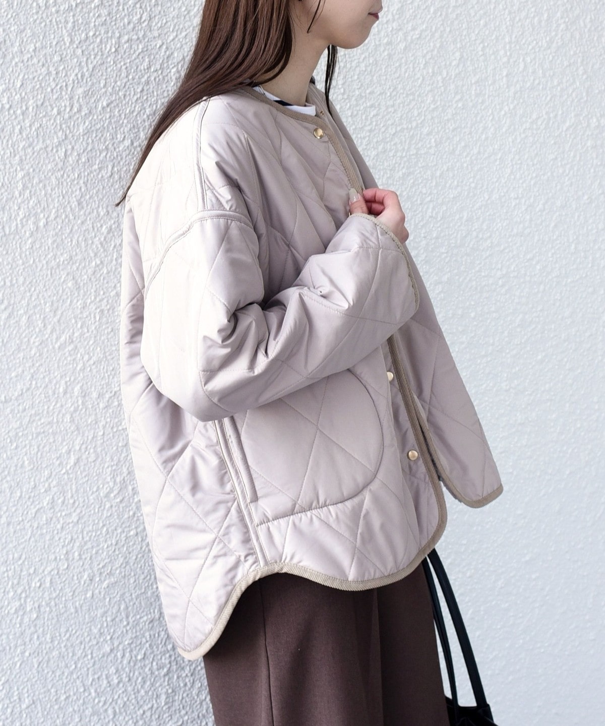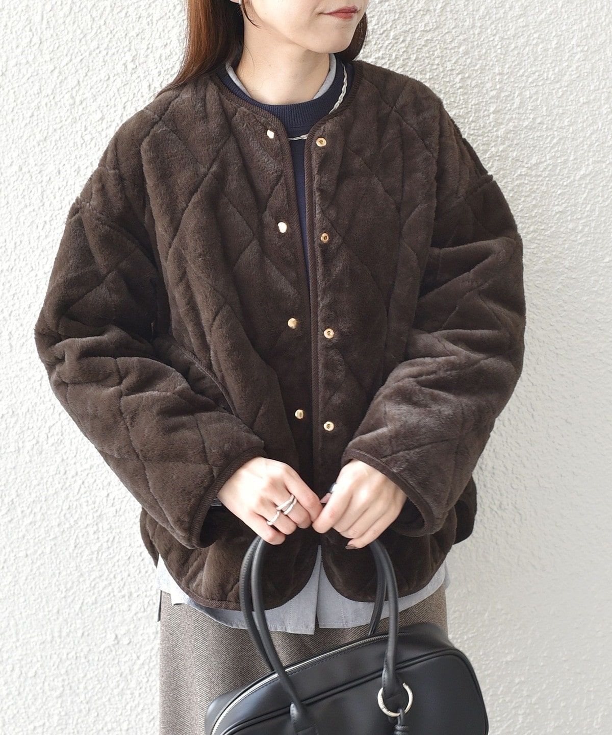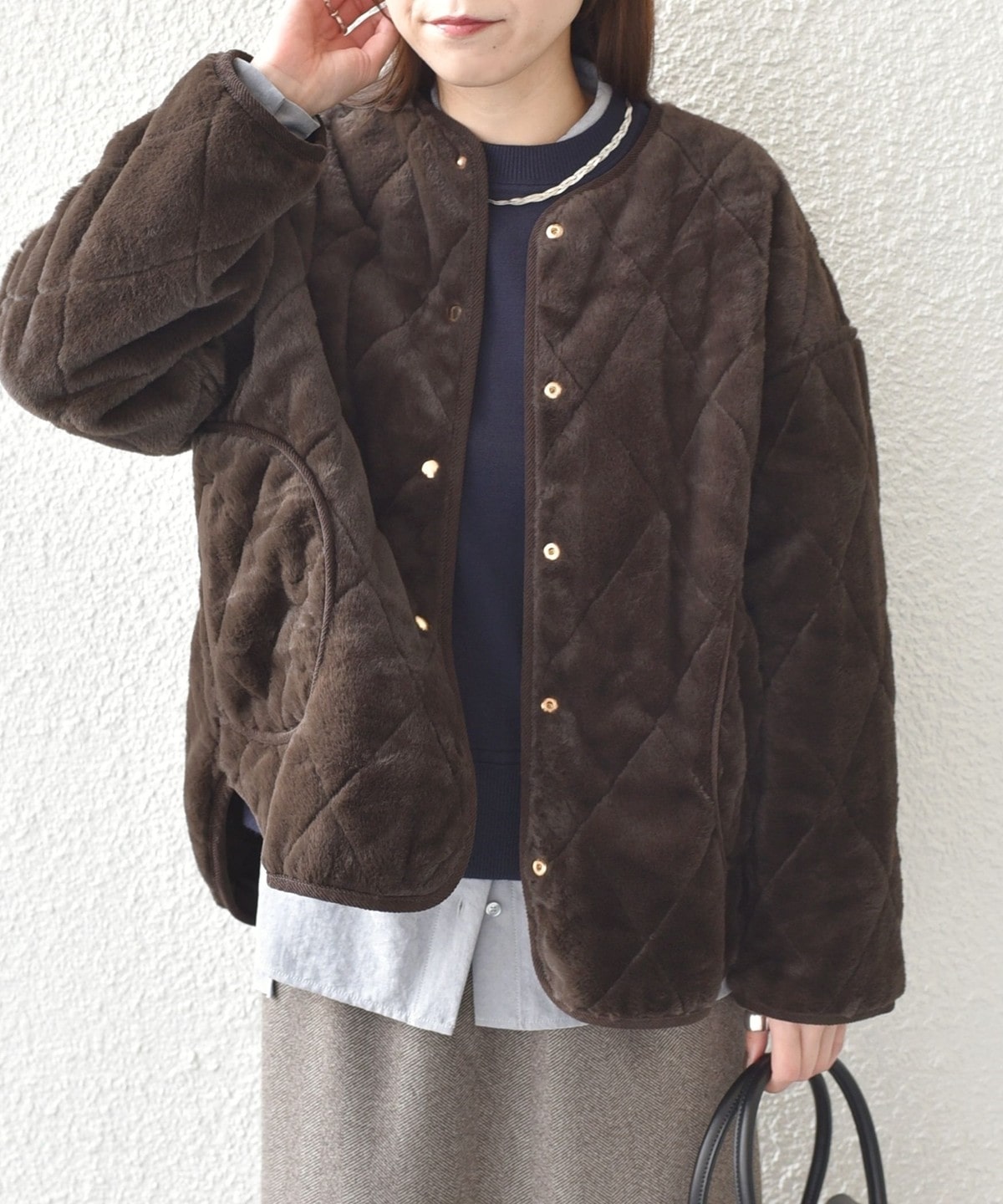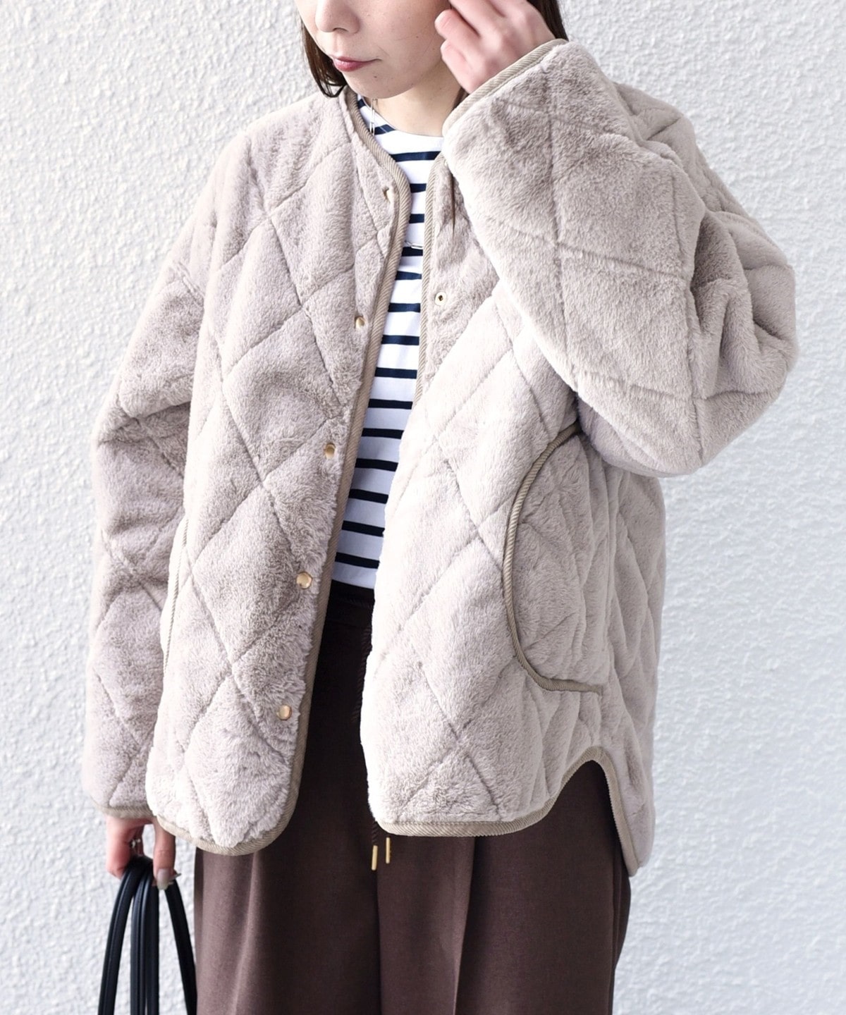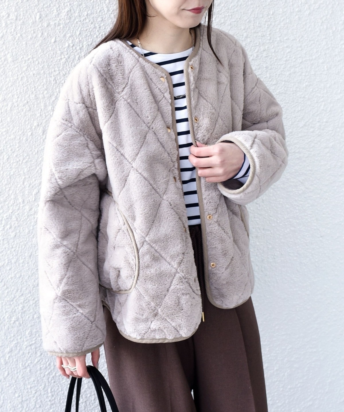 光沢感のある合繊面とフェイクファー面、表情の異なる2つの素材を楽しめるキルティングコート。