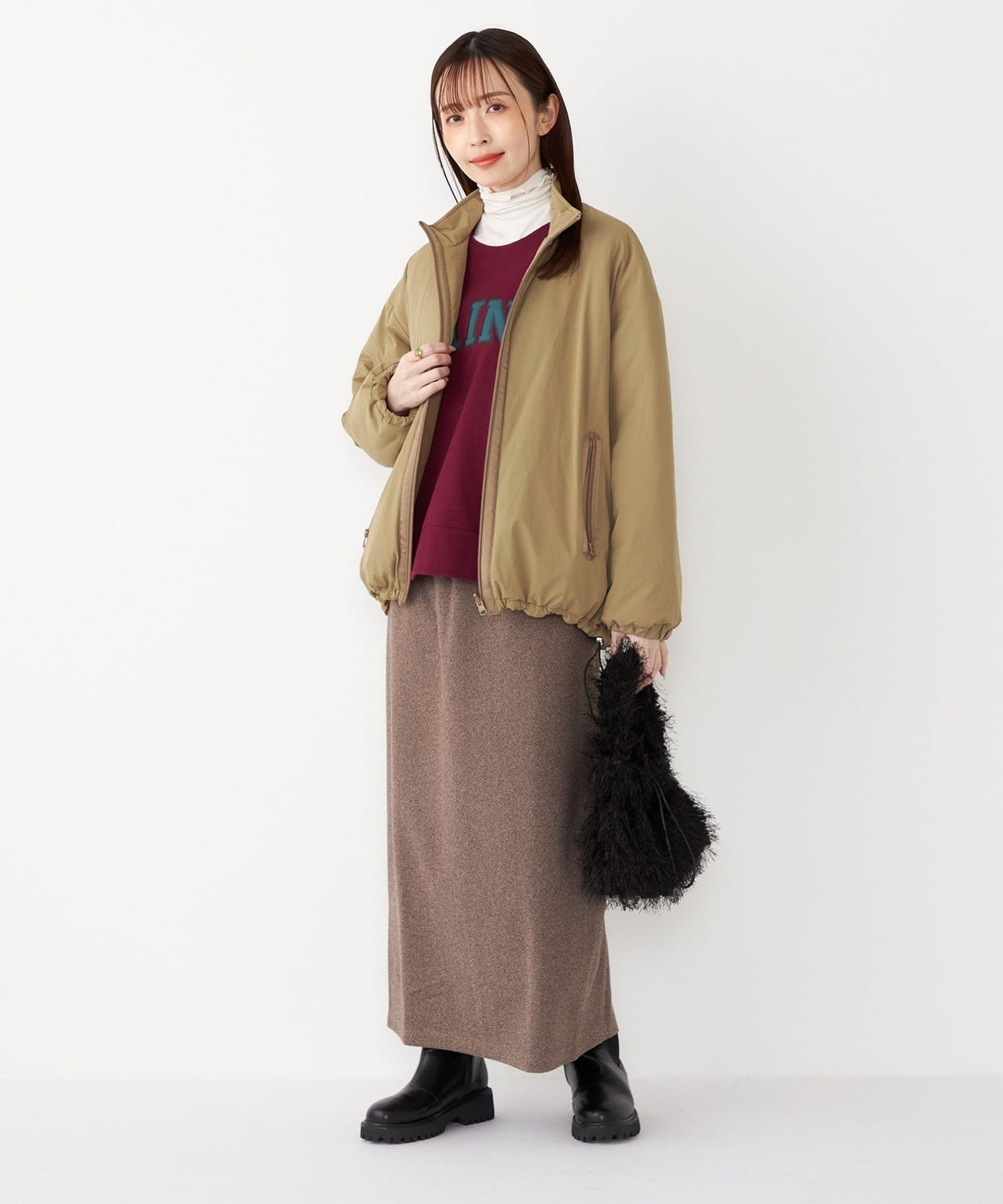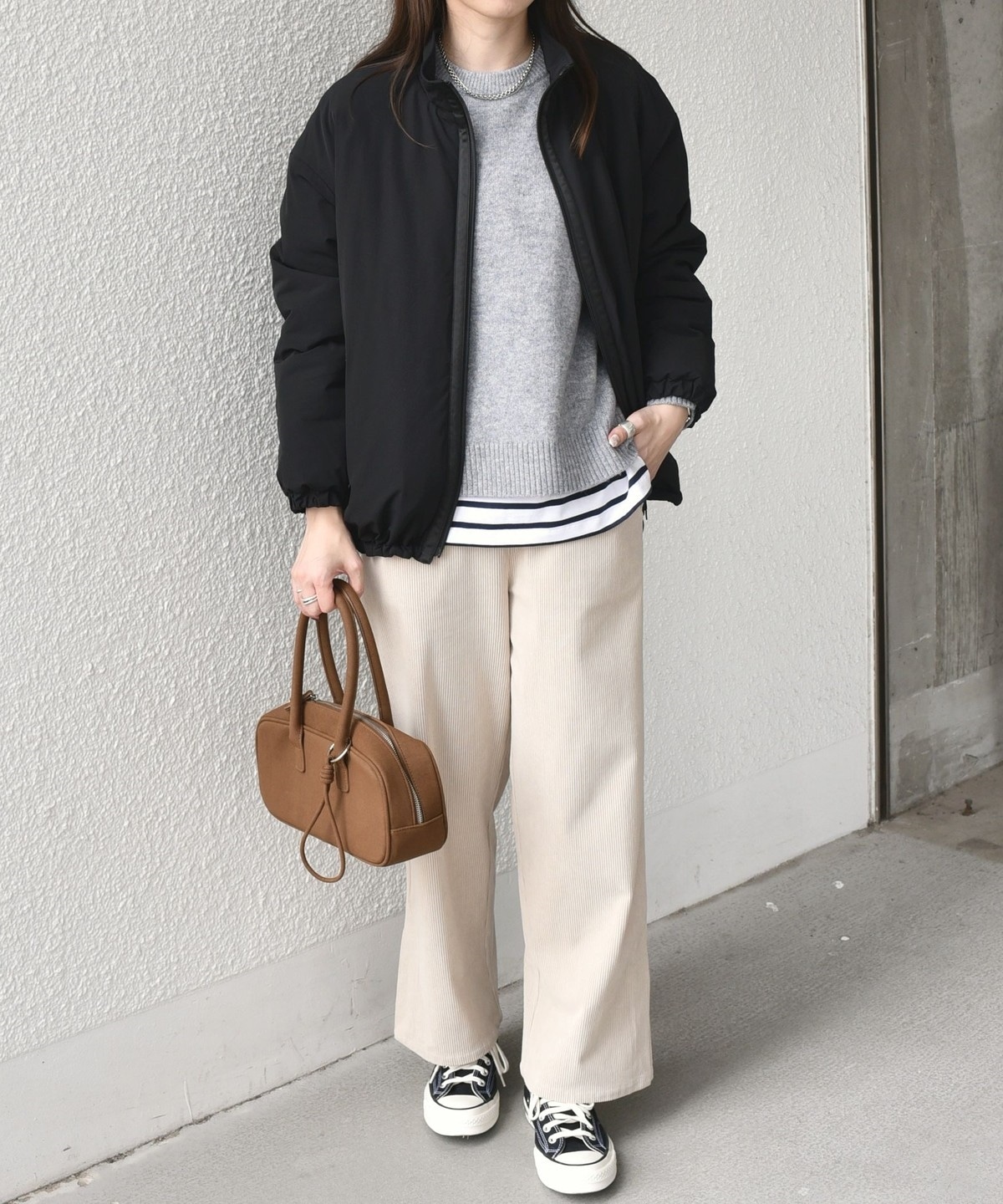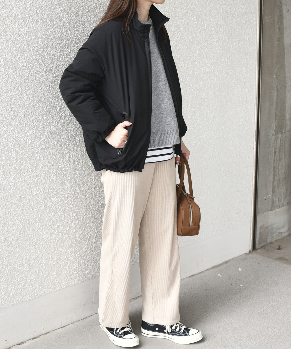 ショート丈でボトムを選ばず、ワイドパンツやスカートなどボリュームのあるアイテムとも好相性。