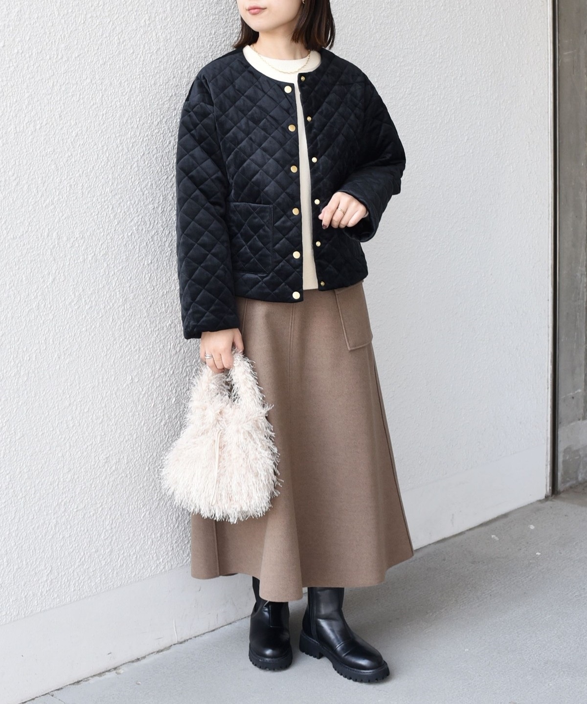 ベロア素材にキルティングを施した、華やかさと上品さを兼ね備えた中綿ジャケット。