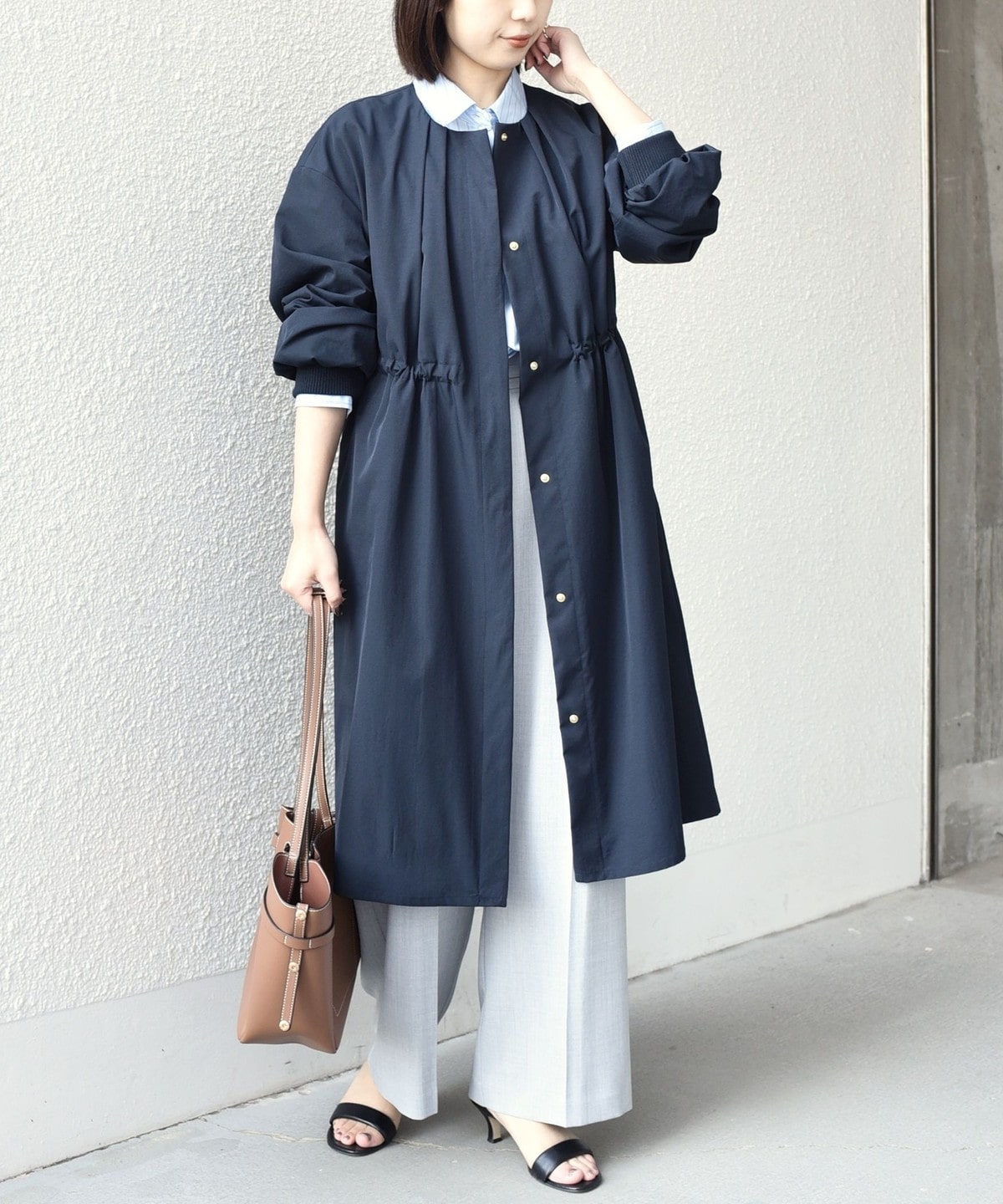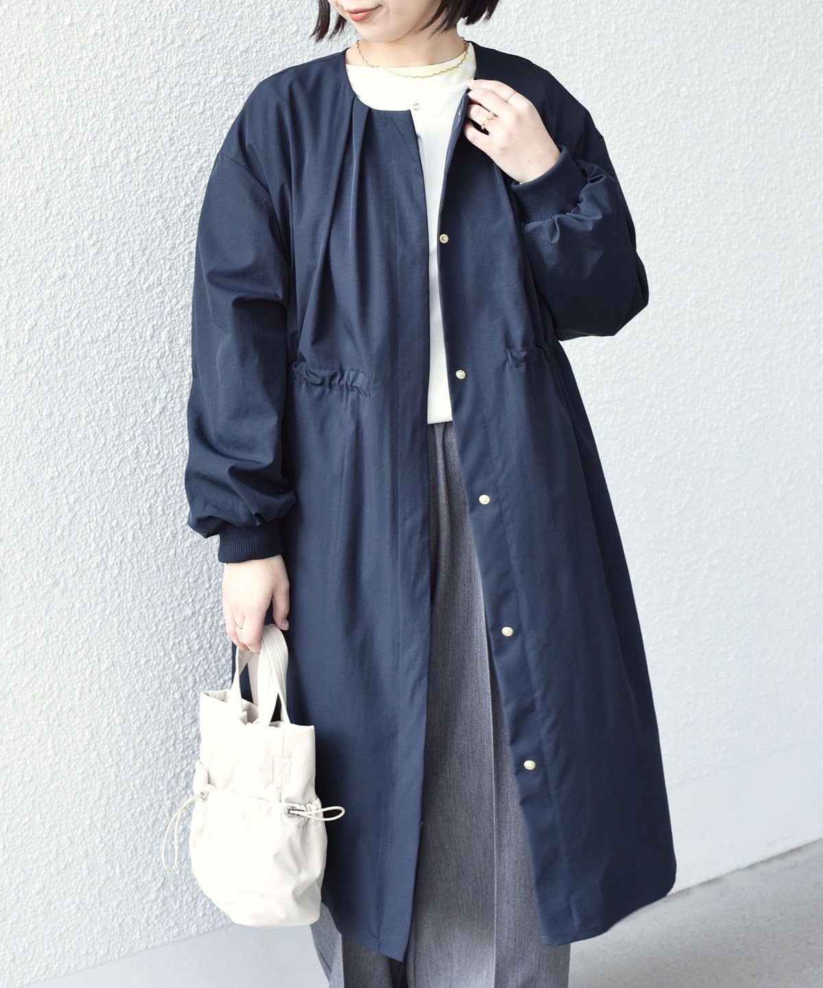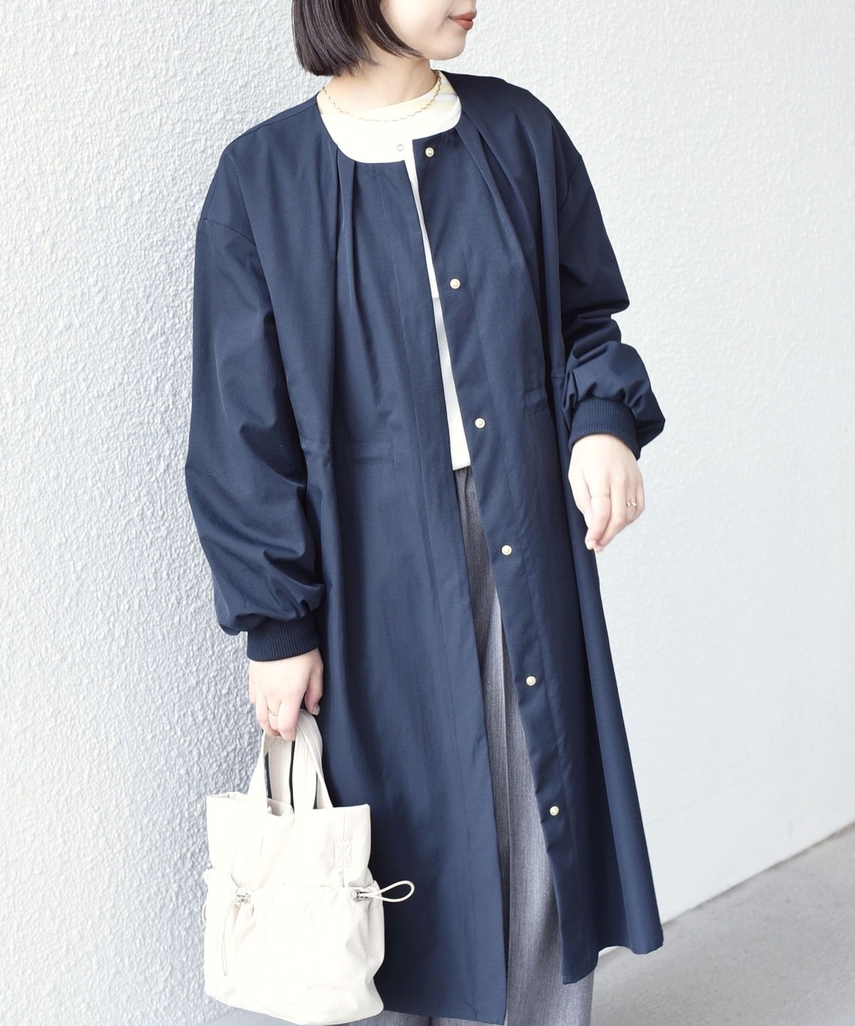 ノーカラーですっきりとした印象の軽アウター。