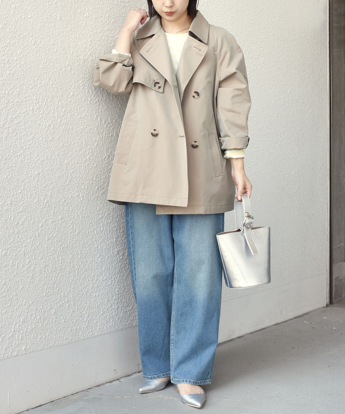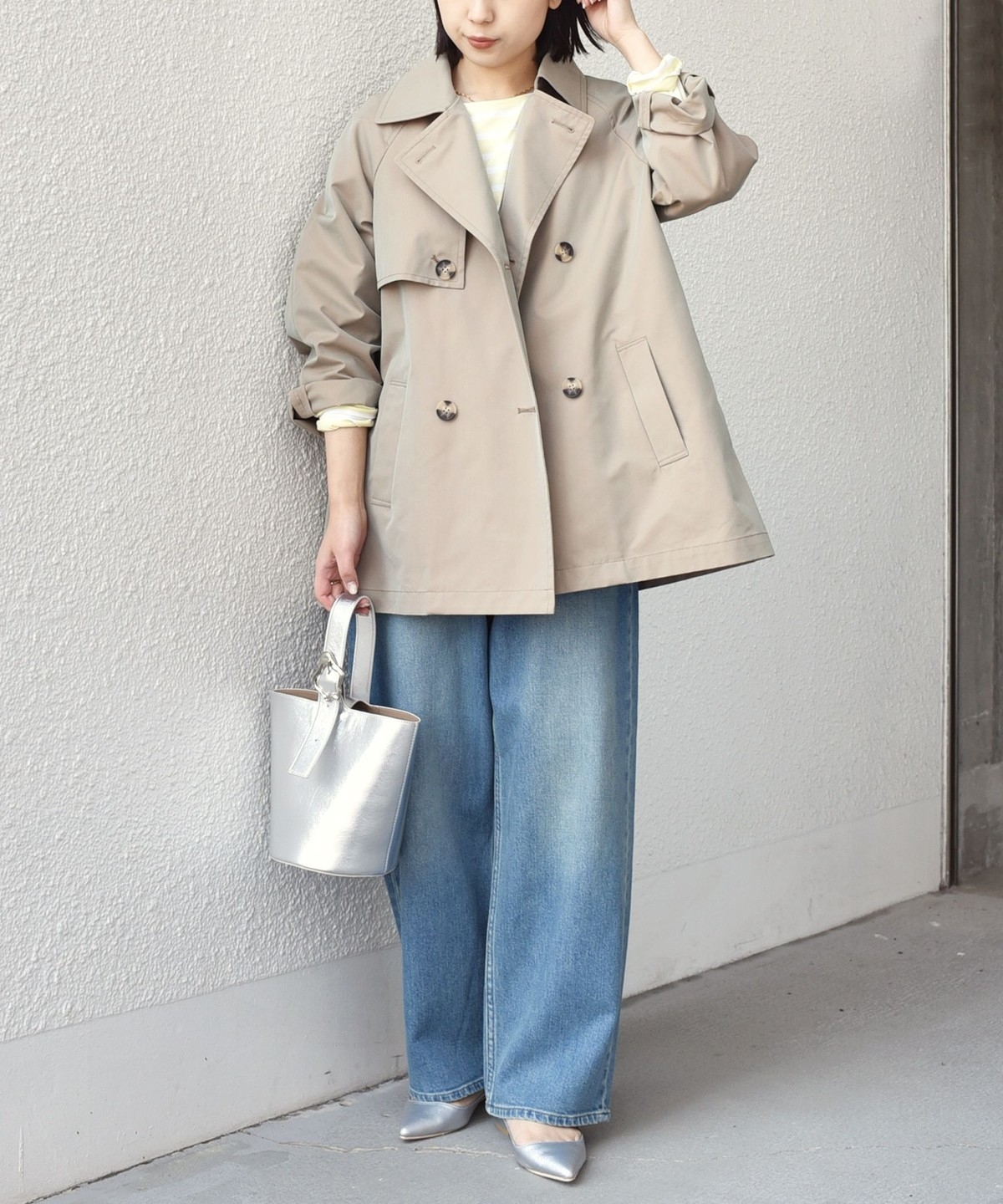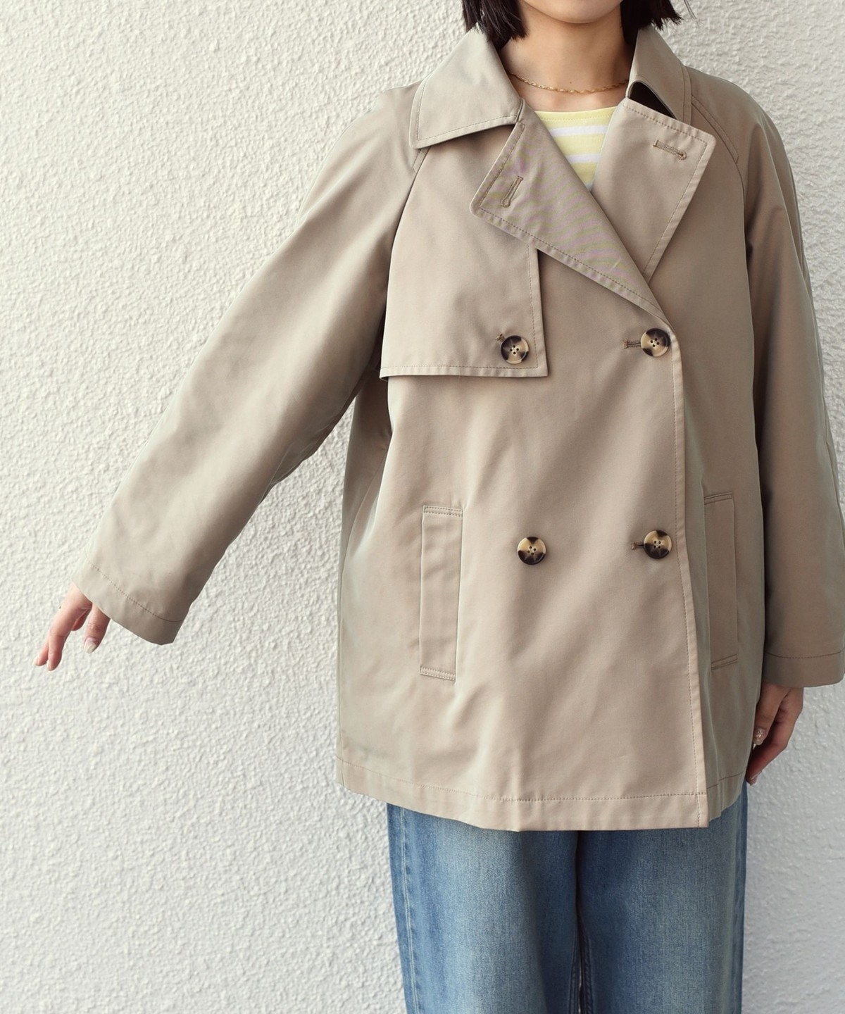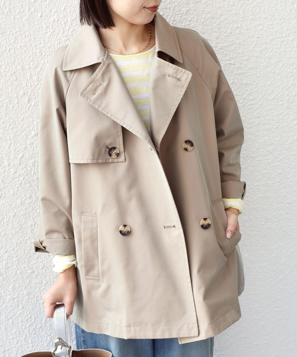 ややオーバーなシルエットで、ショート丈のトレンチコート。