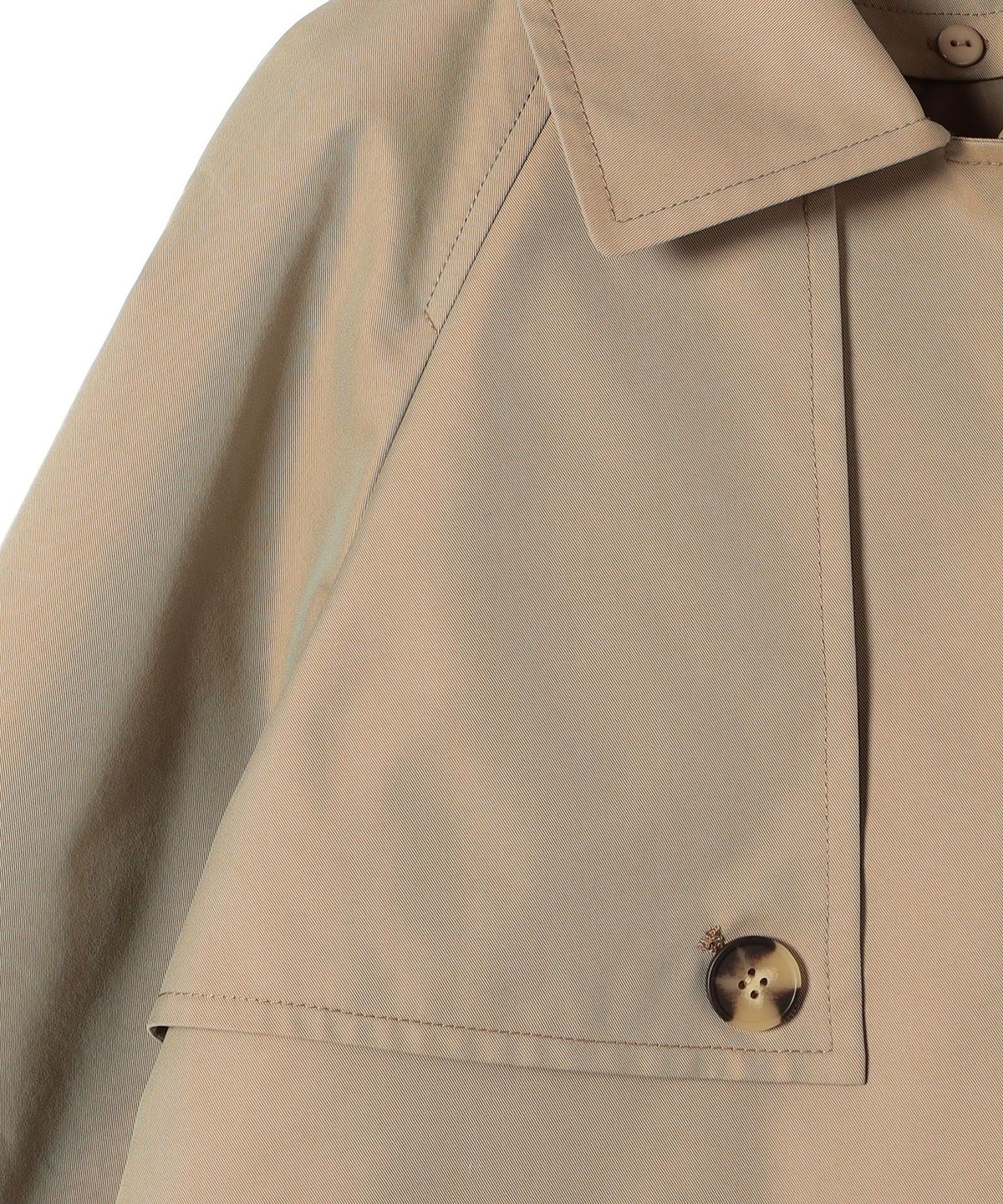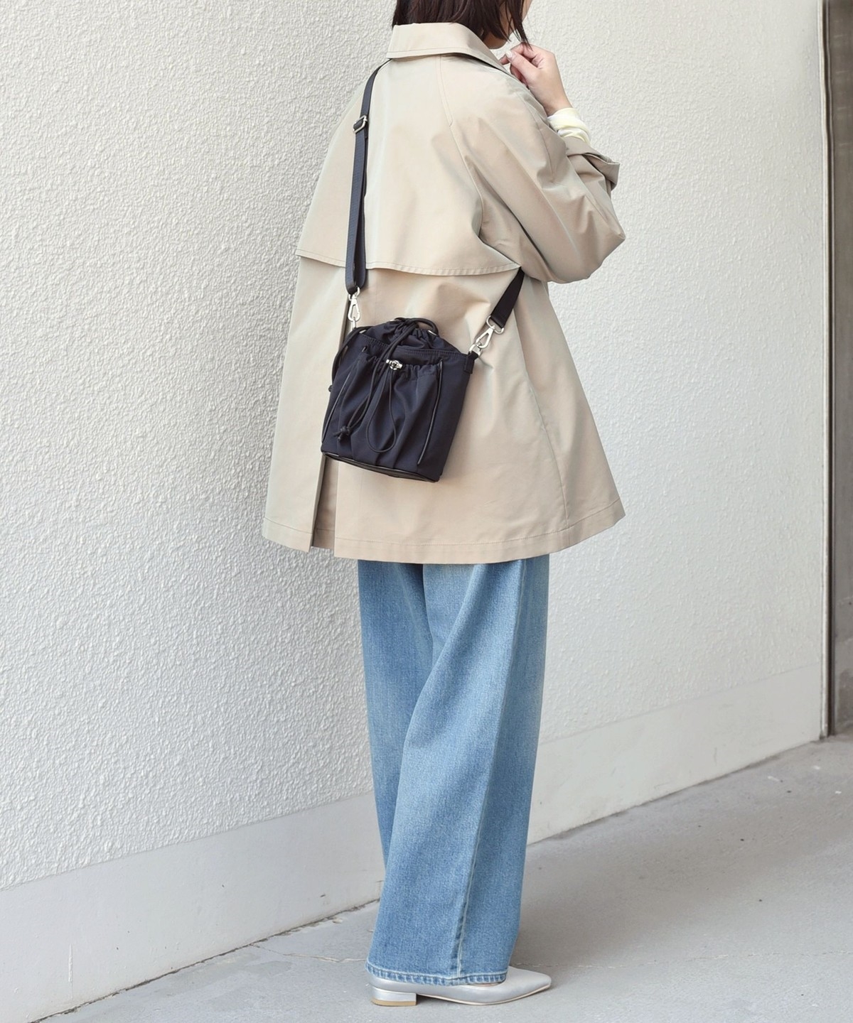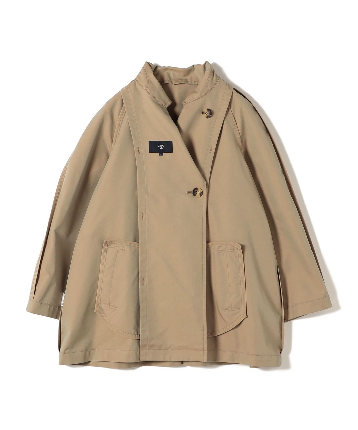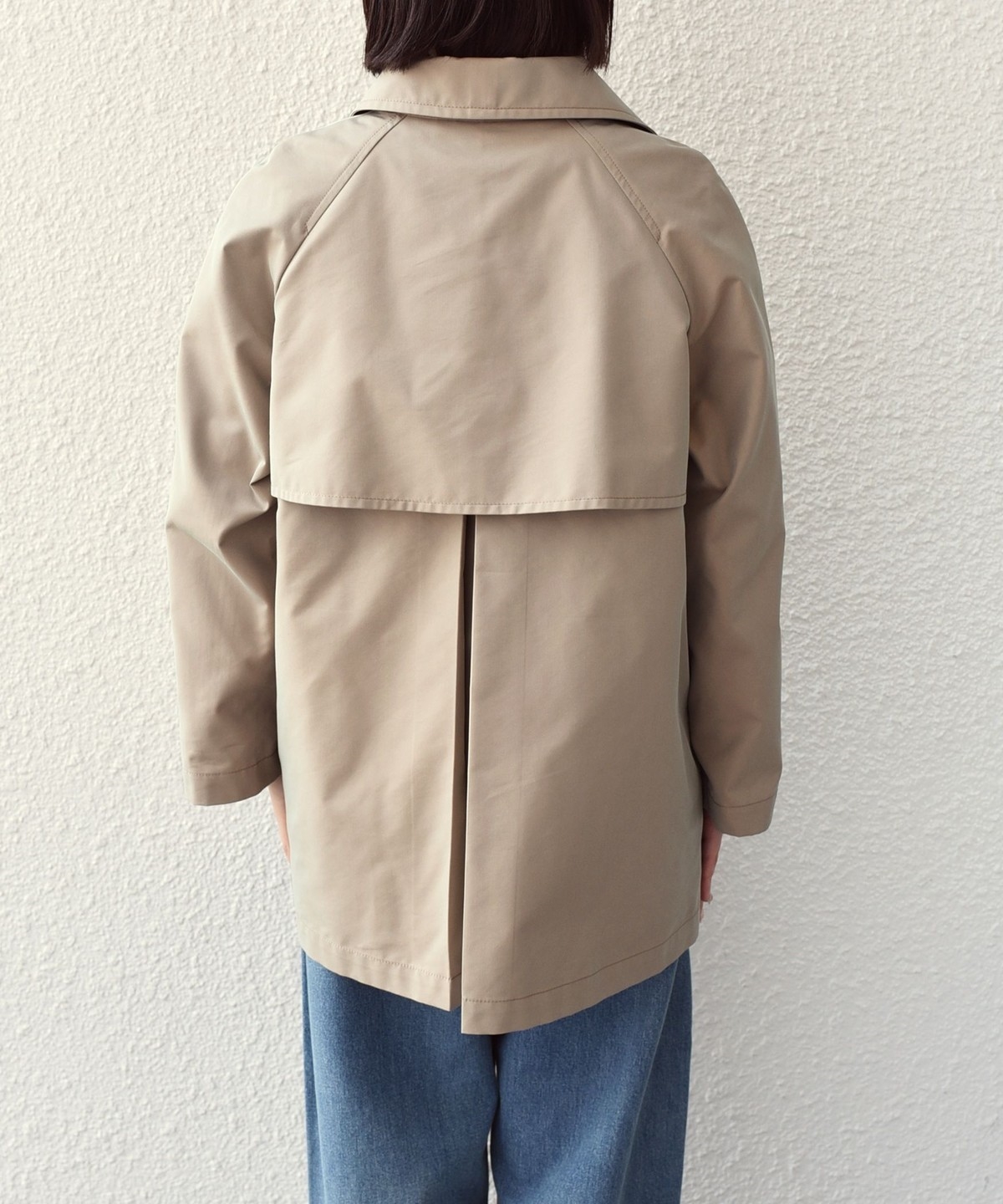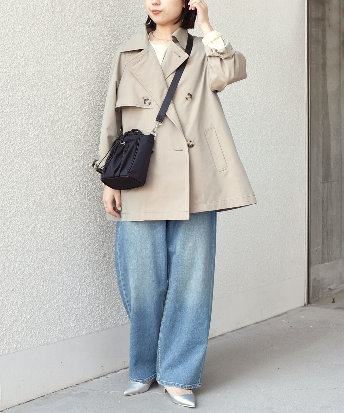 ややオーバーなシルエットで、ショート丈のトレンチコート。