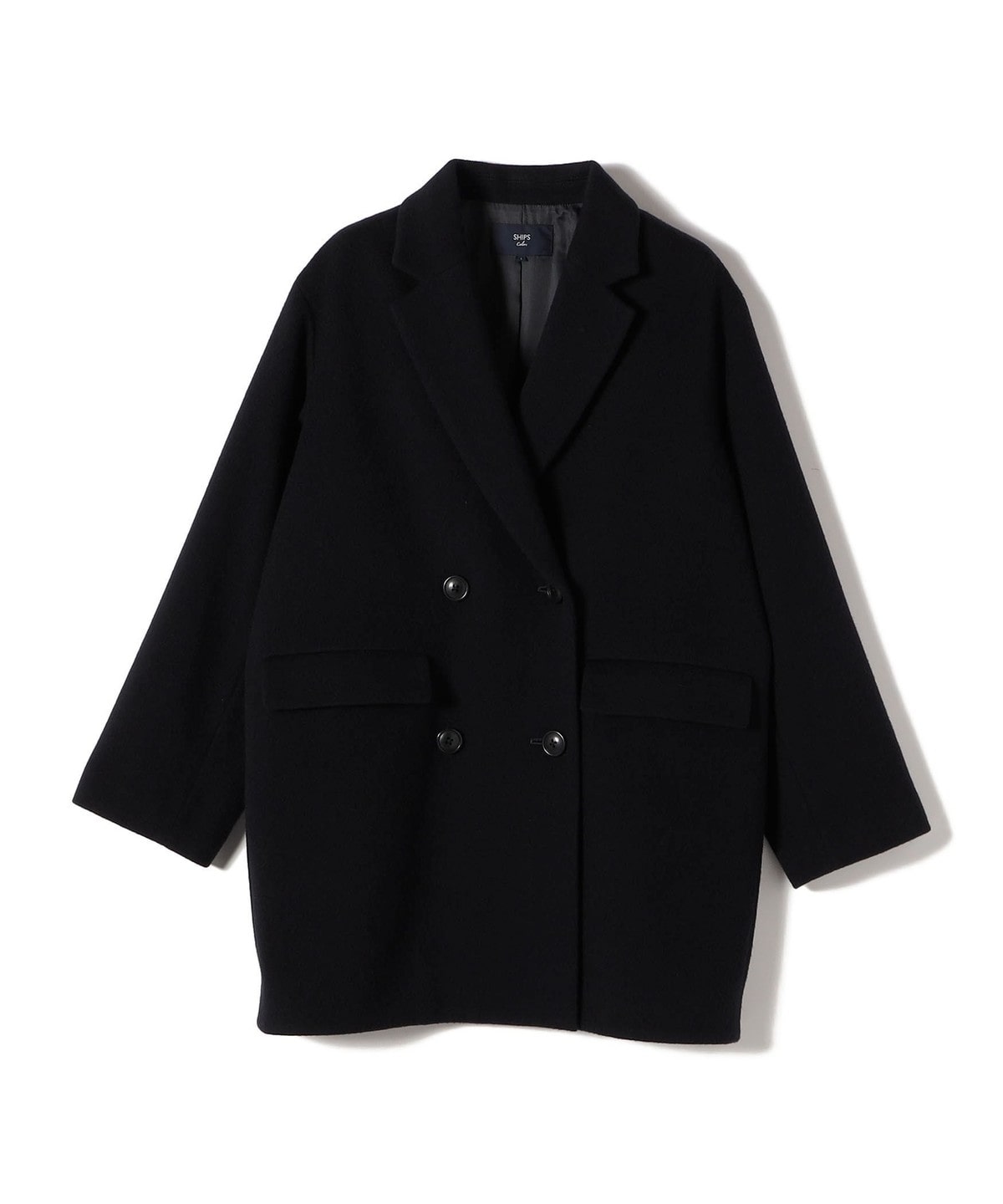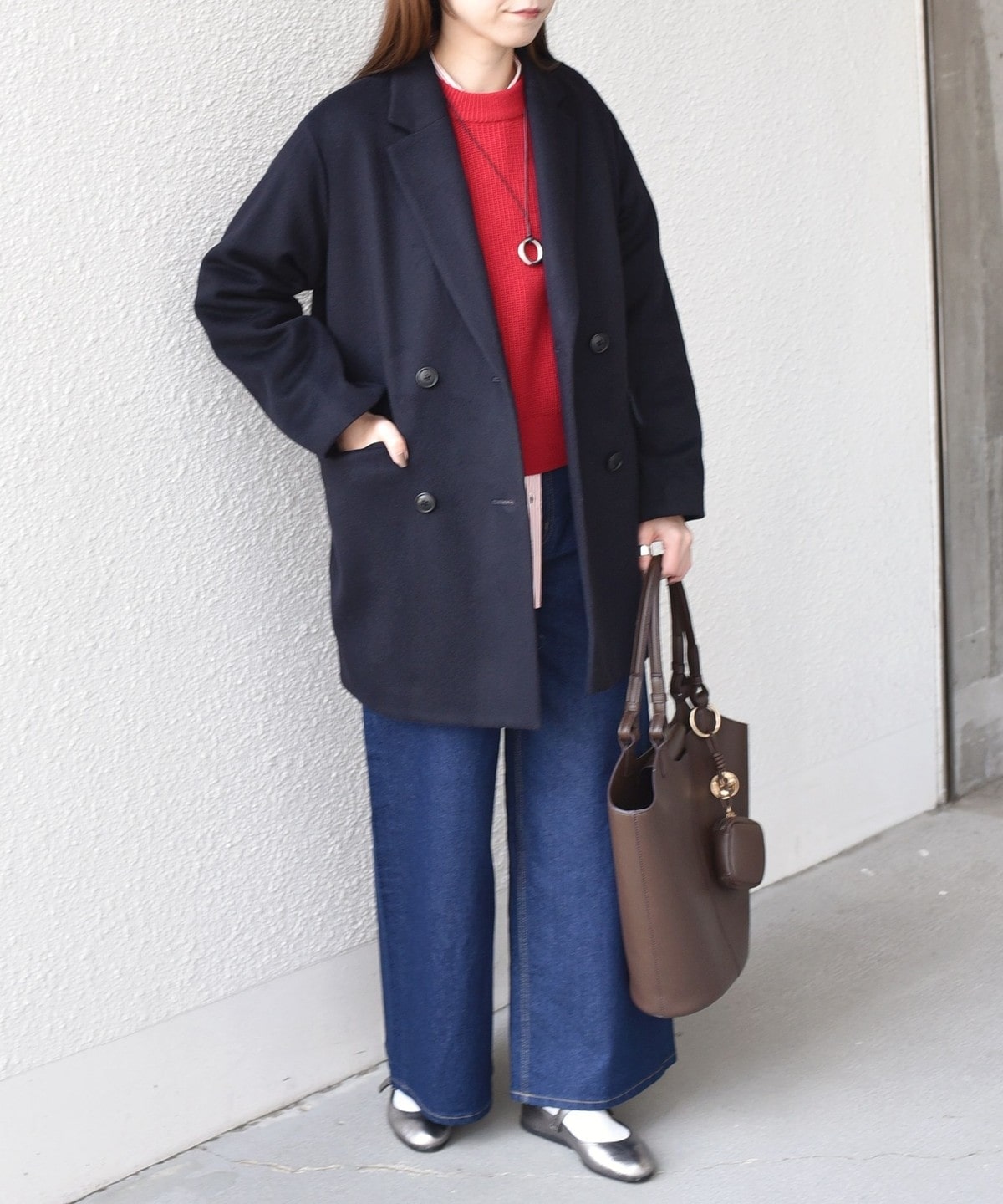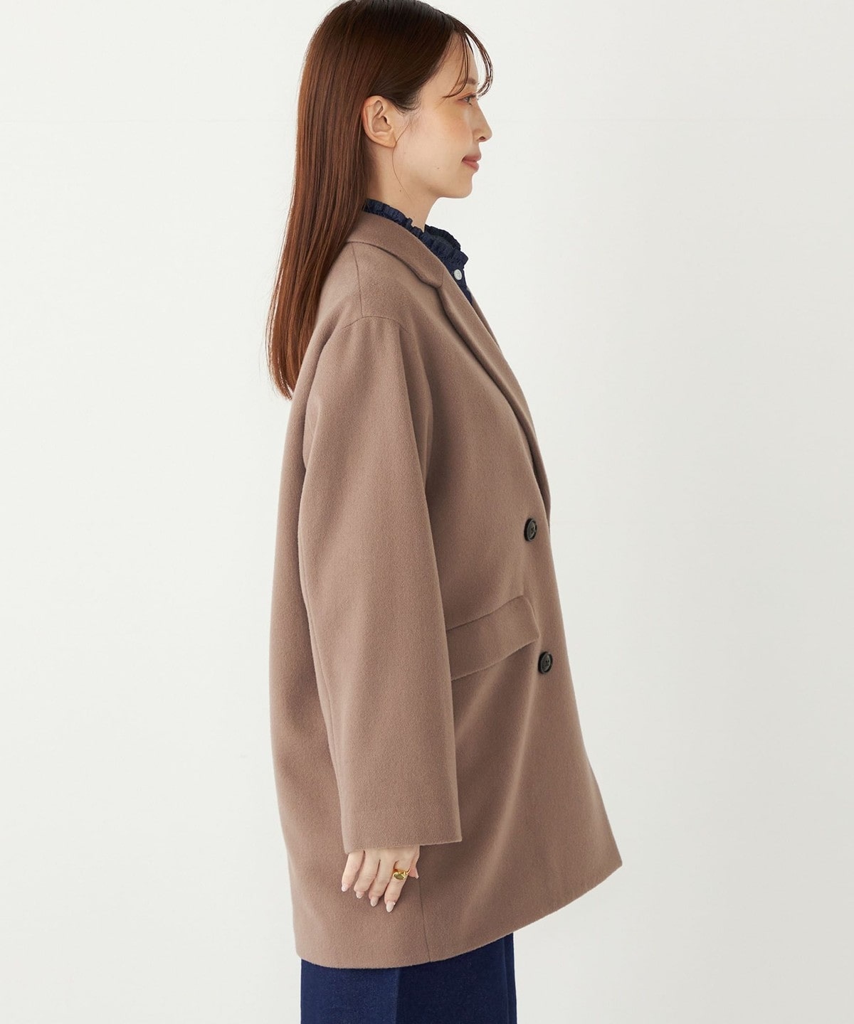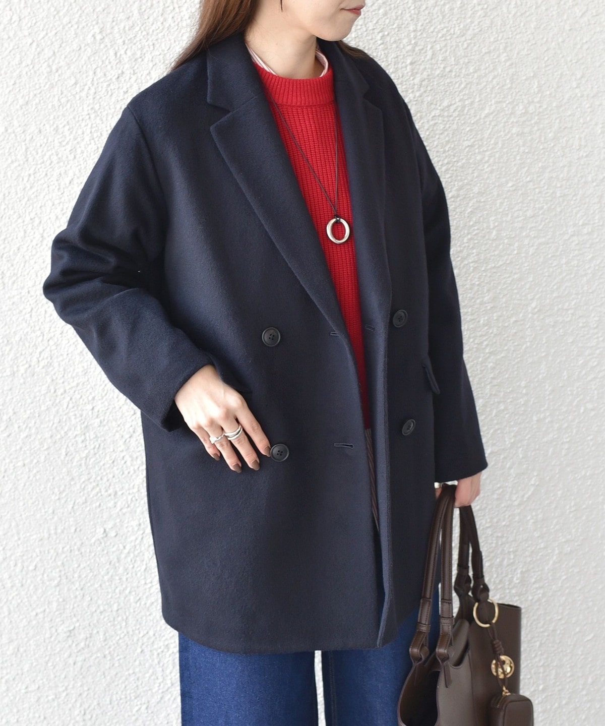 やや肩を下げたコクーンシルエットで女性らしく着こなせるテーラードコート。