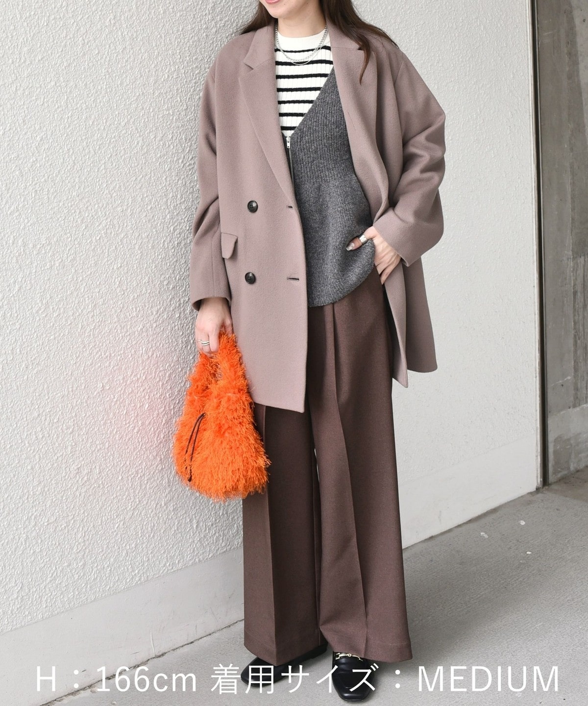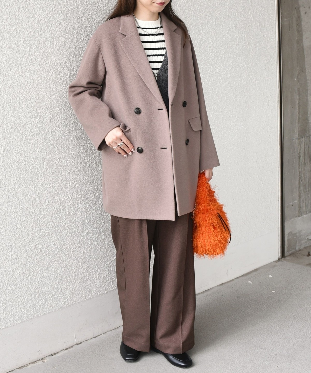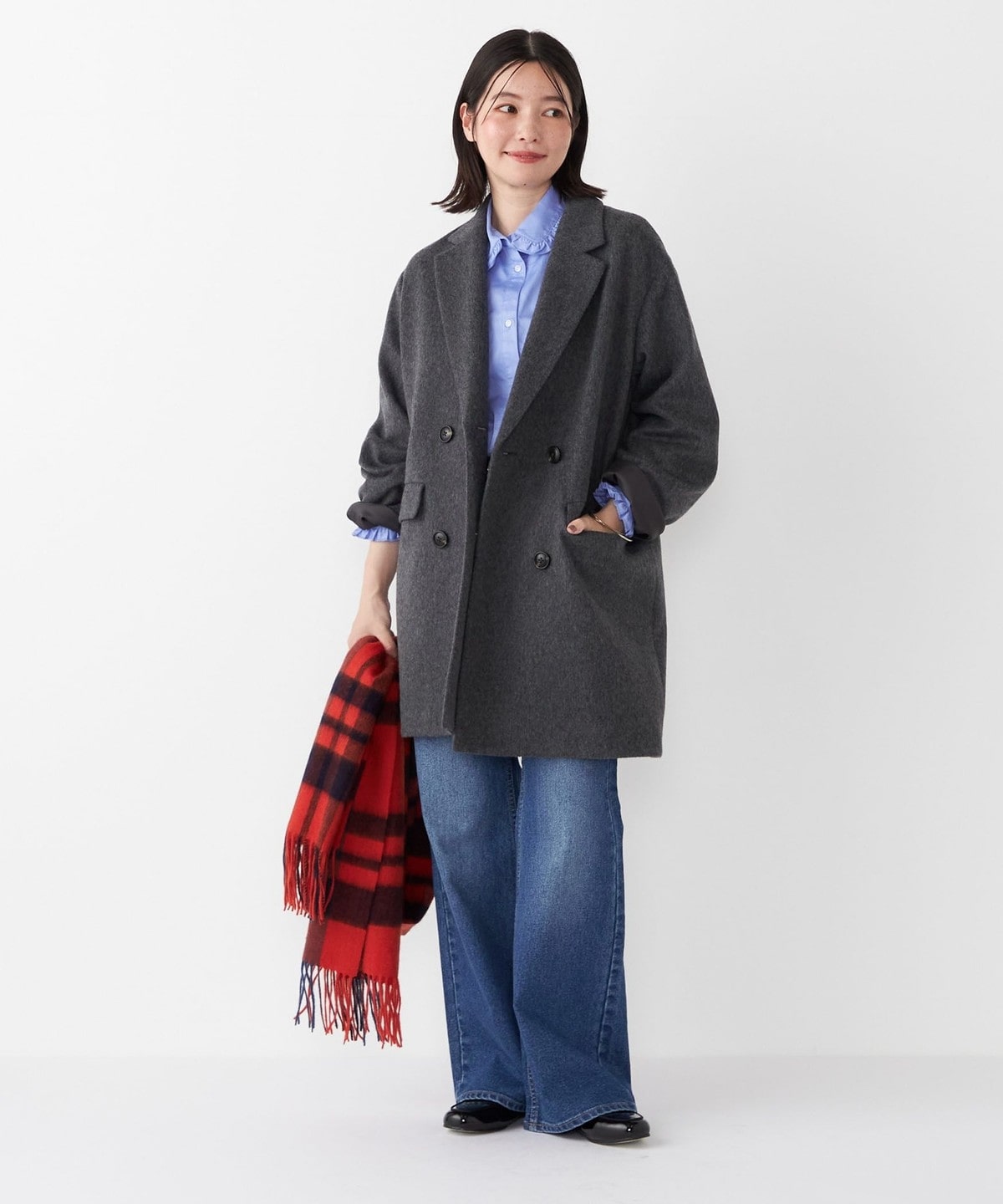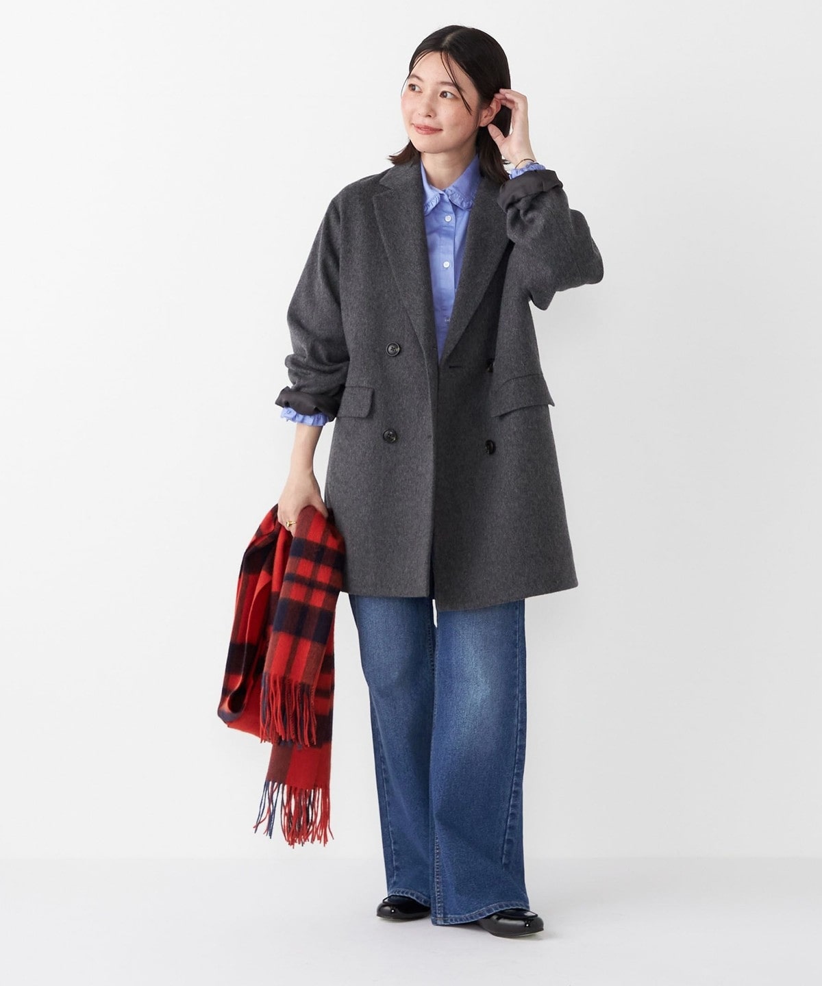 やや肩を下げたコクーンシルエットで女性らしく着こなせるテーラードコート。